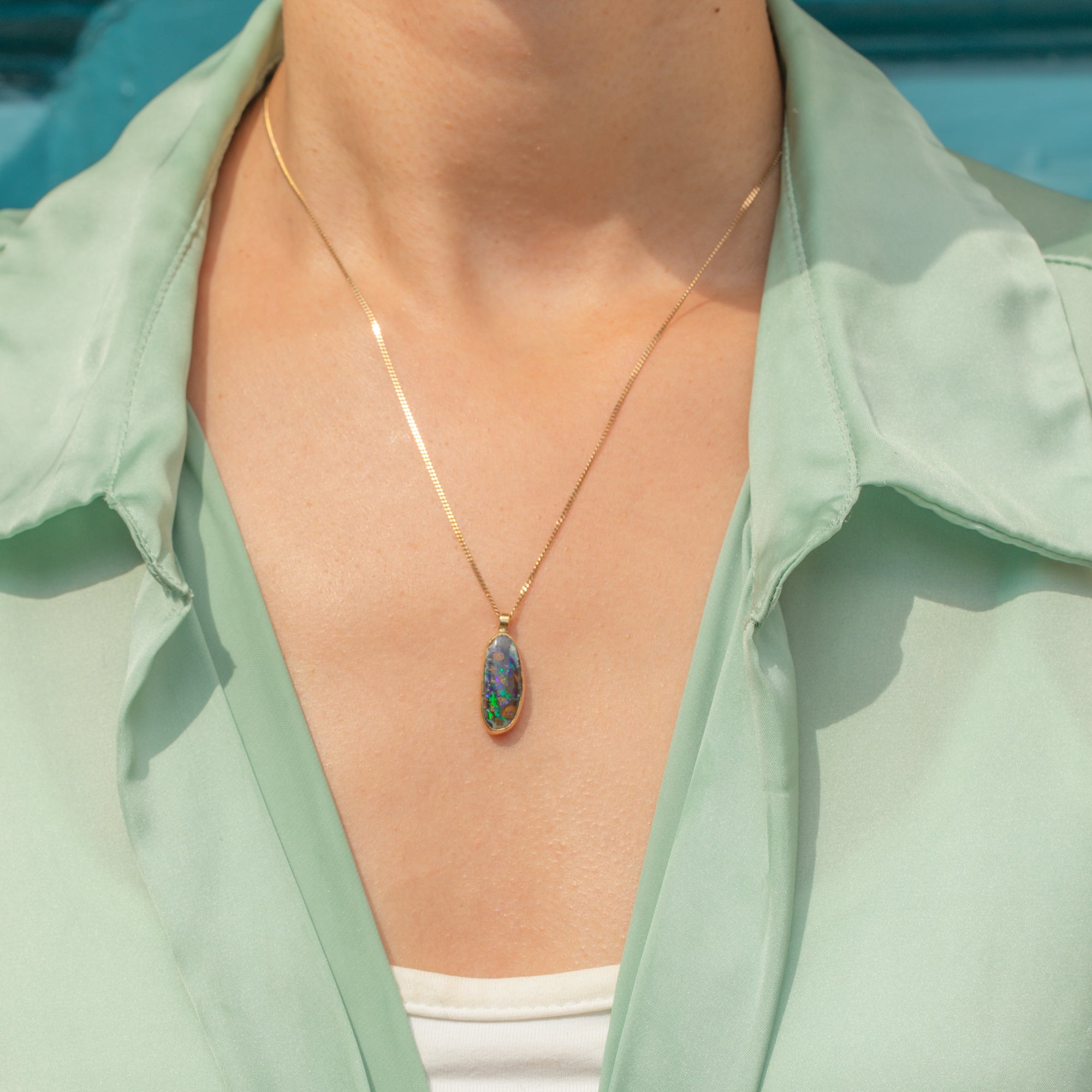The Opal’s natural earthy tones emit vivid flashes of neon green and blue when illuminated, enhanced beautifully by the rich warmth of the Gold. Simply suspend it from a fine chain, and this Victorian pendant will make a wonderful addition to your attire.