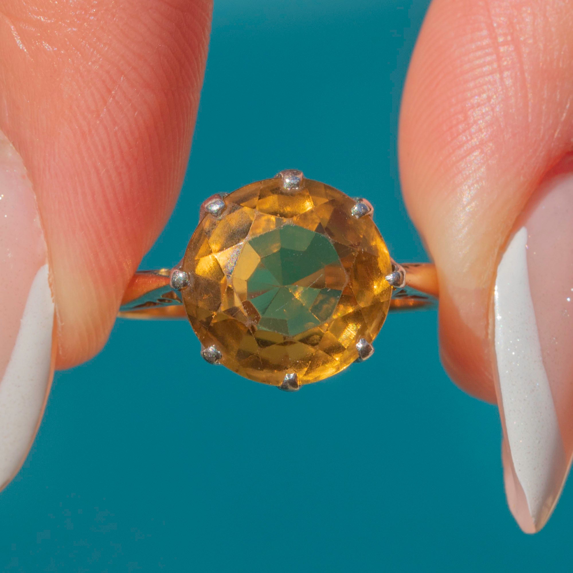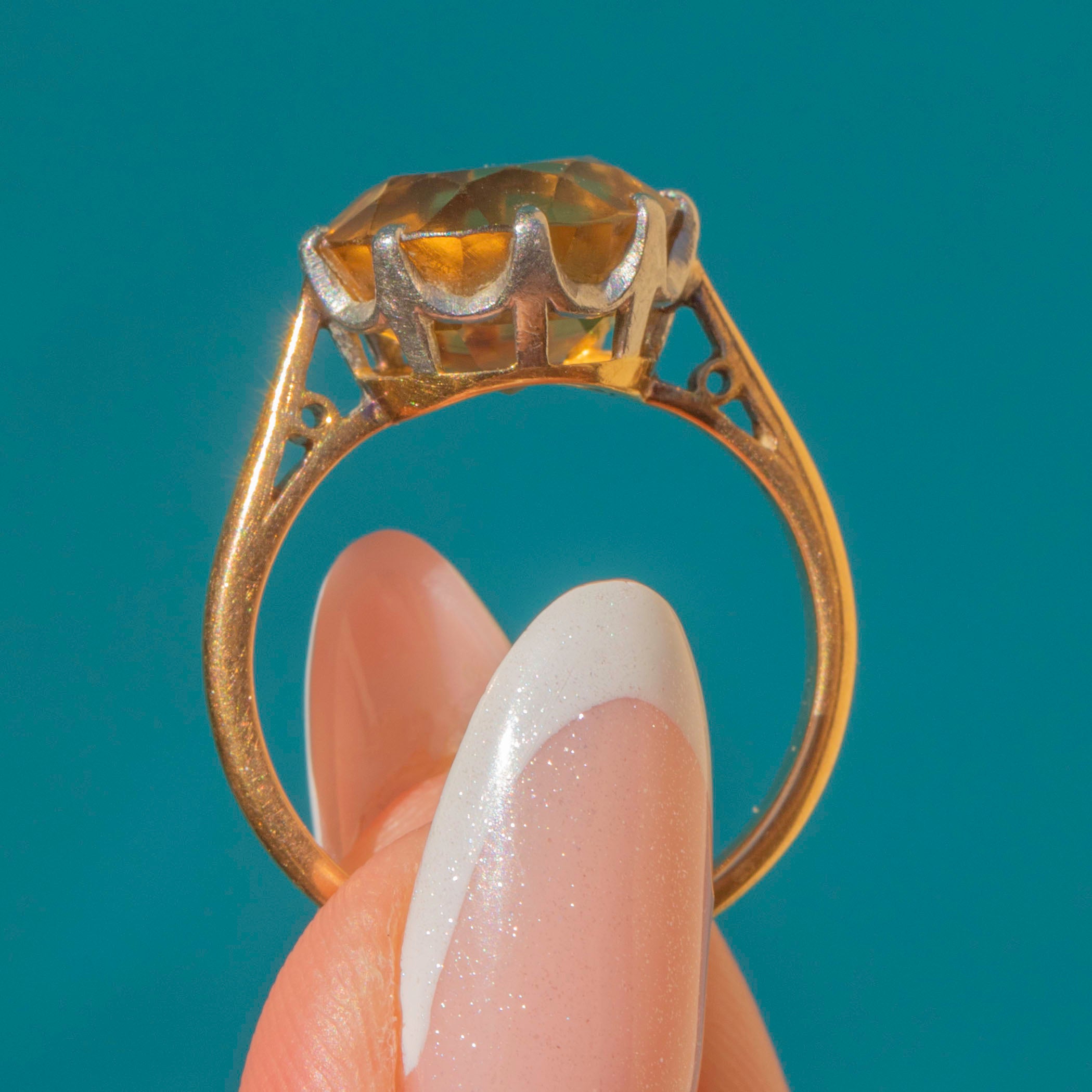 This antique 18ct Gold Citrine solitaire ring is a ray of sunshine! Her honey-hued Citrine sits proudly within gorgeously cool Platinum settings, glowing cheerfully as her crisp facets catch the light.