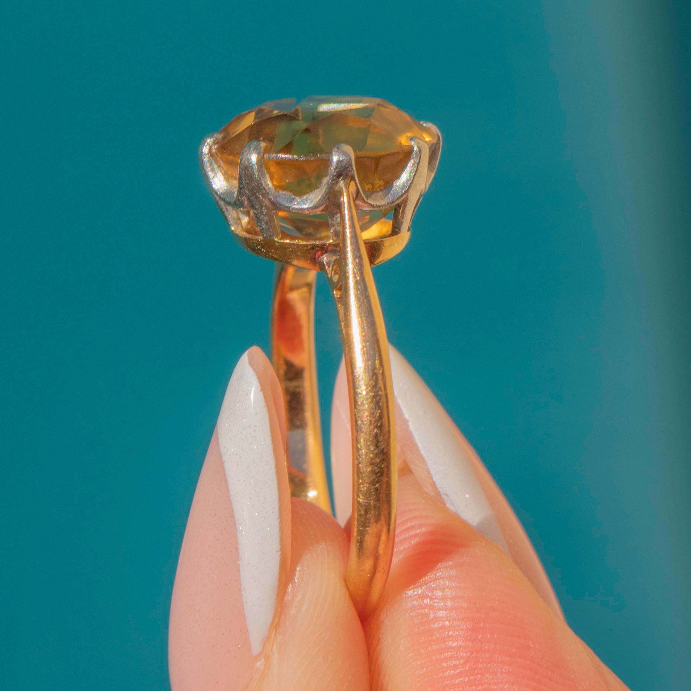VERY GOOD: This antique 18ct Gold Citrine solitaire ring is in very good condition. Her Gold is smooth and sleek, holding her Citrine securely, and the Citrine has a crisp set of facets and is completely free from any chips or scuffs. There is a resize mark on her back but this is minor and doesn't impact the overall look of the ring!