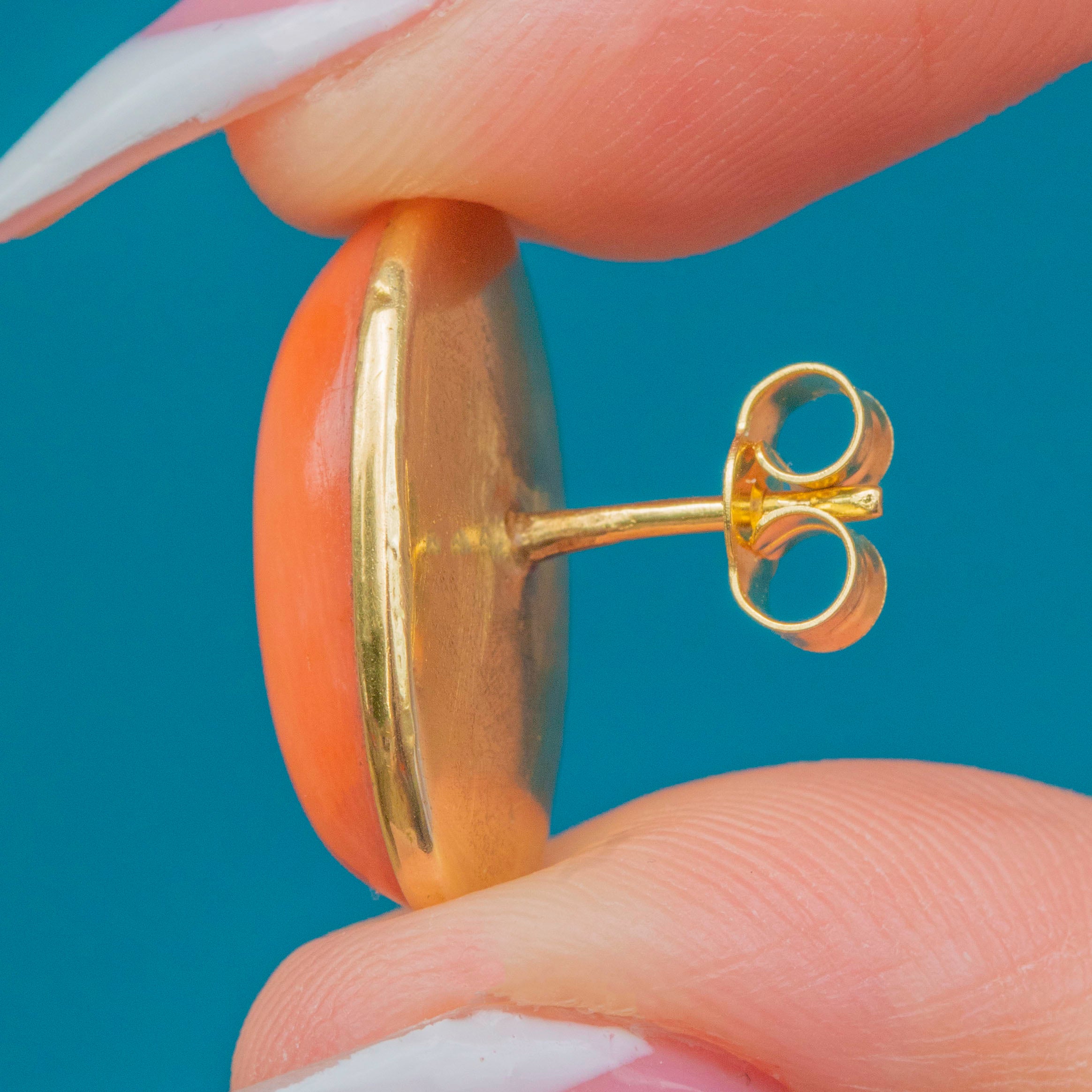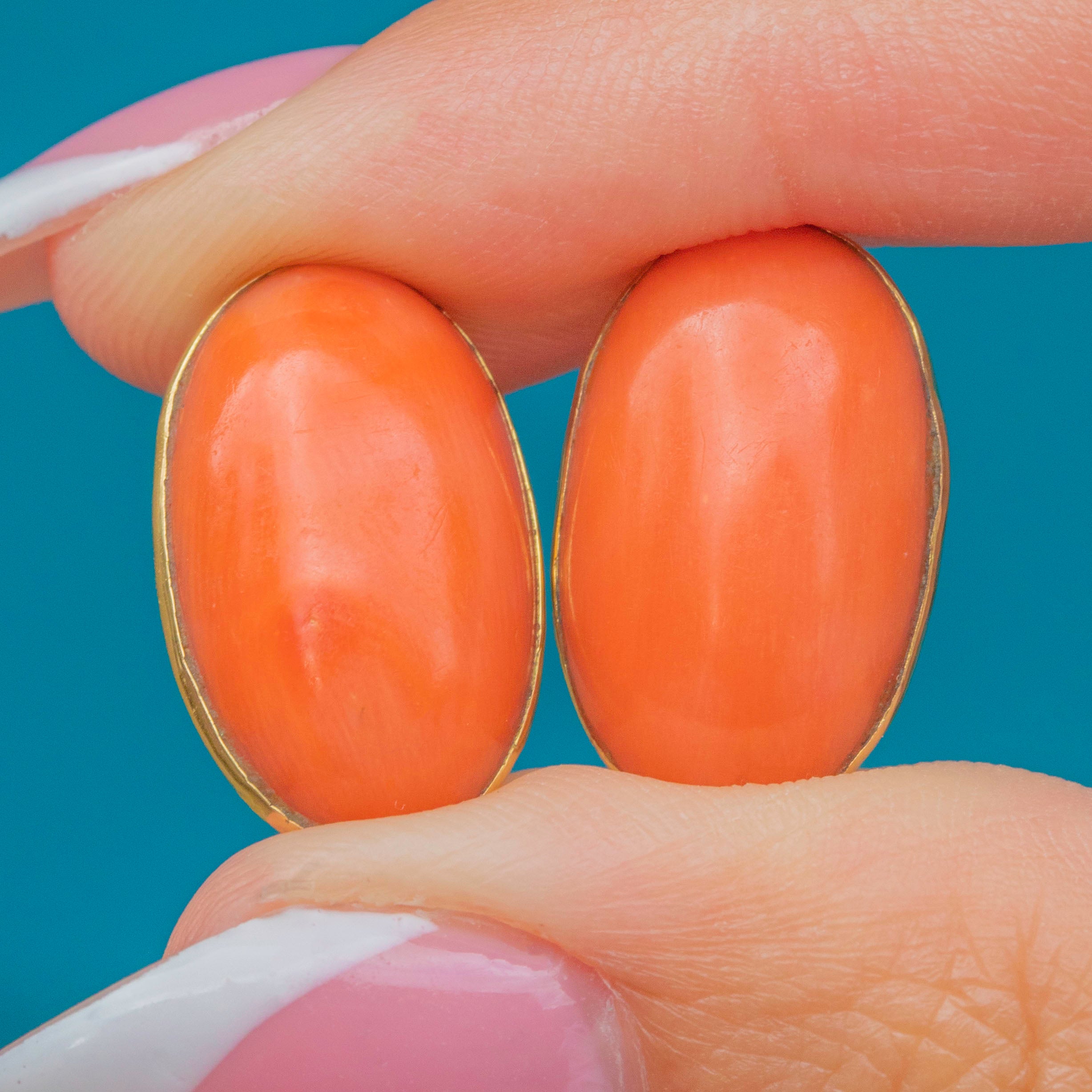 EXCELLENT: The rich orange Coral cabochons are smooth, polished, and free from chips or cracks. The bezel settings securely hold the stones and exhibit a warm, well-preserved yellow gold tone with minimal surface wear. The earrings maintain their classic shape and show no signs of repair or damage.