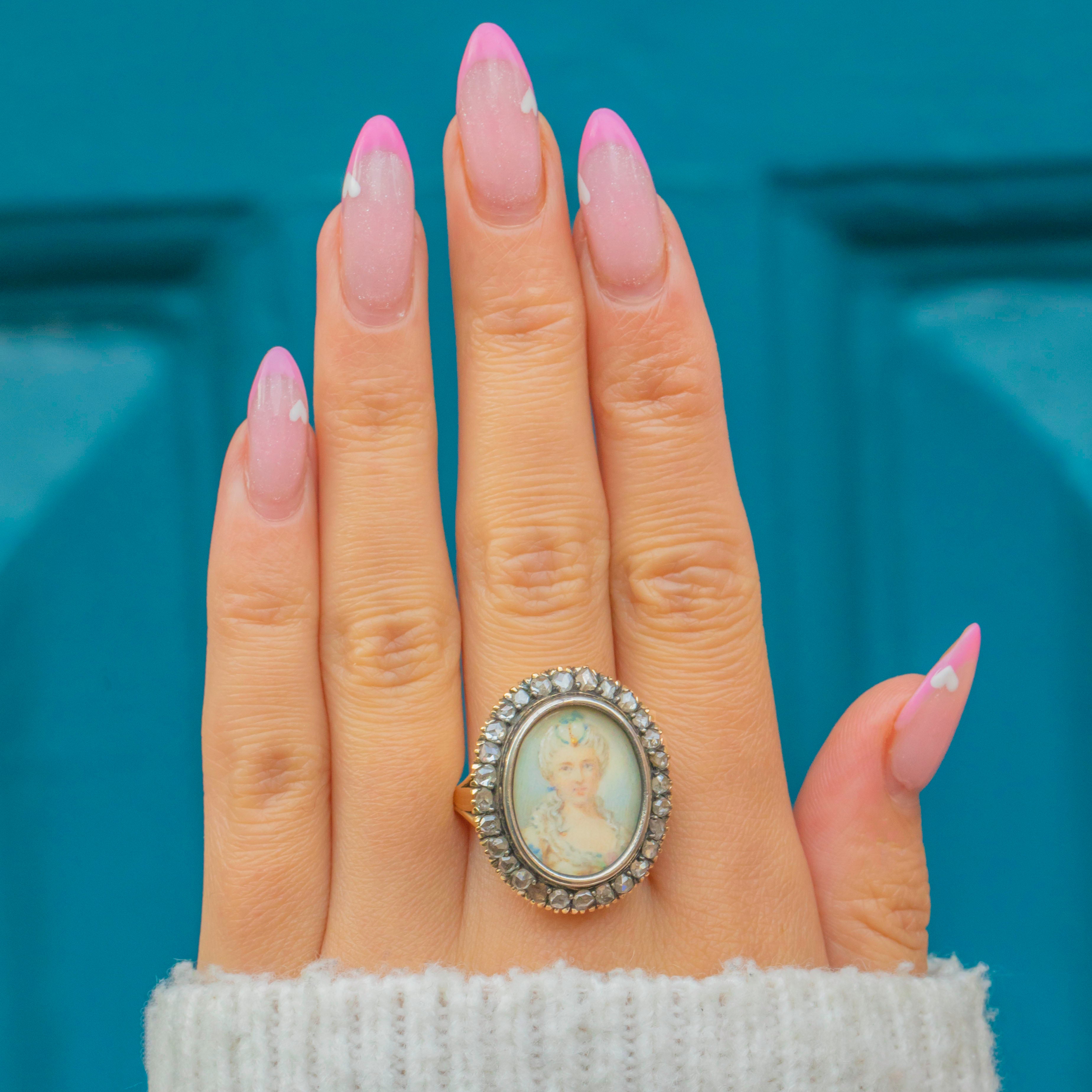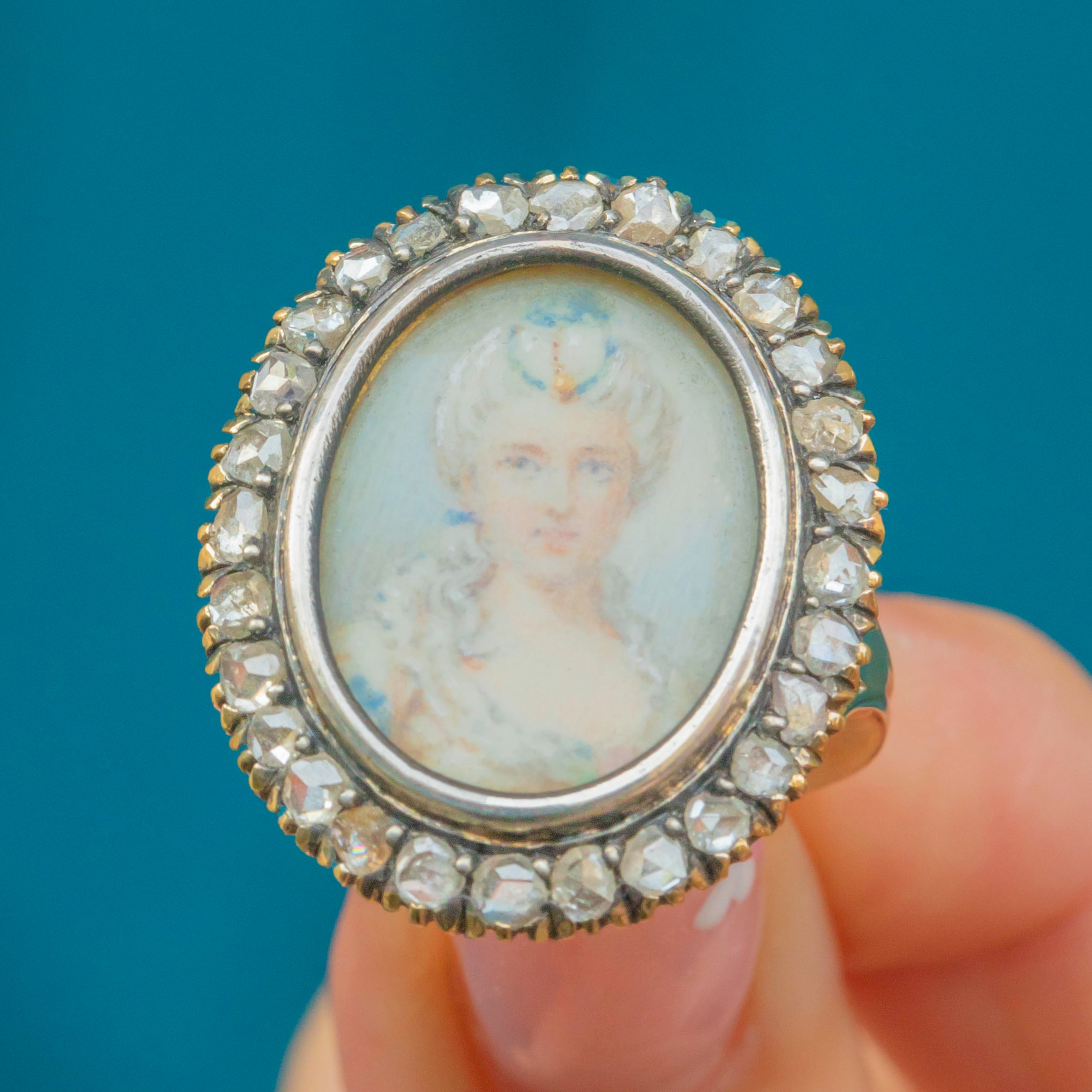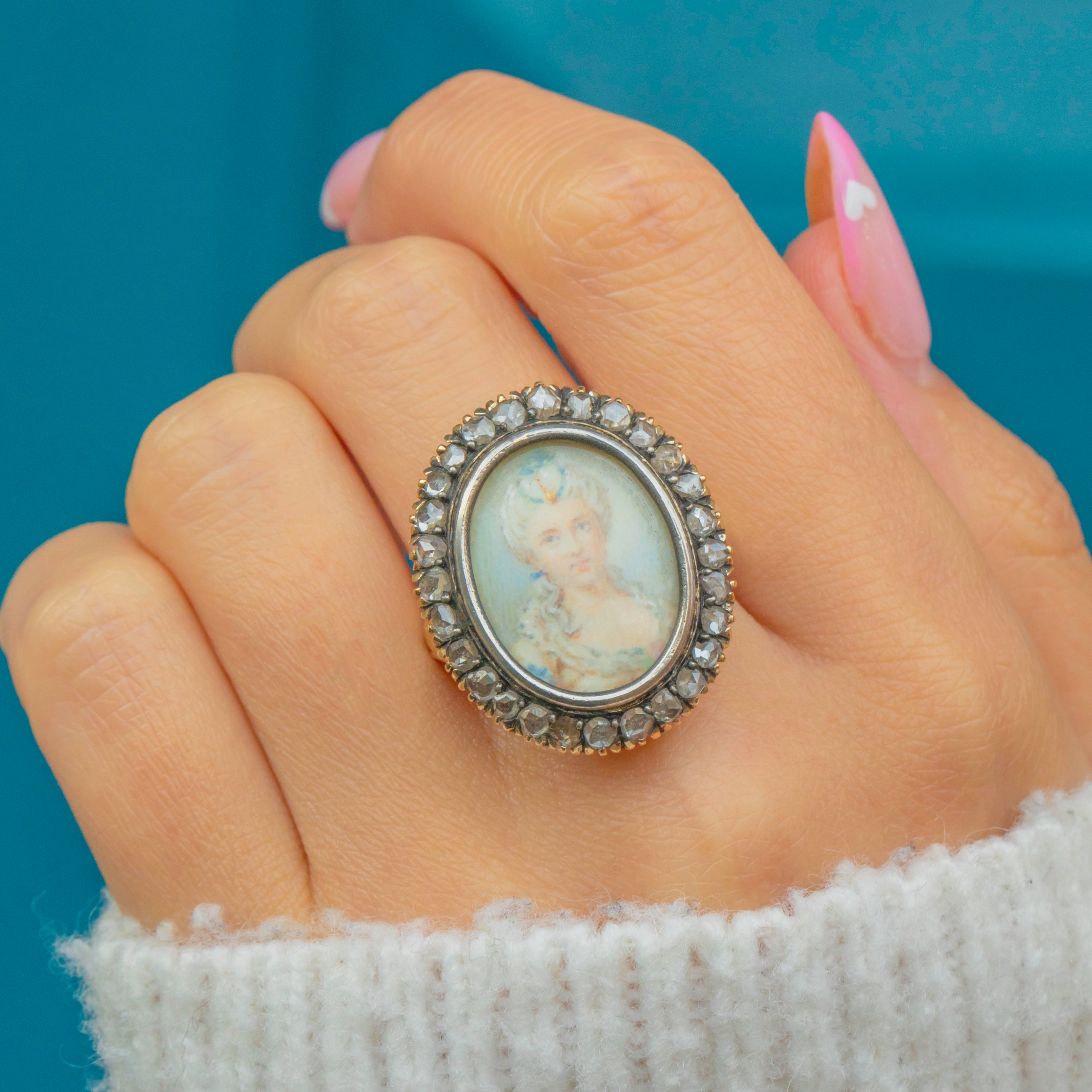 This exquisite antique 18ct Gold Diamond miniature portrait ring is a uniquely European treasure- mostly likely Italian or possibly French! Showcasing an elegant lady with impeccably styled hair and Georgian Pompadour style attire, framed by a dazzling spread of rose-cut Diamonds set in 18ct Gold.
