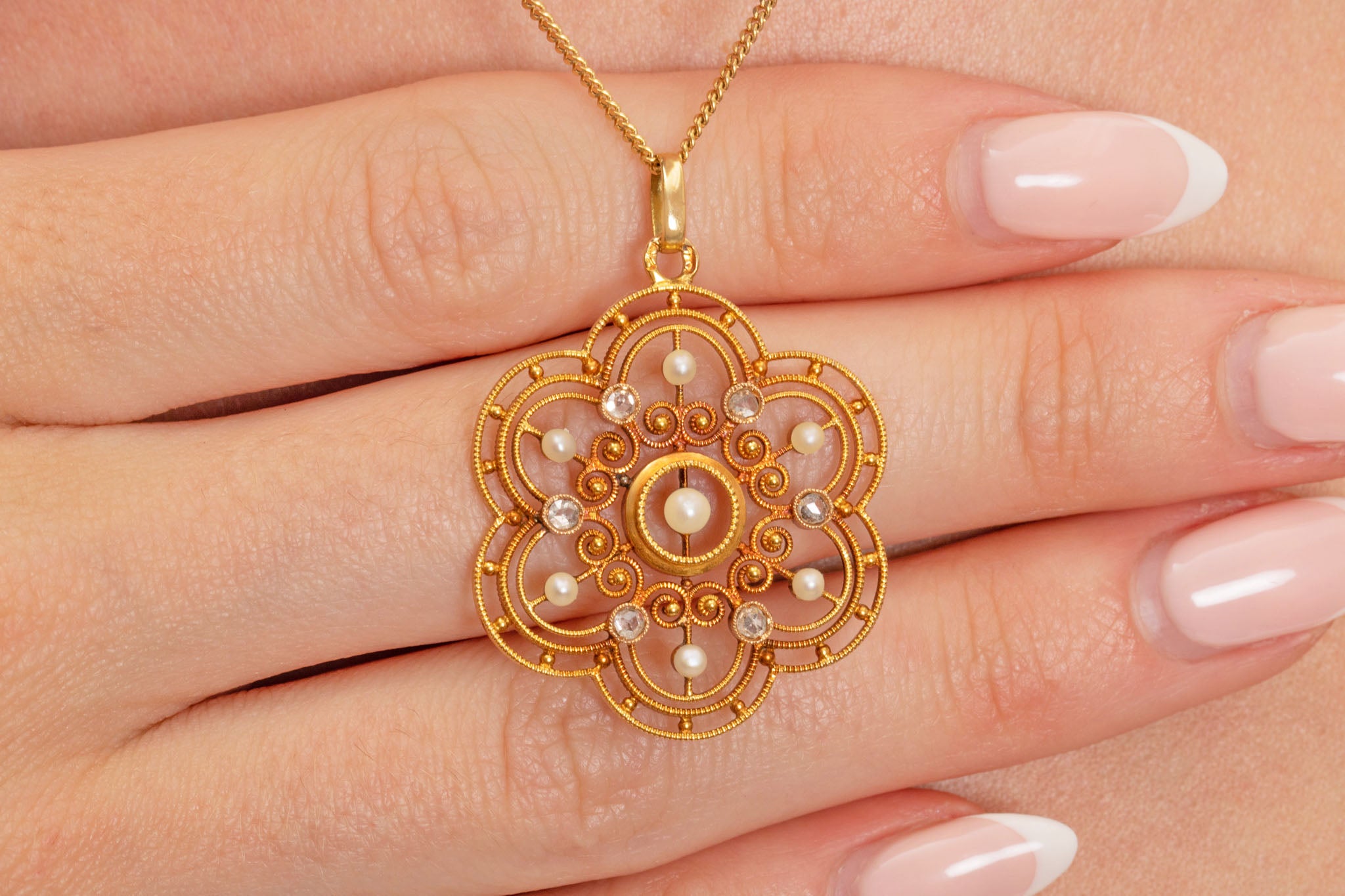 VERY GOOD. This antique 18ct Gold Diamond Pearl 'flower' pendant is in very good condition. Each of her Pearls and Diamonds are secure in their settings, adding a lovely extra touch of glamour. There is a crack running down the centre of one of her Diamonds and a few fleabites on a couple of the others, but this is only noticeable under close inspection. Her 18ct Gold looks gorgeous throughout and has retained an amazing shape. A Victorian pendant bursting with character, you don't want to miss out!