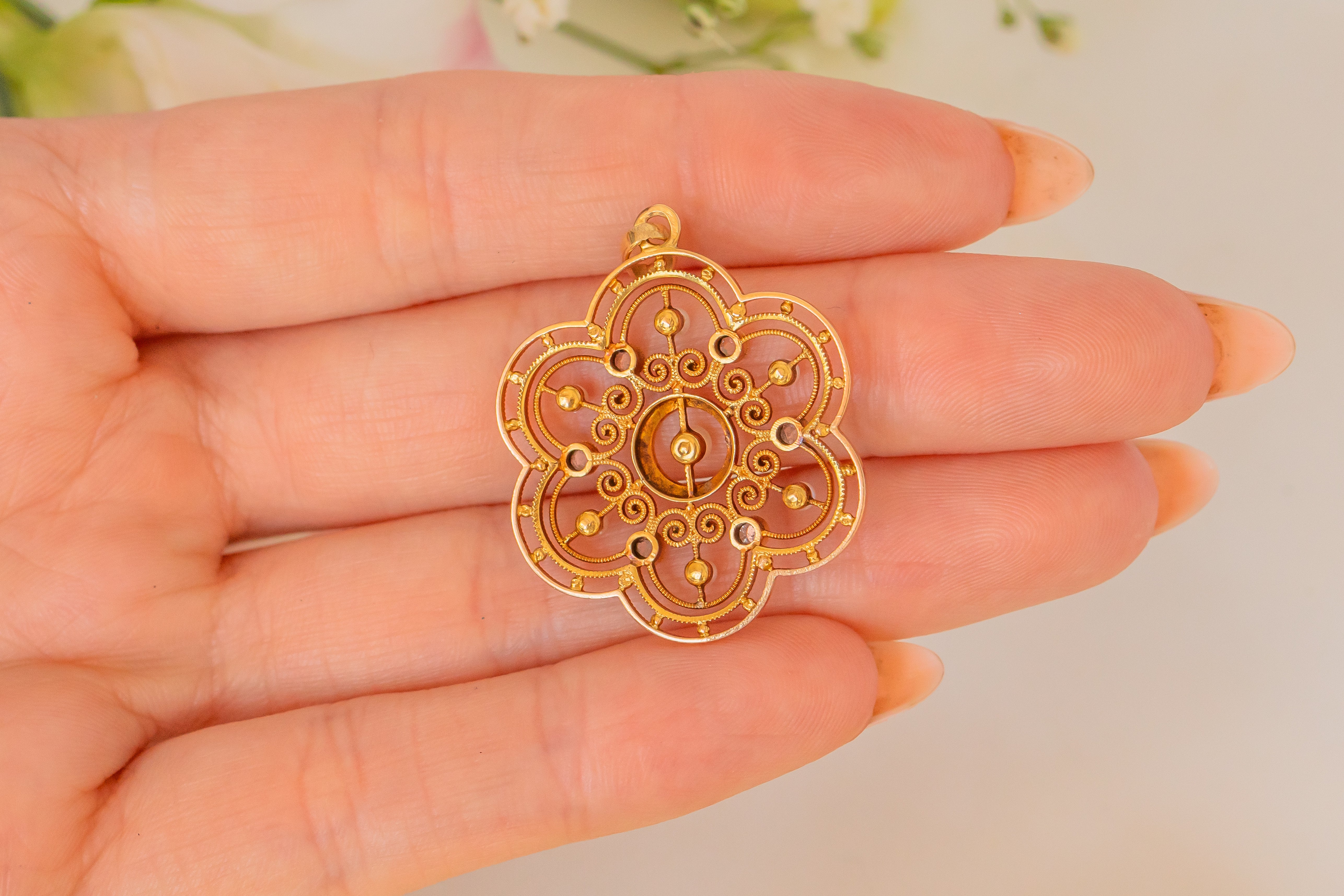 Her 18ct Gold looks rich and bright throughout, with fine filigree ornamental detailing in her centre. With a secure 18ct Gold bale, simply affix her to a