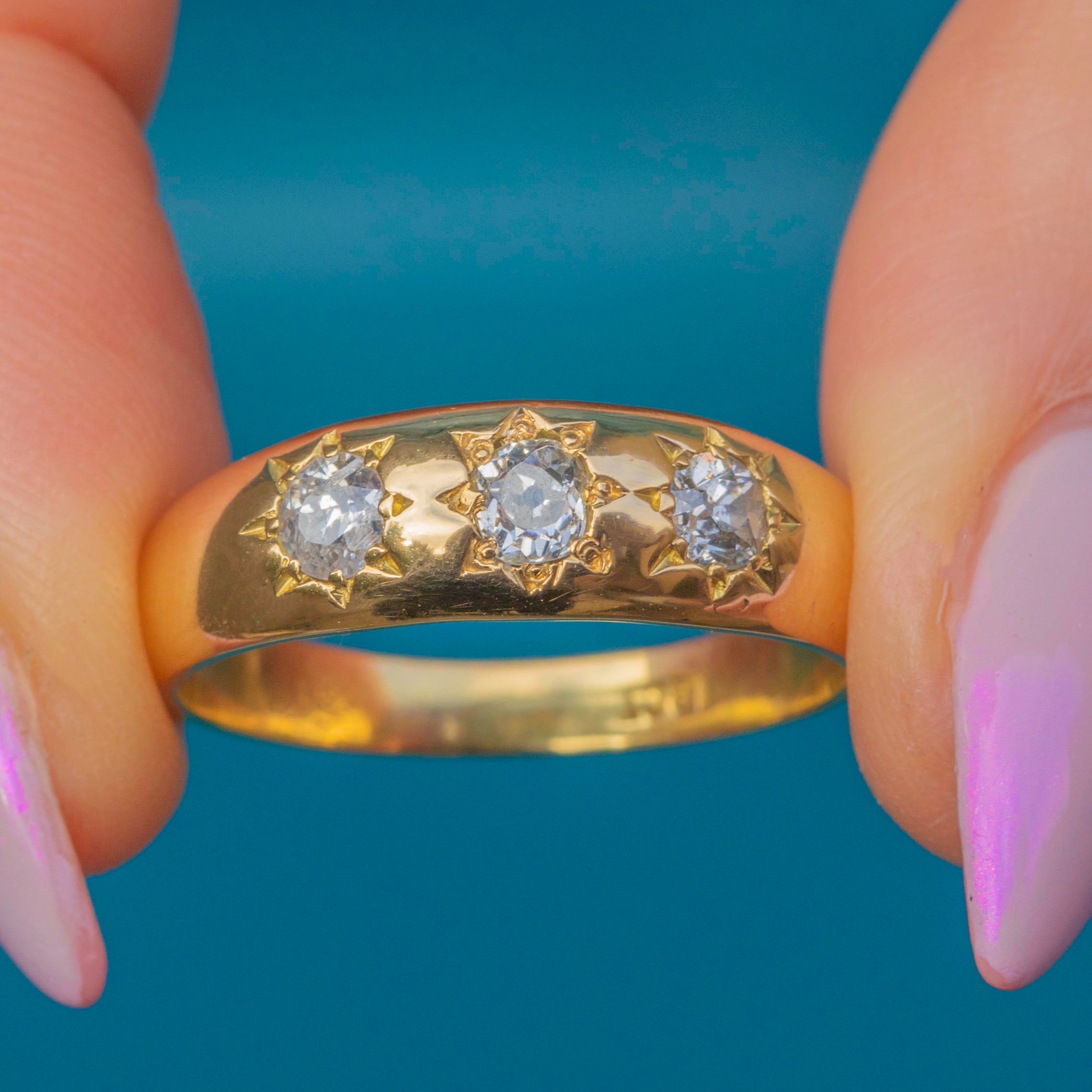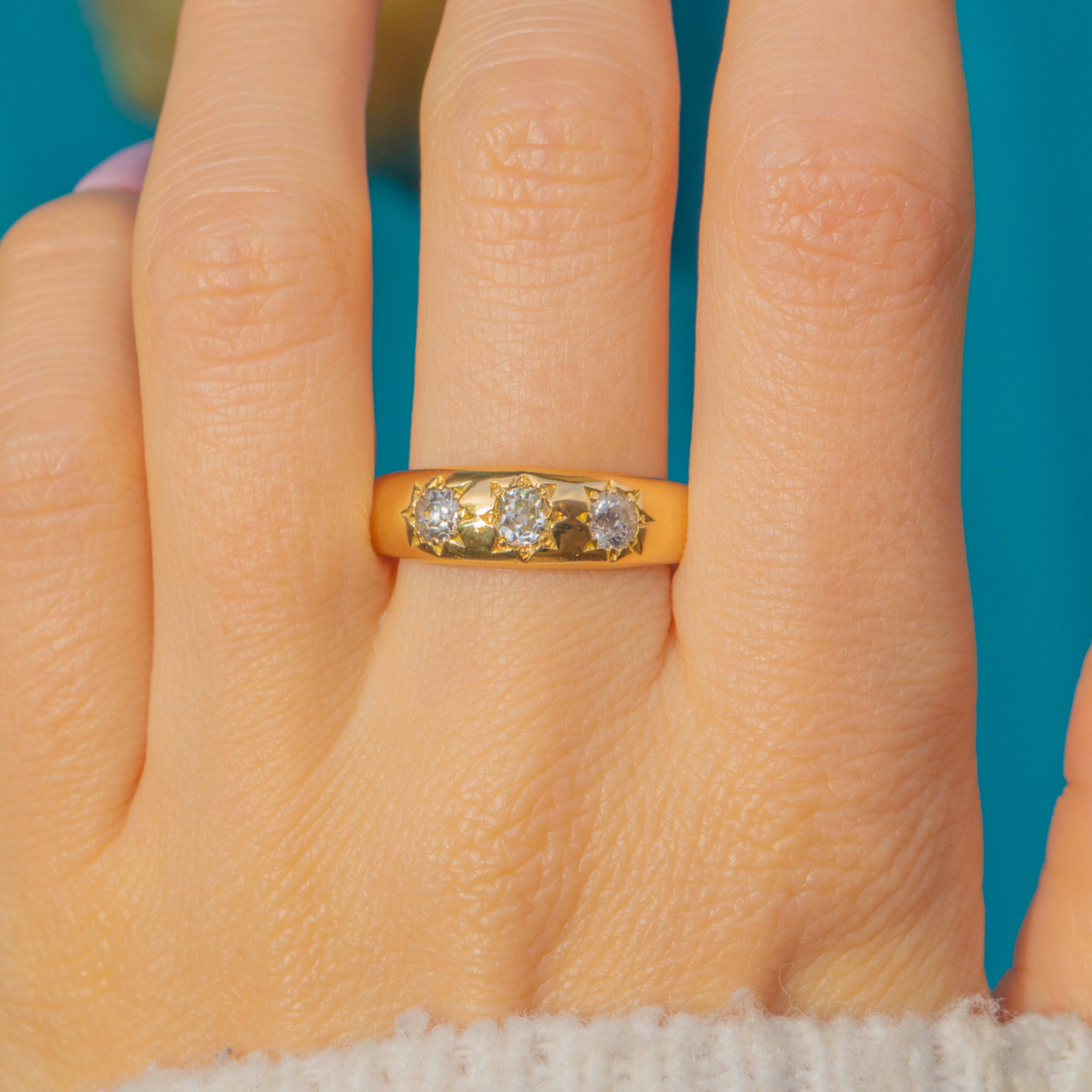 A superb Antique Victorian three-stone gypsy ring crafted in rich 18ct Gold, set with a trio of sparkling old-cut Diamonds. The stones graduate gracefully across the band, their bright, fiery sparkle contrasting beautifully with the smooth, buttery Gold setting.