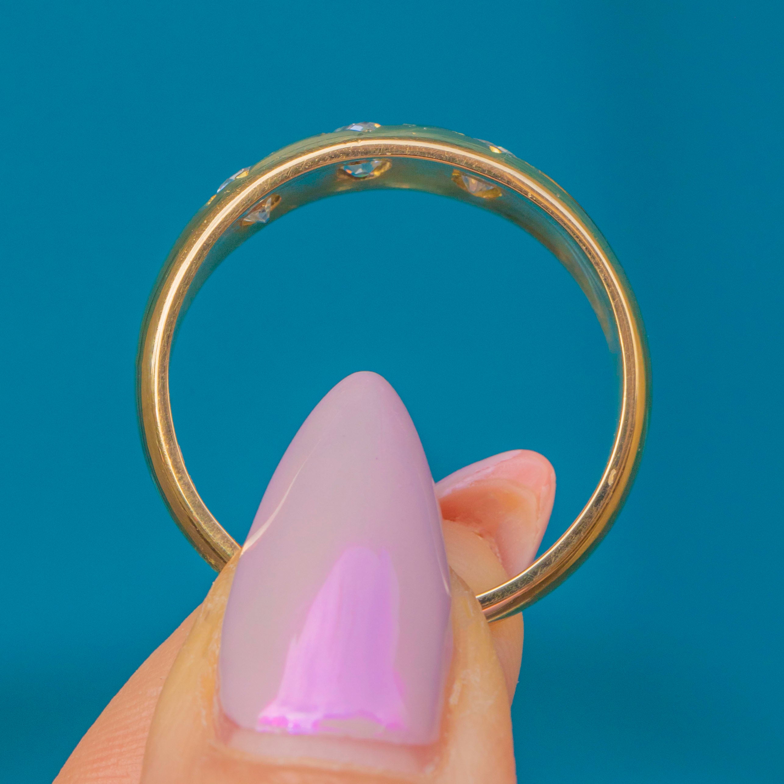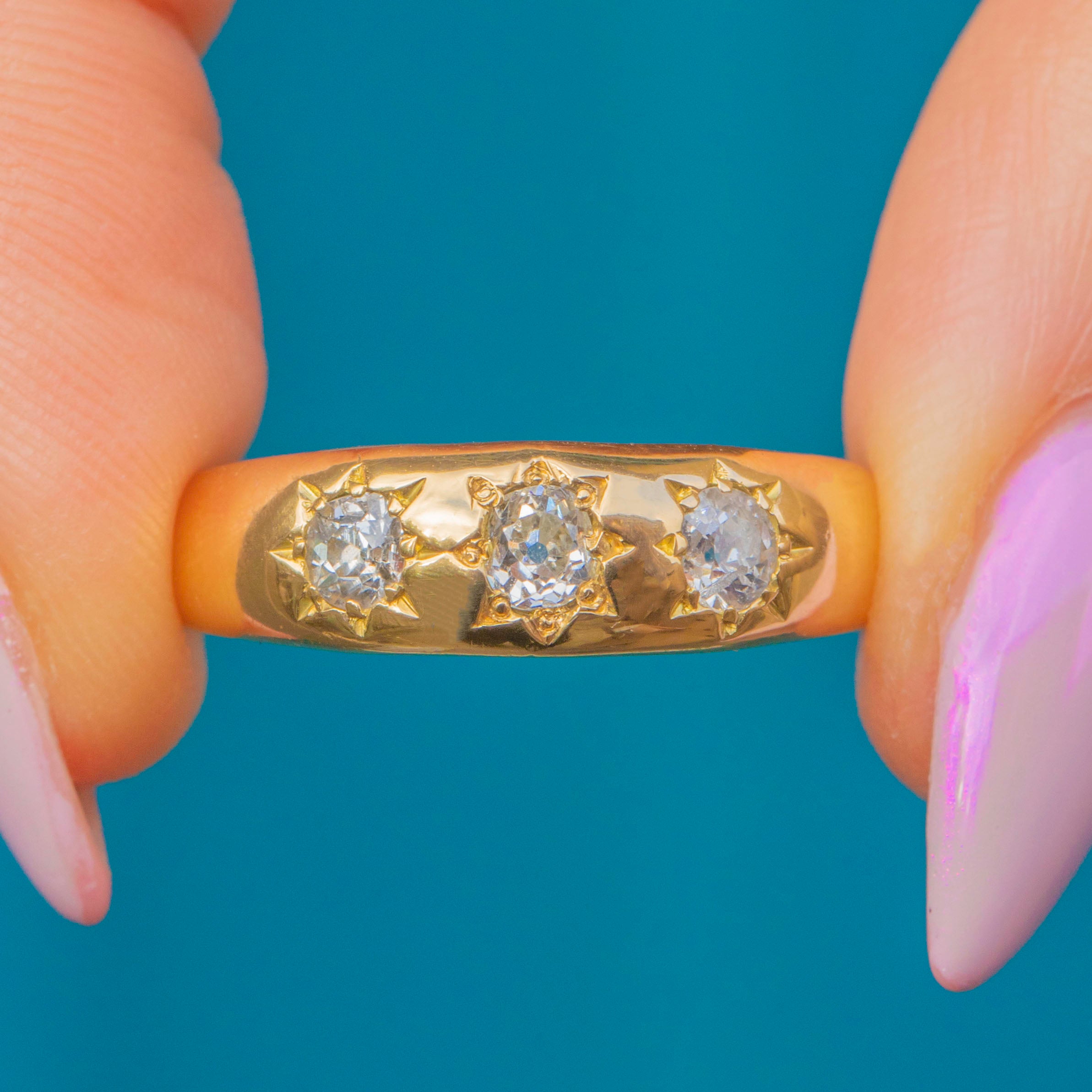 The substantial tapered band and classic star-shaped settings are characteristic of late Victorian design, bold yet elegant, and made to last a lifetime. A timeless treasure that embodies the warmth and craftsmanship of the era.