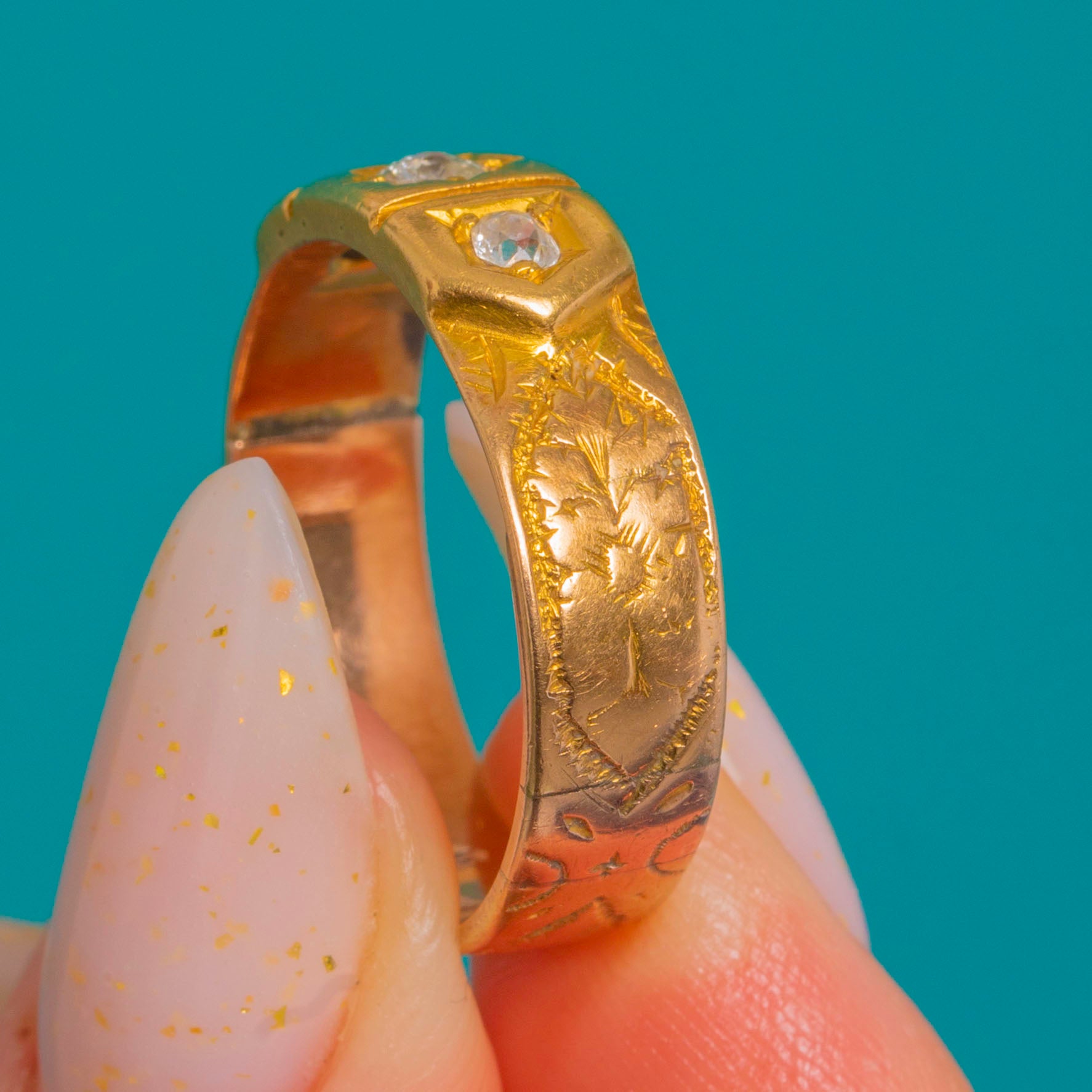 A classic Victorian trilogy gypsy ring in rich 18ct Gold, star-set with a larger central Diamond flanked by two smaller stones. The low, flat head is arranged in three rectangular cartouches divided by slim ribs, giving a refined, architectural feel. Beautiful foliate and scroll engraving flows down the shoulders, with crisp bright-cut details that catch the light.