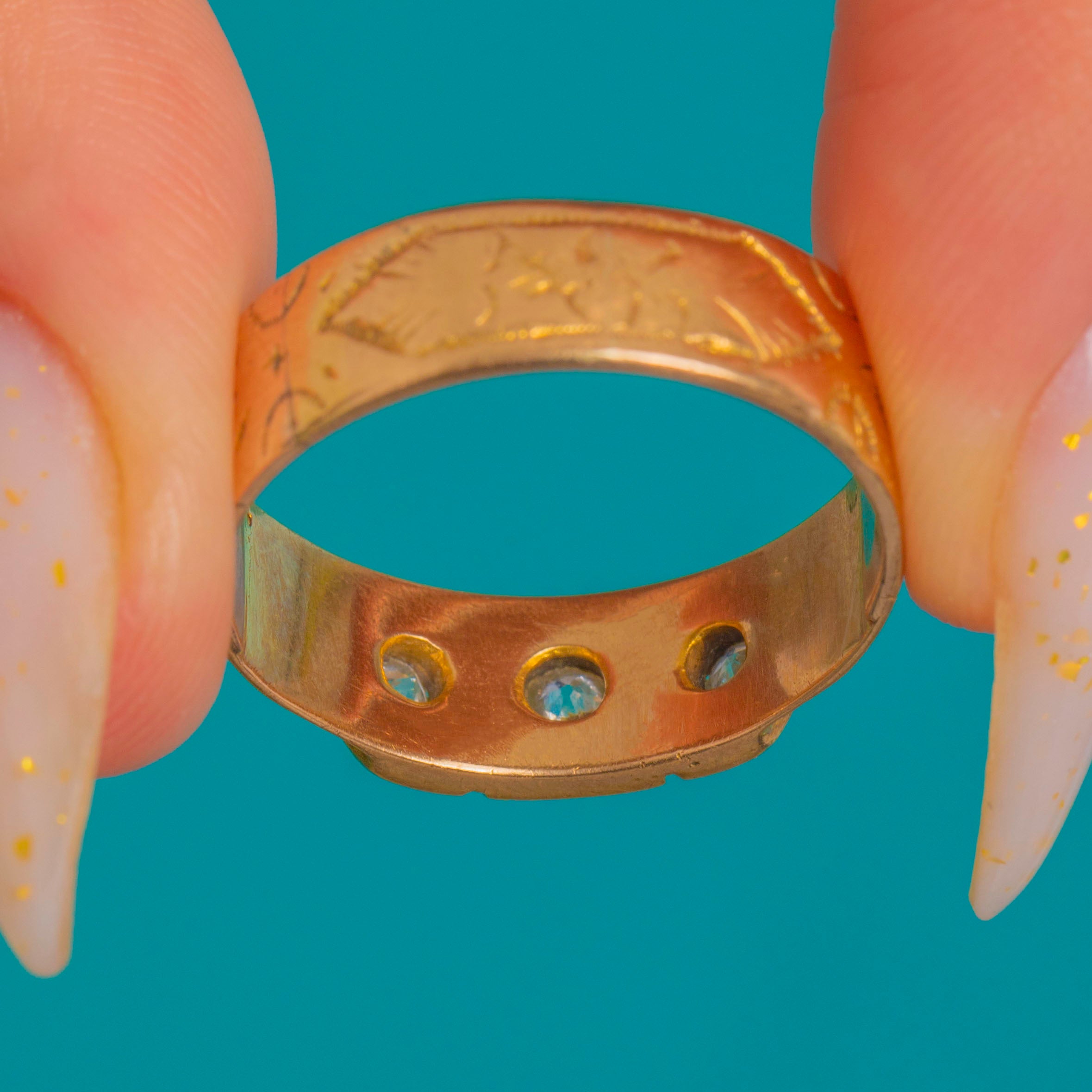 Antique 18ct Gold Diamond Trilogy Gypsy Ring, Engraved Band Item added