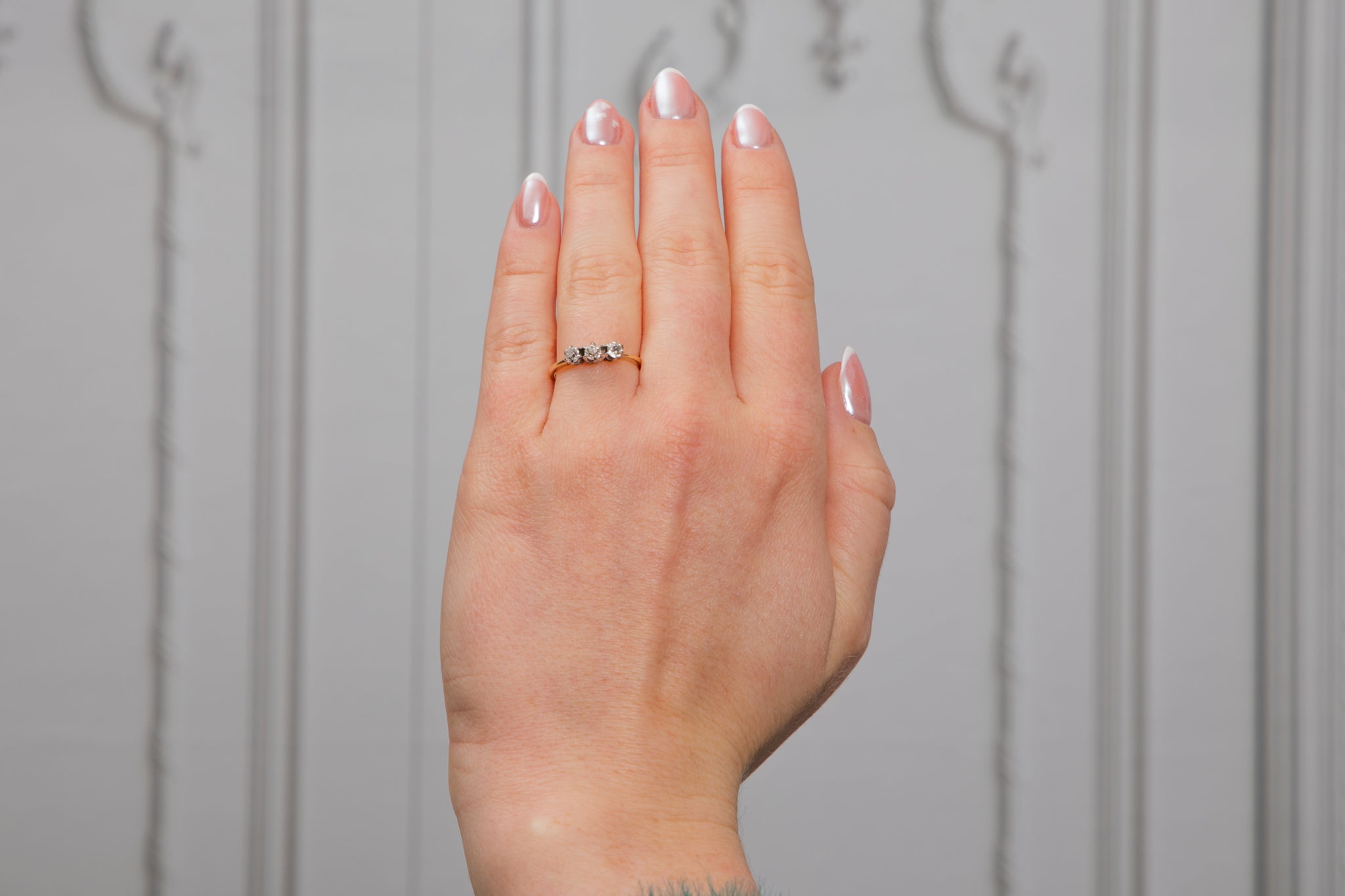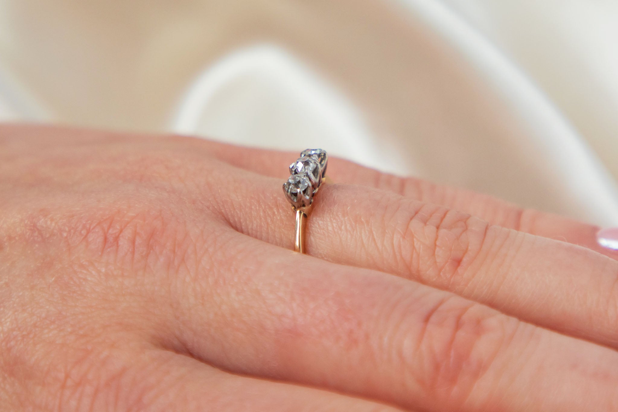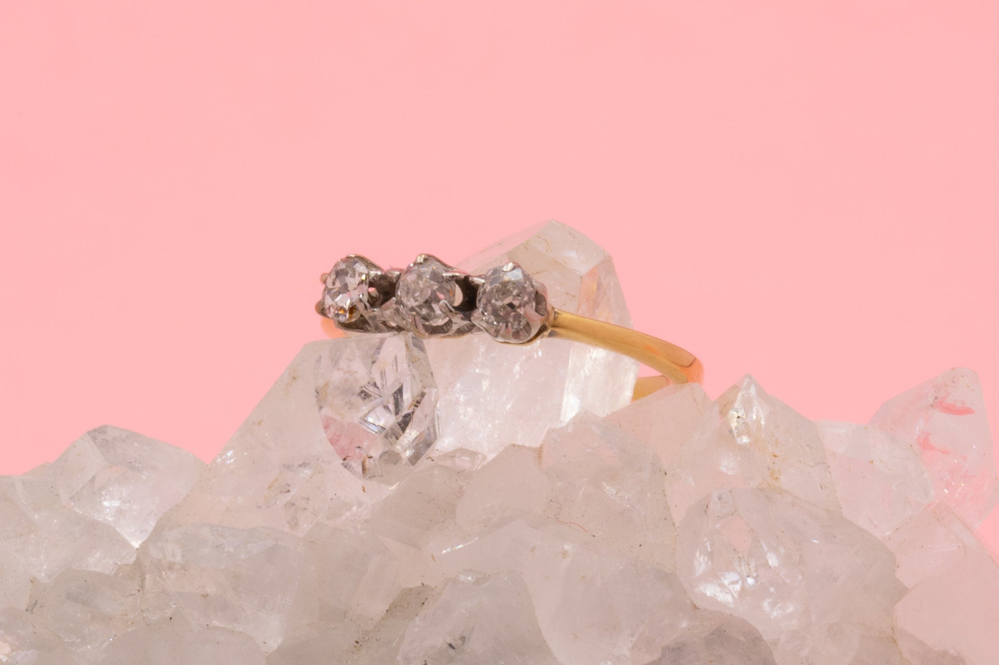 VERY GOOD. This antique 18ct Gold Diamond trilogy ring is in very good condition throughout. All of the Diamonds are secure within their settings, with no discernable signs of wear to their facets or their domes. The hallmarks inside the band have worn due to wear over time, but there is no damage to the band on the outside. What a romantic way to propose to your fiance-to-be!