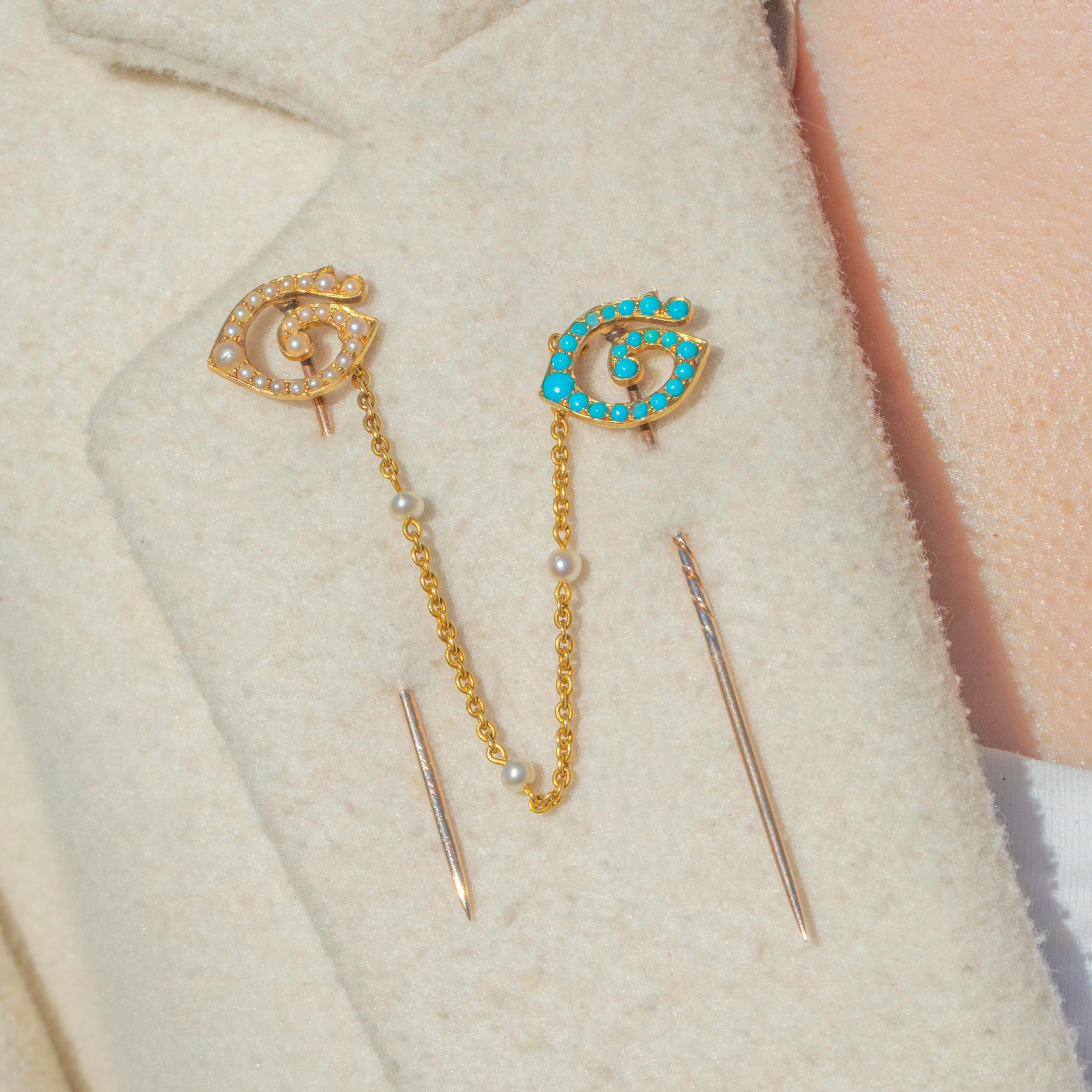 The combination of gemstones creates a striking contrast, with one eye inlaid with sky-blue Turquoise and the other creamy iridescent Pearls. The pins are connected by a length of solid 18ct Gold chain, dotted with Pearls, adding a unique edge to this exquisite piece.