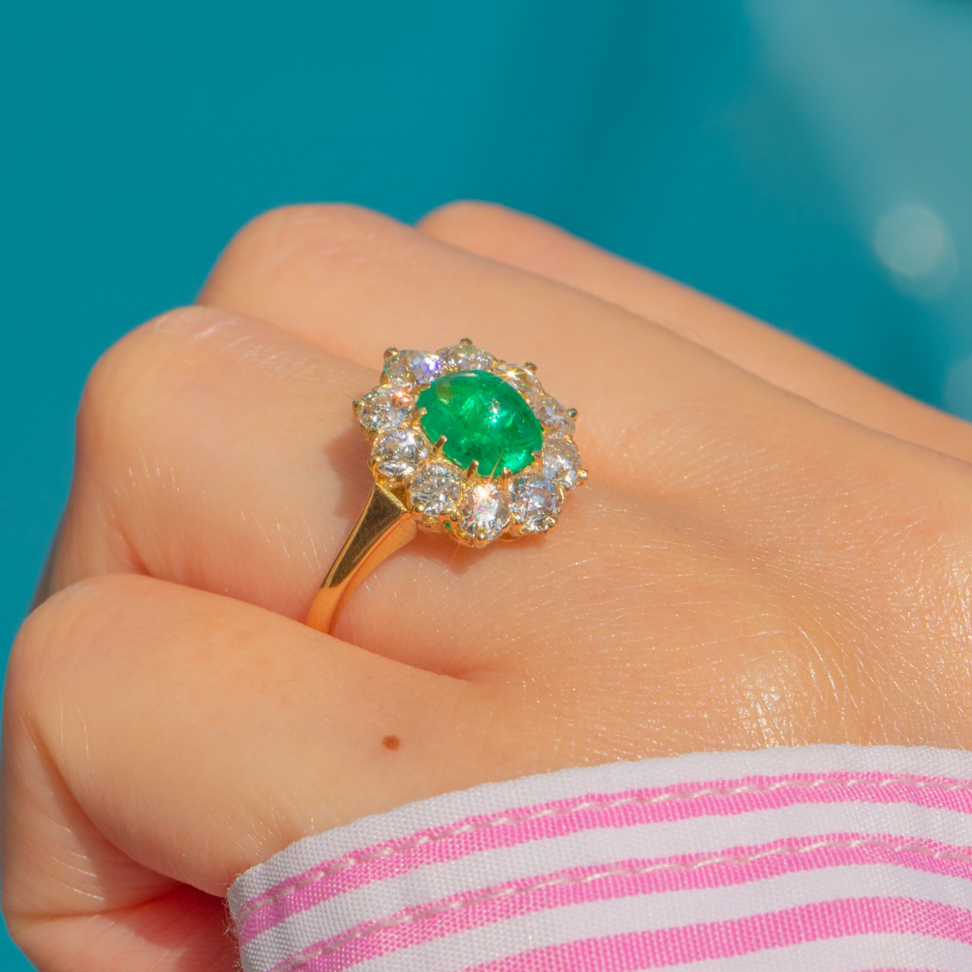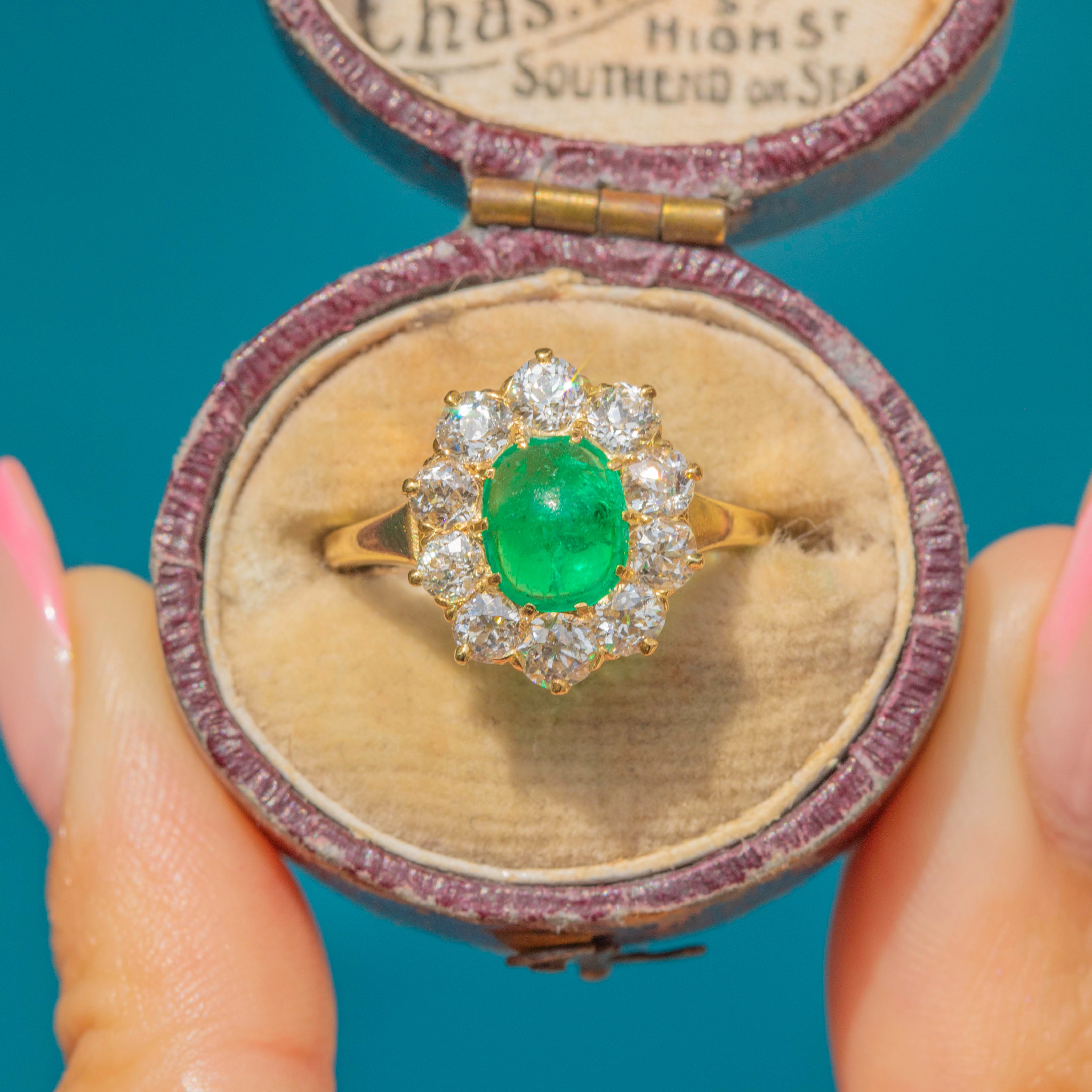 VERY GOOD-EXCELLENT: This antique 18ct Gold Emerald and Diamond cluster ring is in great condition. Her radiant Emerald is secure in its settings, and though she presents some surface wear this is difficult to spot even with a loupe. Each of the surrounding Diamonds are equally impressive and securely set, meaning you can wear this Victorian cluster ring with the utmost confidence!