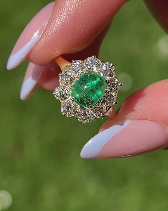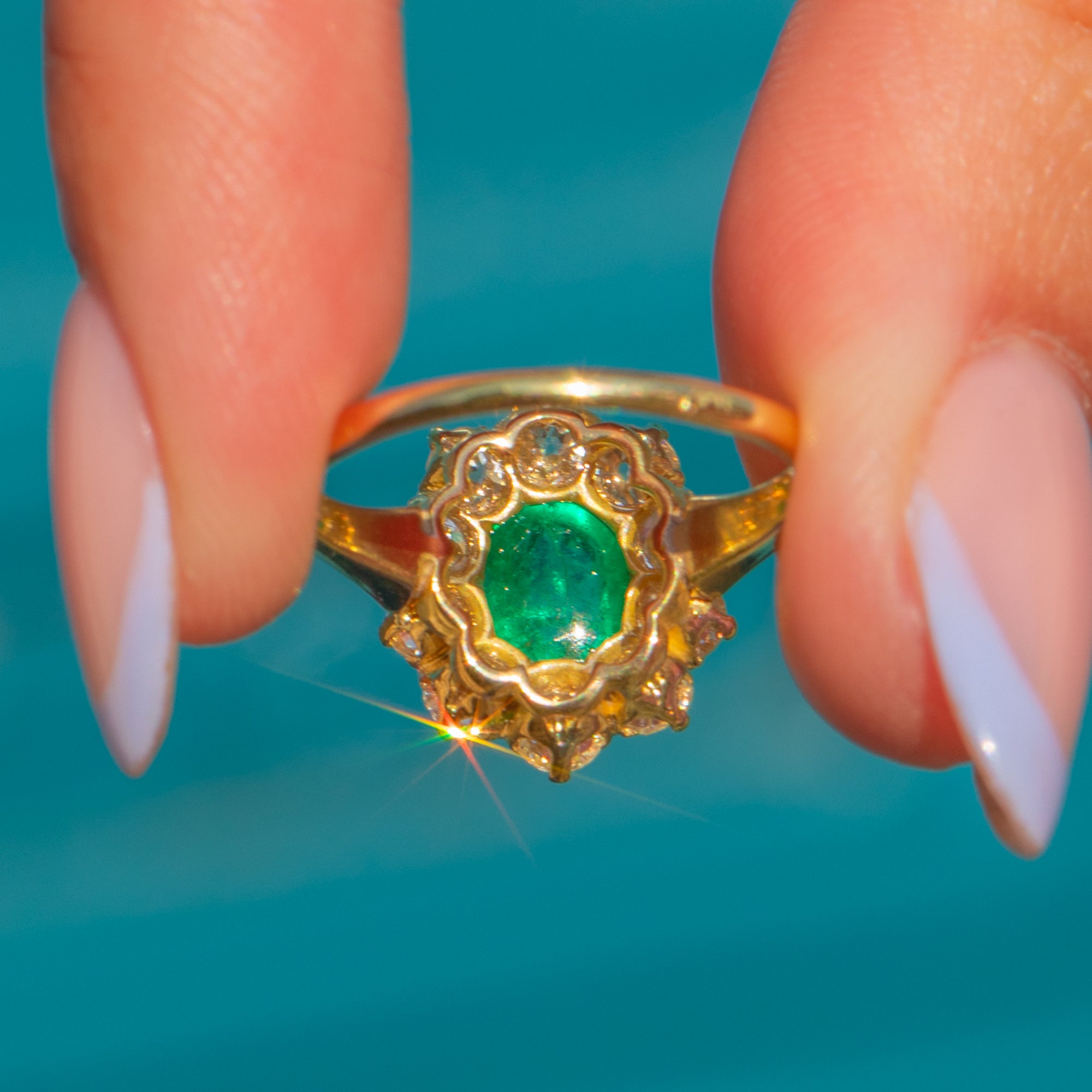 This antique 18ct Gold Emerald and Diamond cluster ring is a magnificent piece!
