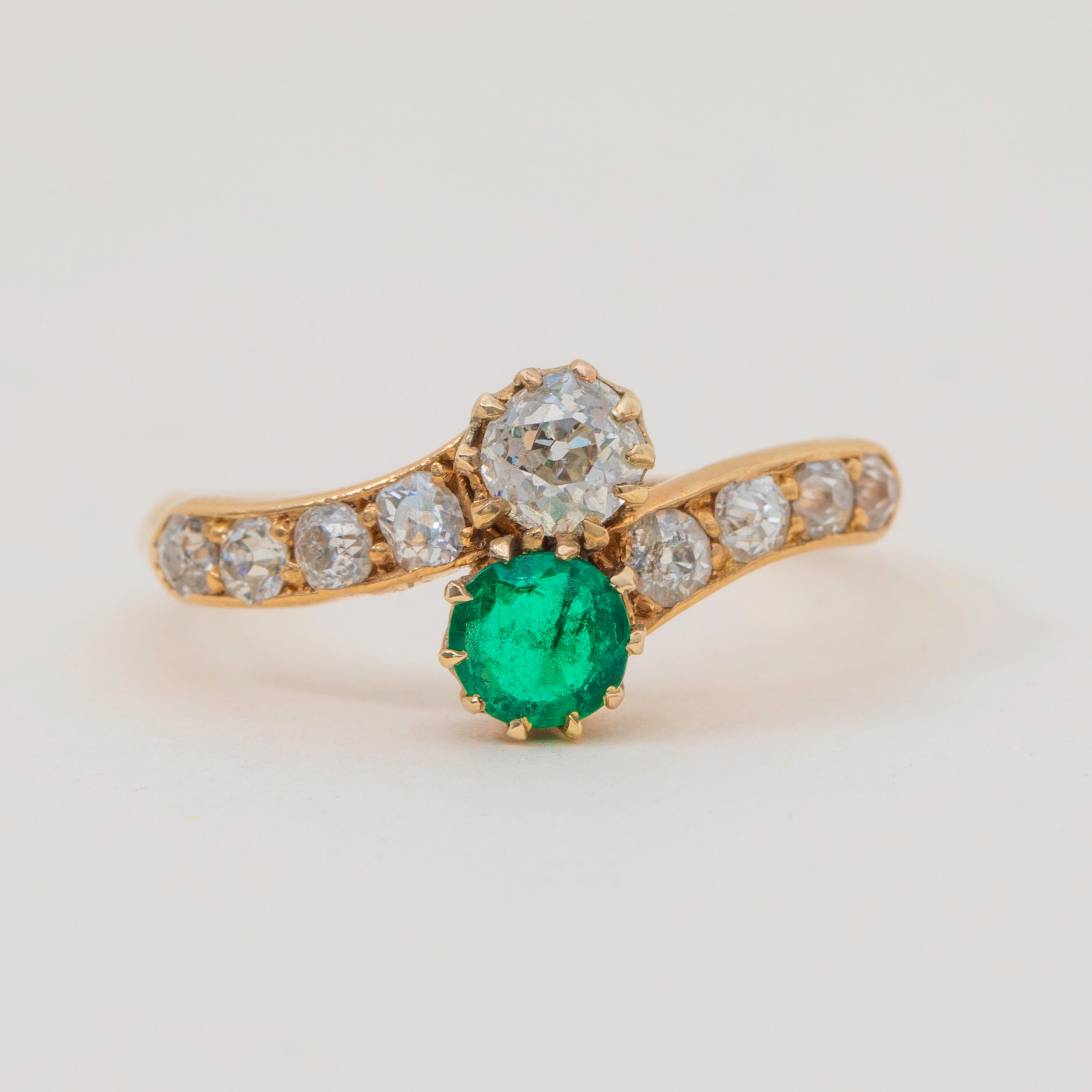 EXCELLENT. This antique 18ct Gold Emerald Diamond toi et moi ring is in excellent condition. Each of her gemstones are faceted wonderfully and sit securely within their settings. With minimal signs of wear, this Edwardian ring is in fabulous condition.