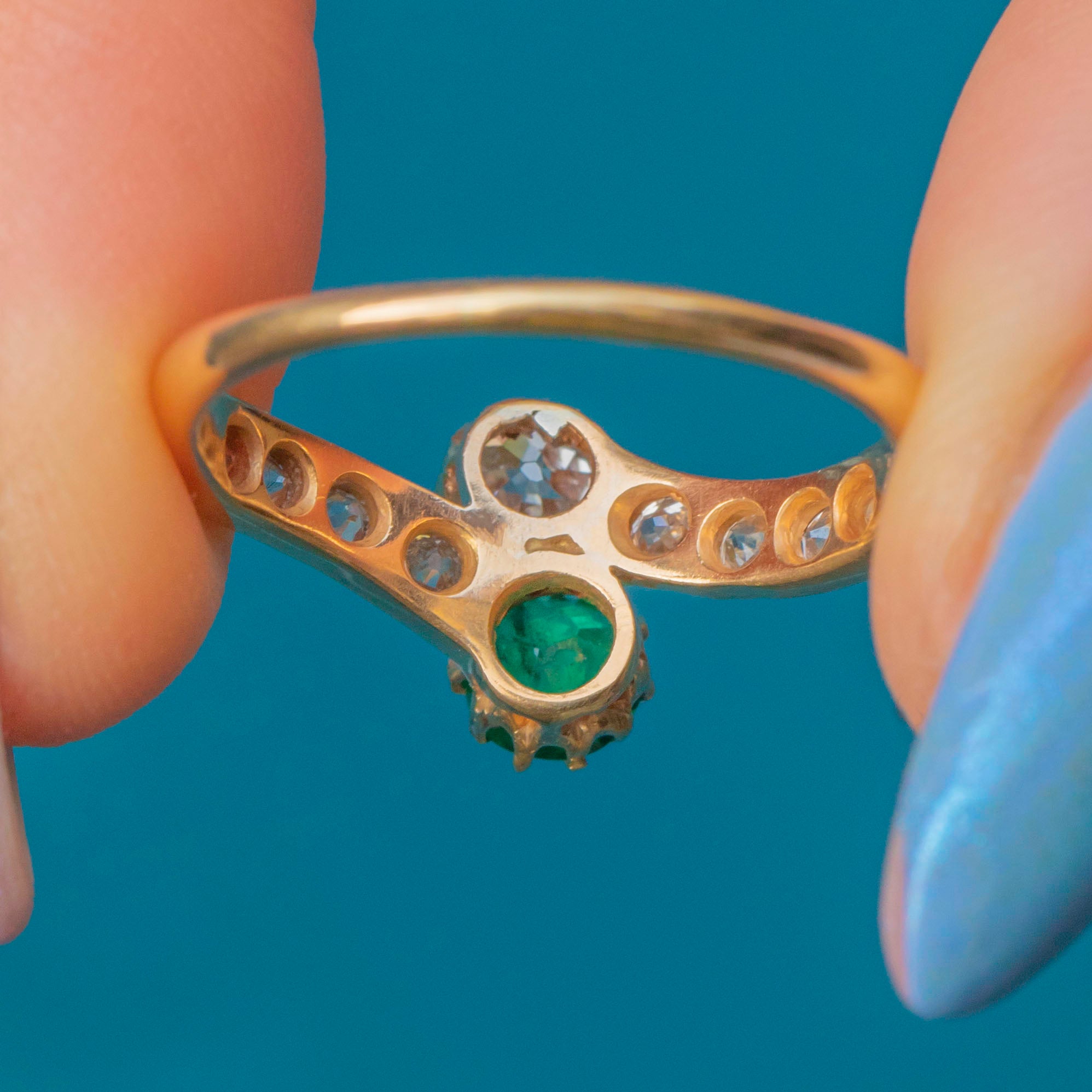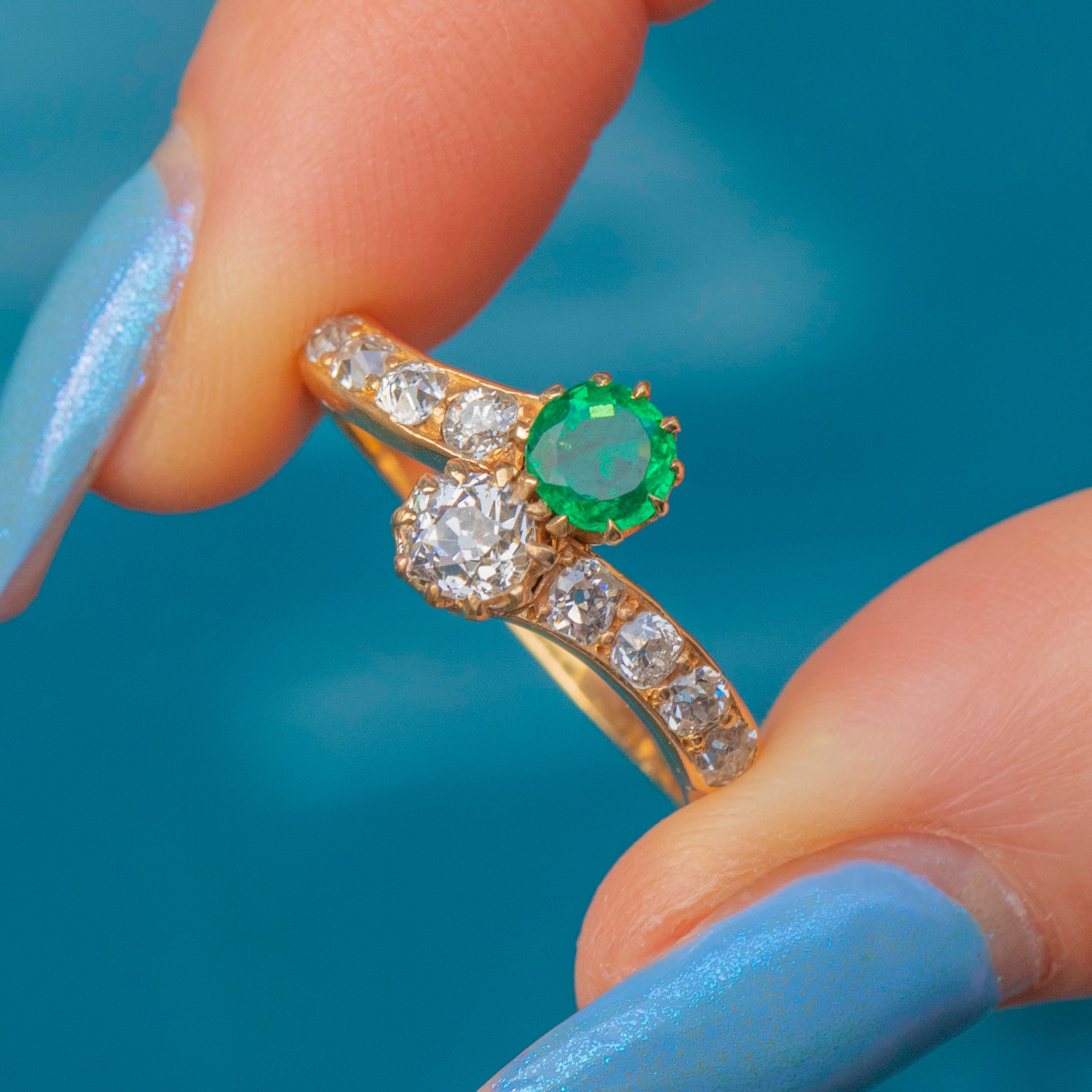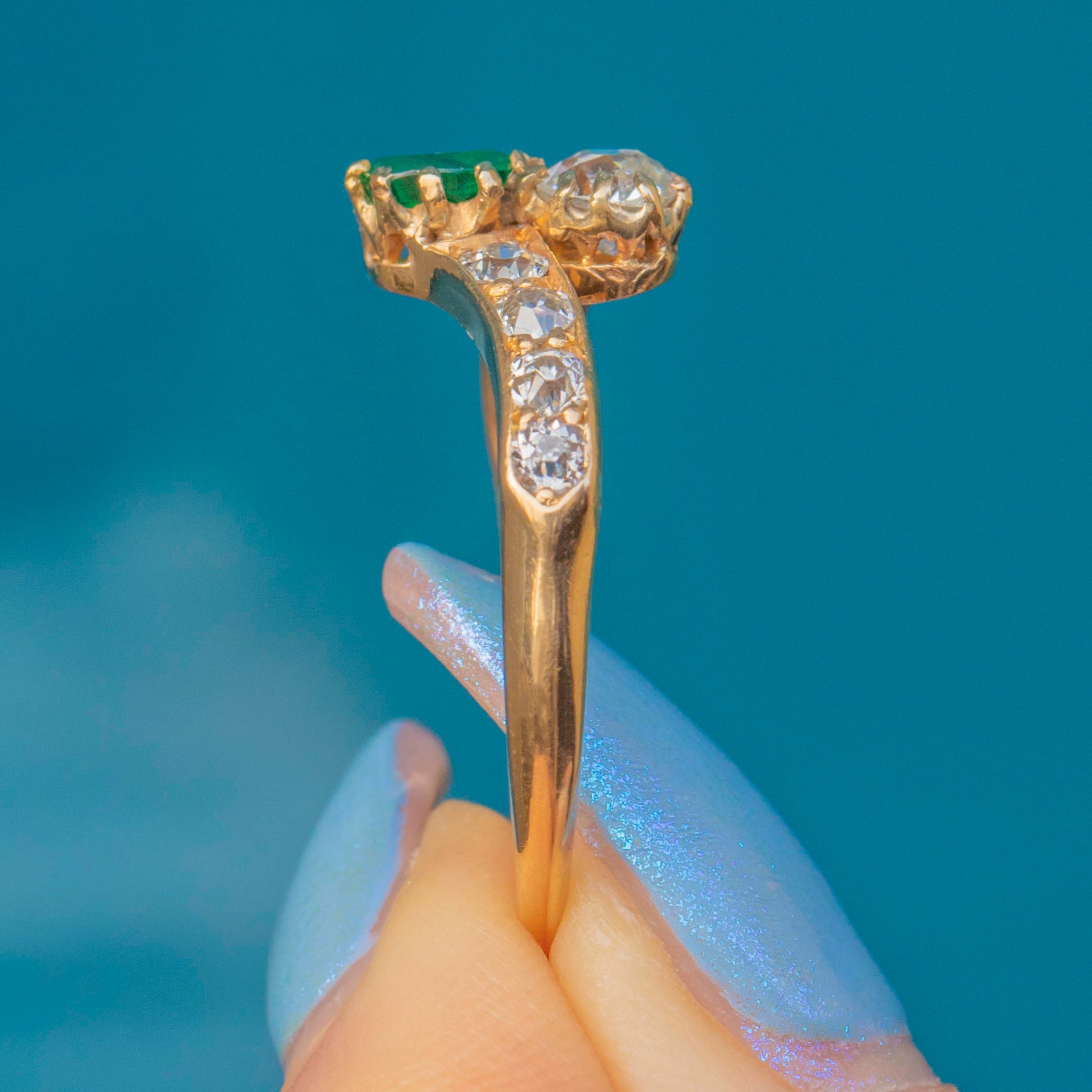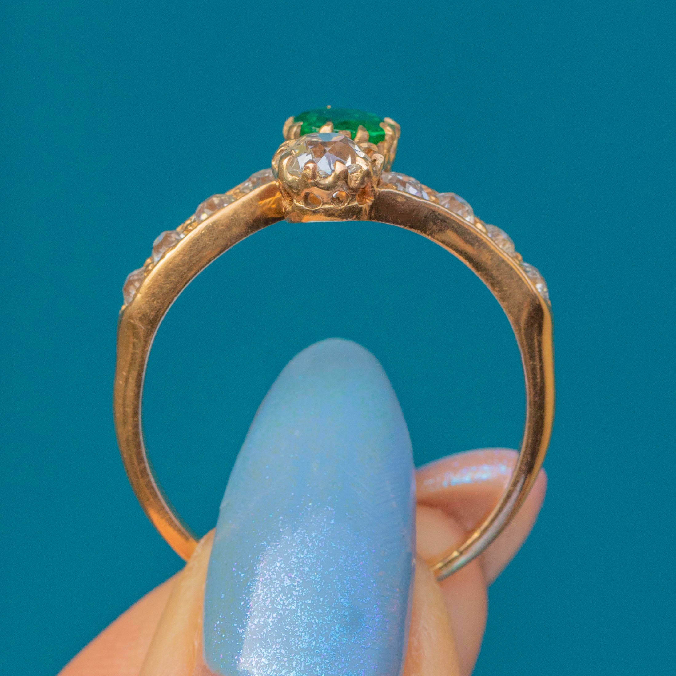 She features a gorgeous Emerald and Old-mine cut Diamond at her centre, and is adorned by eight scintillating Diamonds on her shoulders, each faceted wonderfully to twinkle in the light. Each gemstone sits securely within her settings, with the warmth of the 18ct Gold marrying them together.