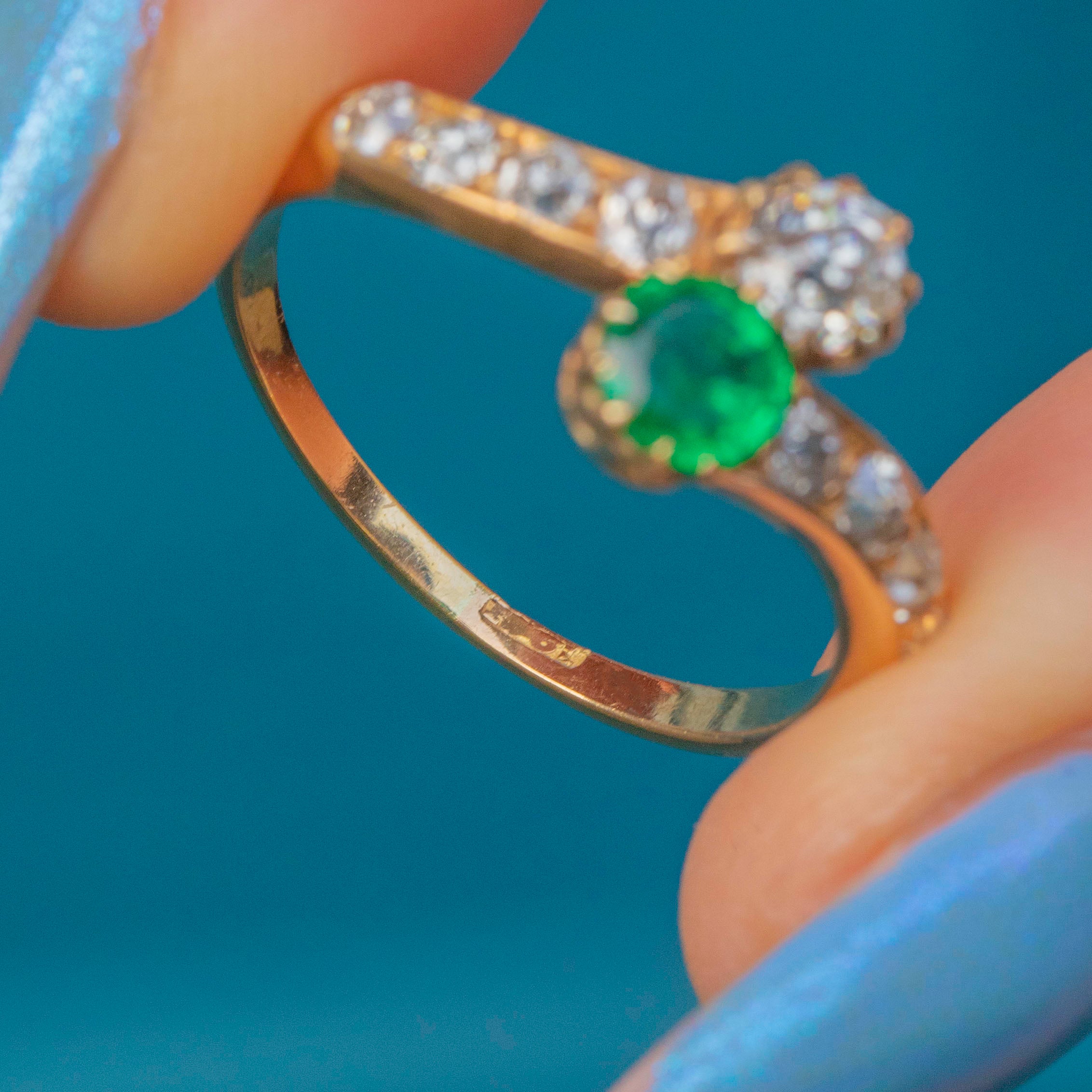 This antique 18ct Gold Emerald Diamond toi et moi ring is divine!