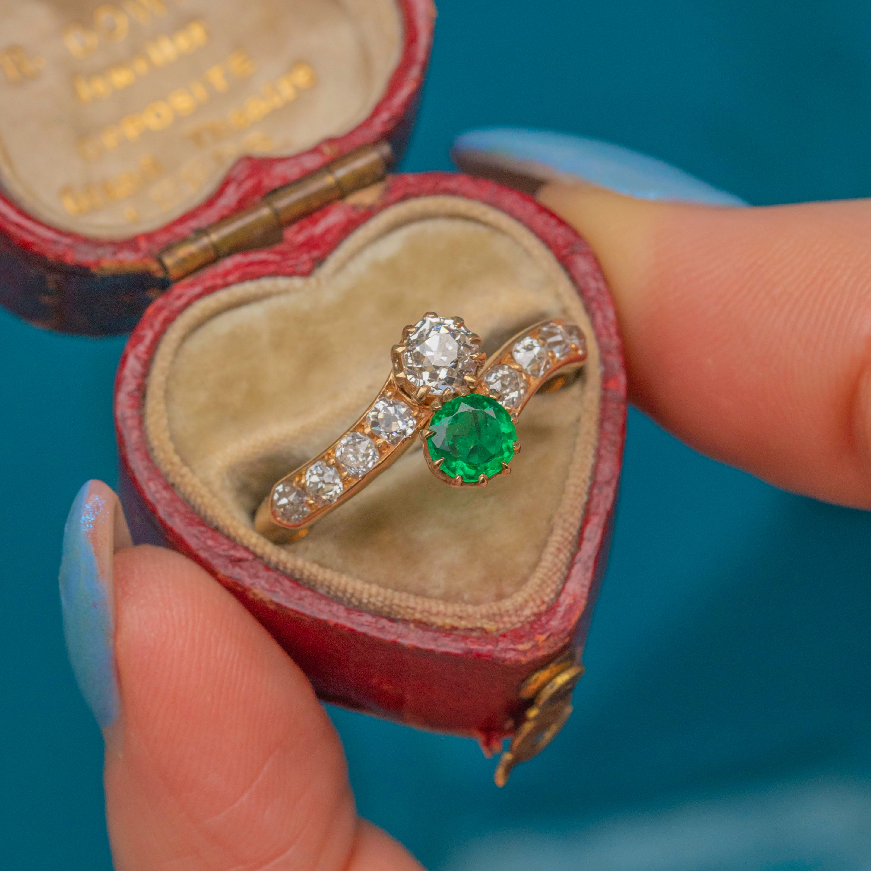 Symbolic of a union between two partners, Toi-et-moi rings - directly translating to 'you and me' - ooze romance and sentimental value. A superb, elegant antique piece, this Emerald and Diamond Edwardian ring would make a wonderful choice for a unique engagement ring!
