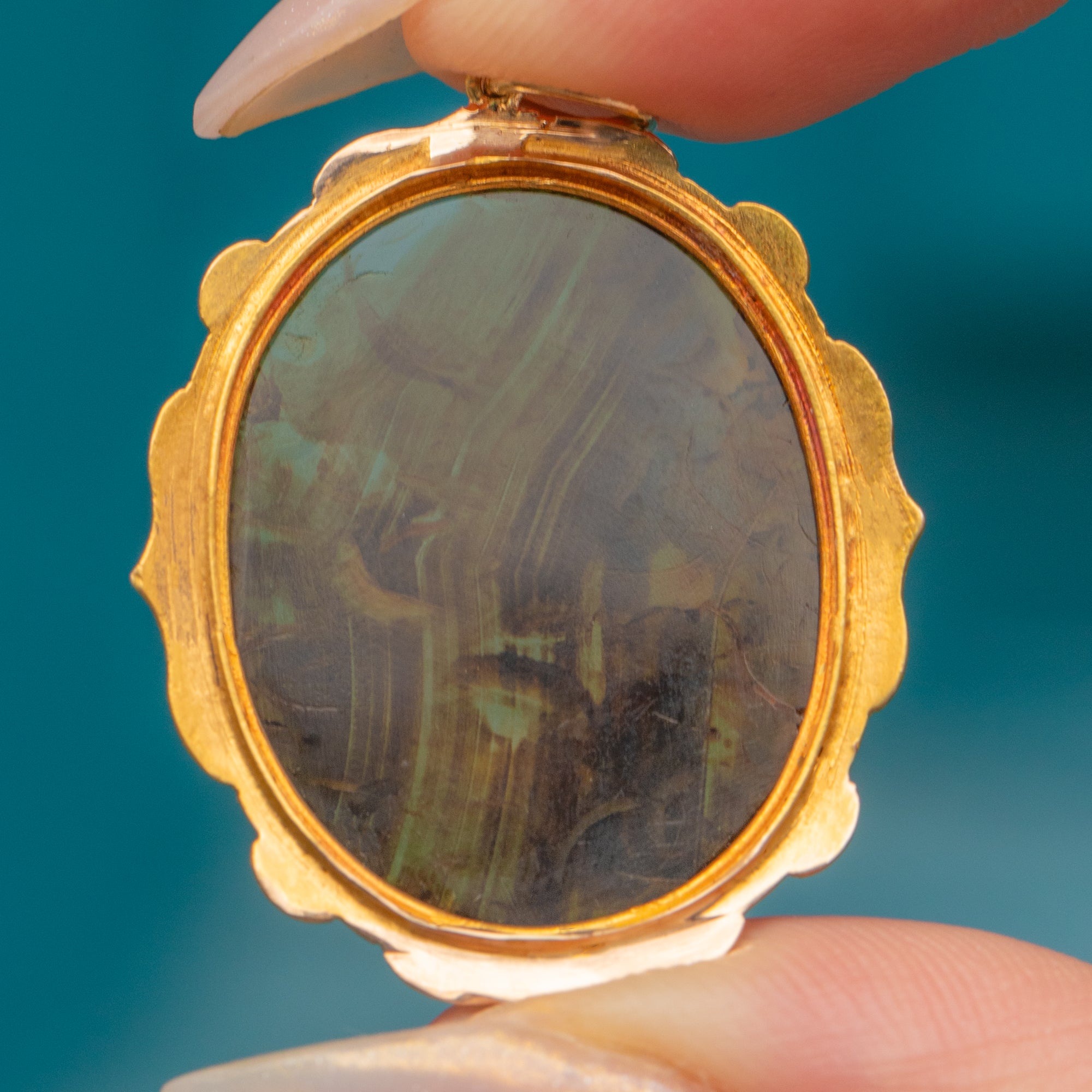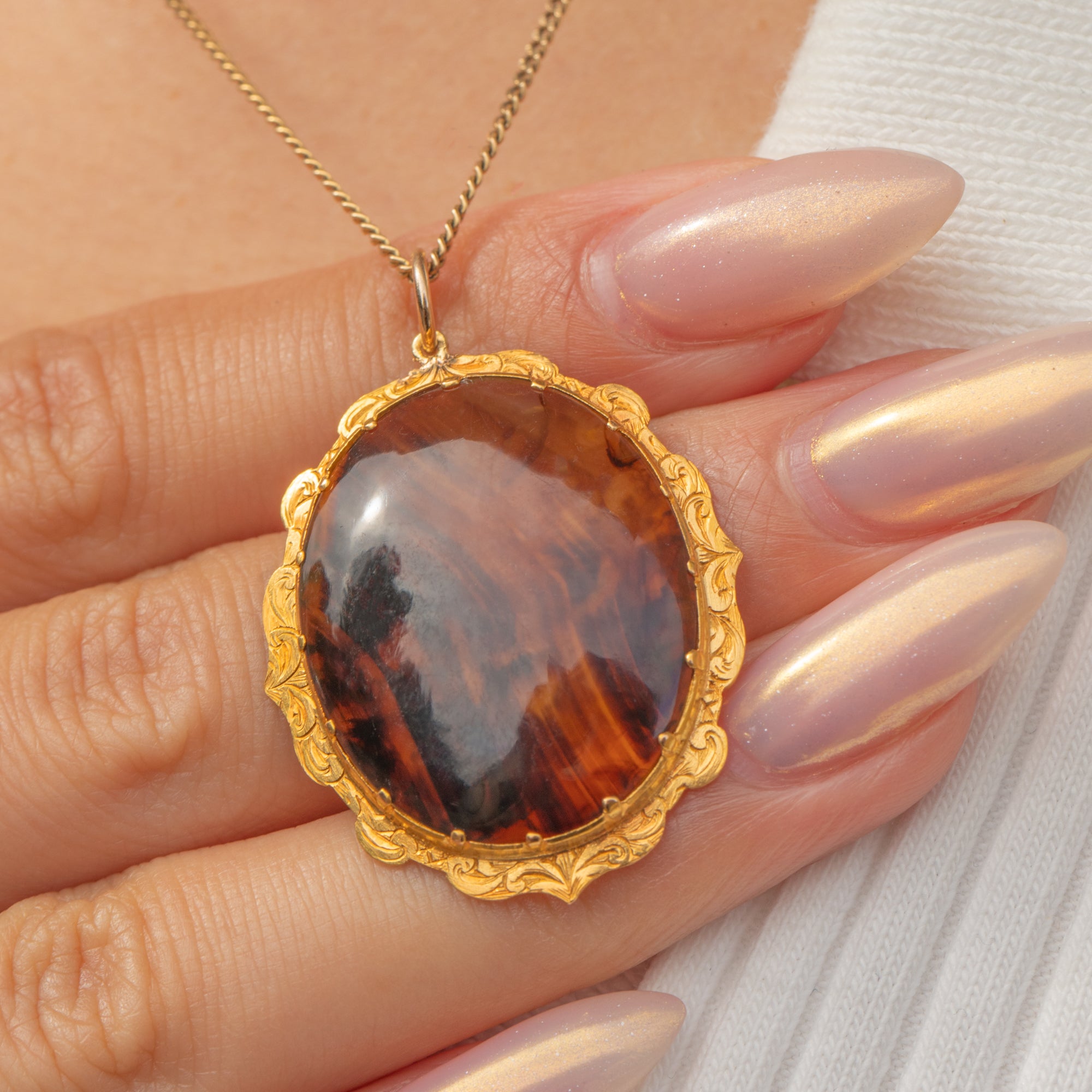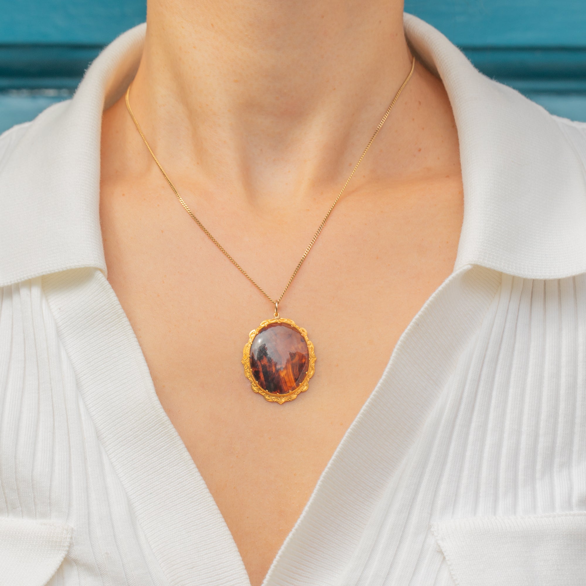 This Victorian pendant showcases a richly coloured Jasper cabochon, polished to a smooth dome and framed in a finely engraved 18ct Gold mount. The Jasper’s natural variations of earthy red and brown tones lend it a dramatic and organic beauty, making each angle unique.