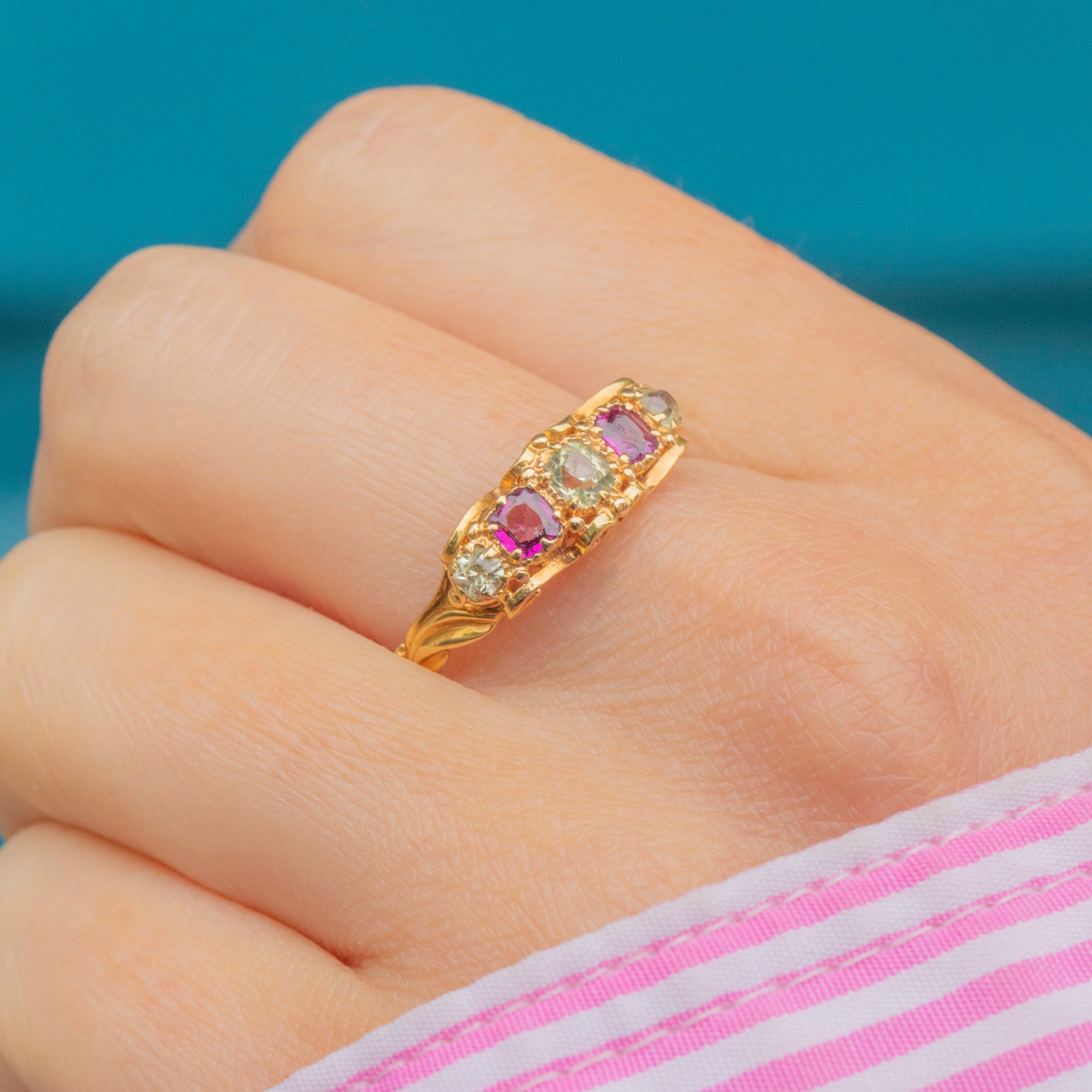This Victorian 18ct Gold Garnet Chrysoberyl five stone ring radiates antique charm!