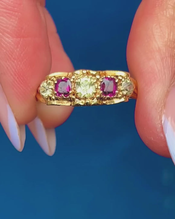 Featuring three gorgeous sage Chrysoberyl stones, each flanked by a vibrant fuchsia Garnet, this five stone ring is a decadent delight. She is crafted entirely from buttery 18ct Gold and features delicate, ornate settings and shoulders in quintessential Victorian style.