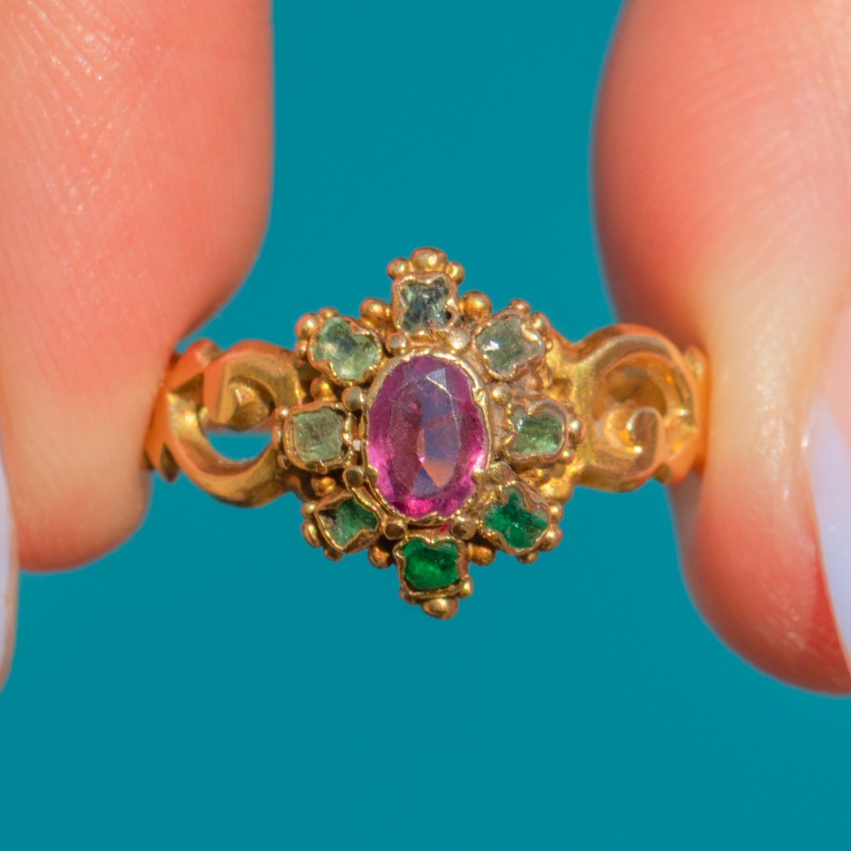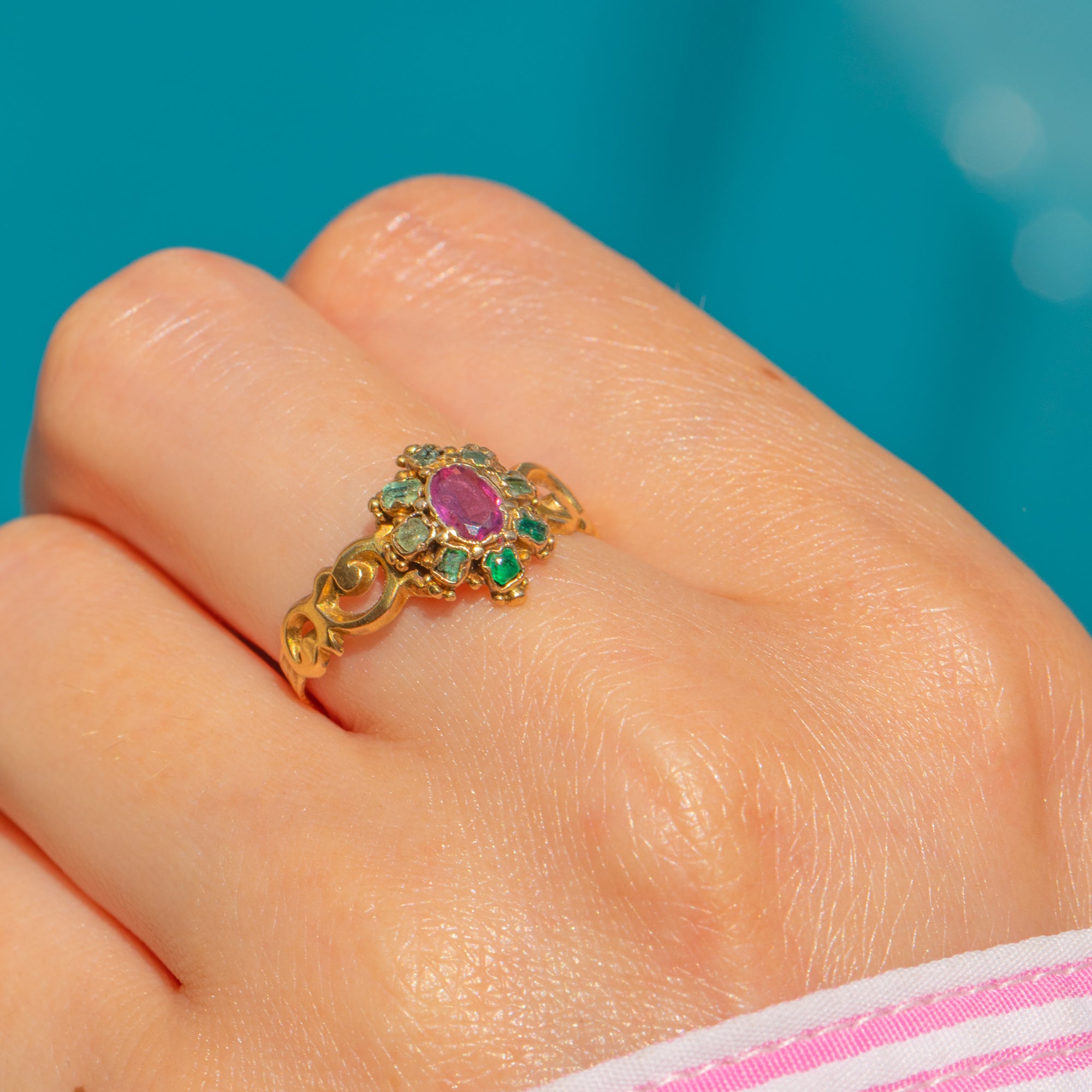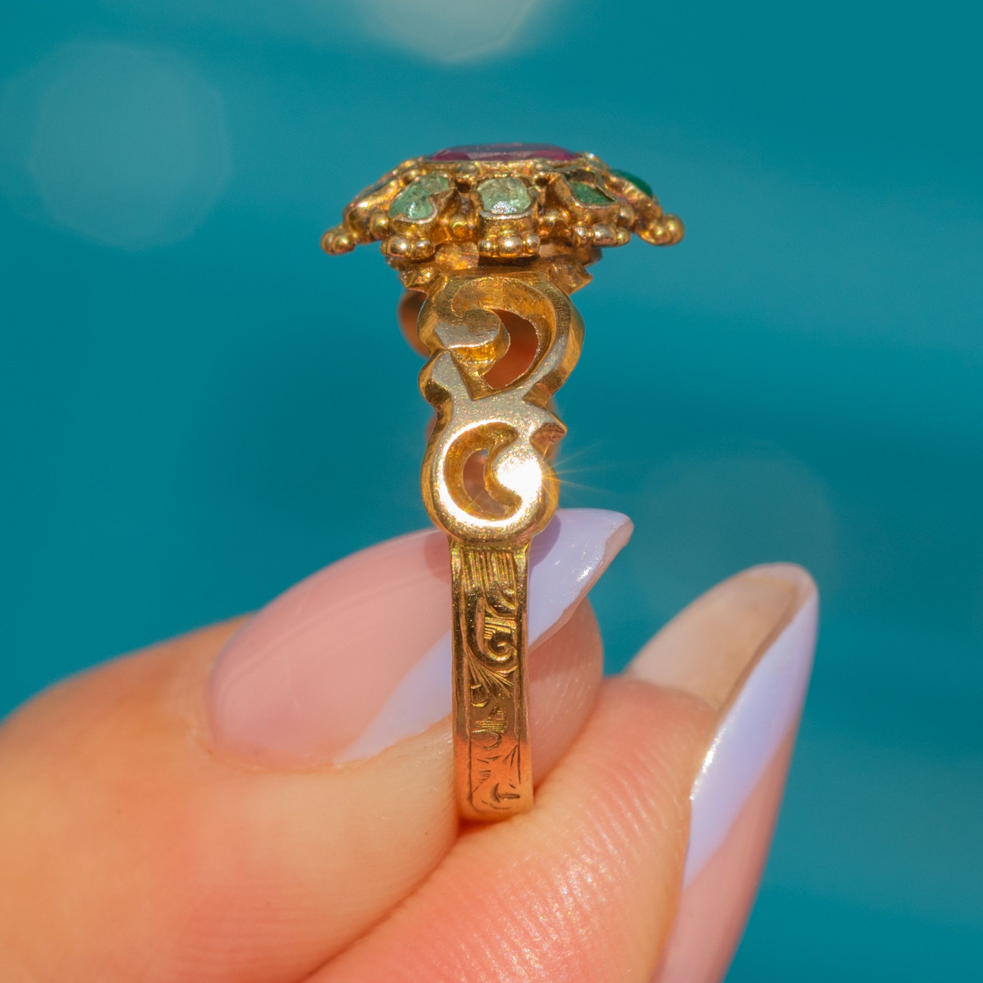 In her centre sits a fuchsia Garnet with royal purple tones, encircled by a halo of radiant Emeralds, each encased by buttery 18ct Gold settings. The antique gemstones are flanked by ornately detailed shoulders and complete with a distinctly engraved band.