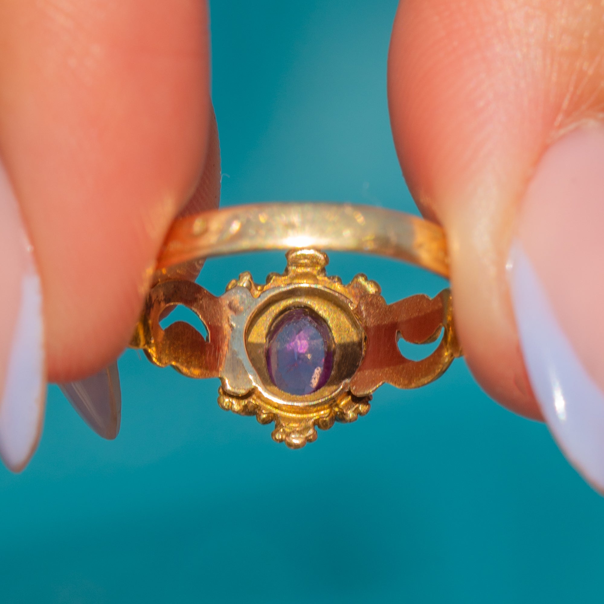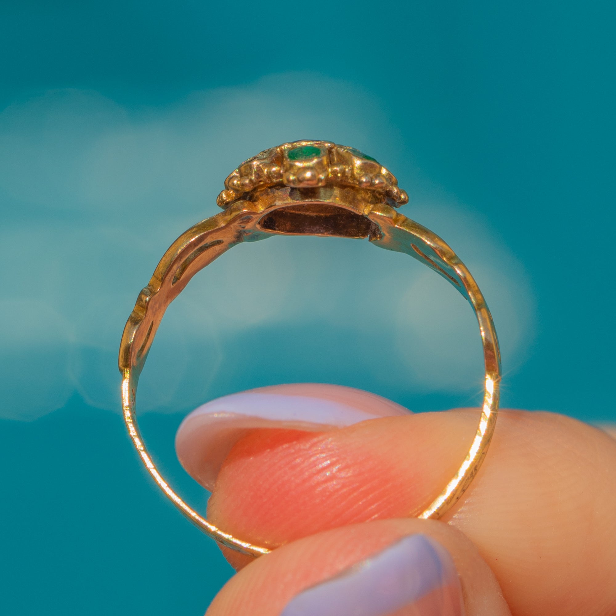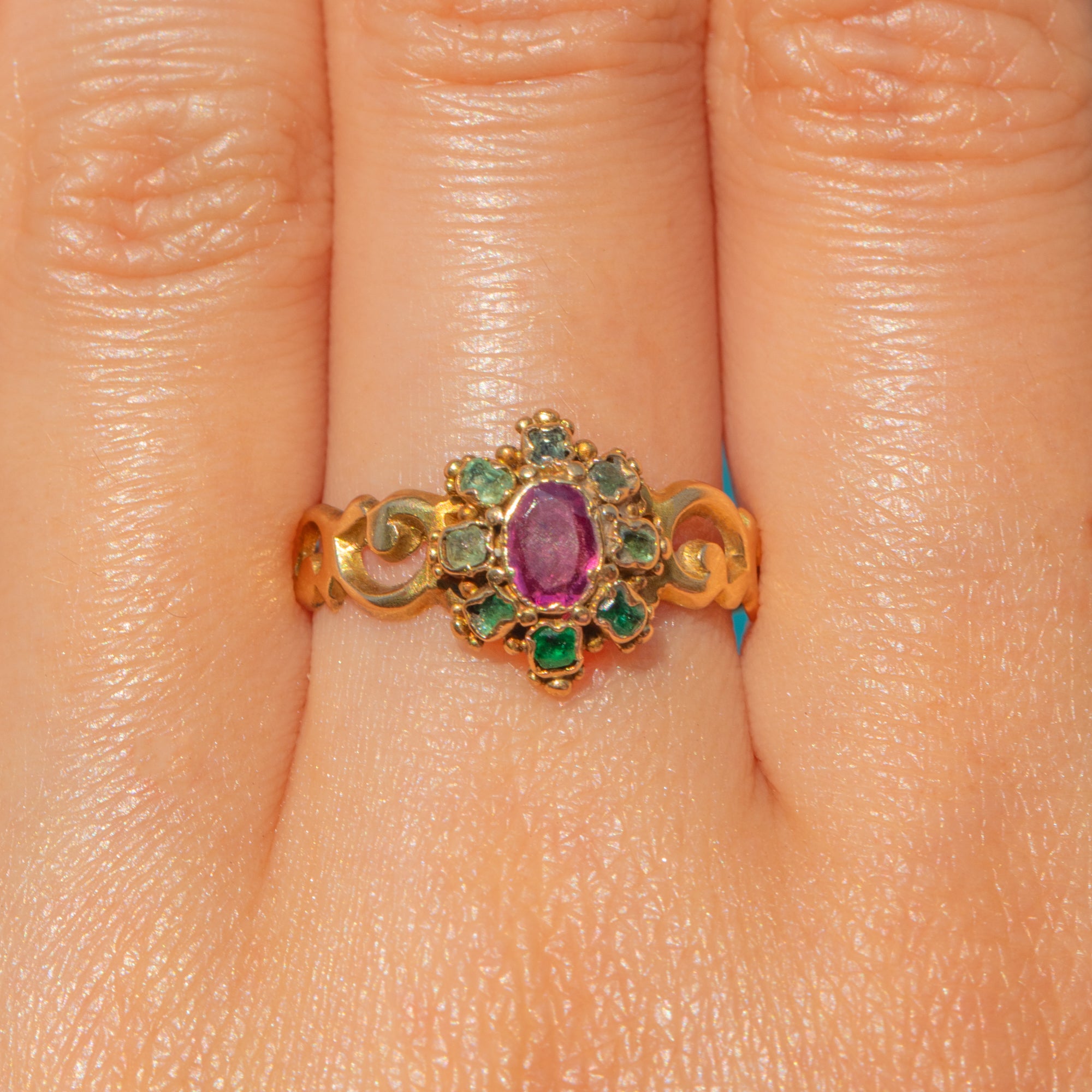 In her centre sits a fuchsia Garnet with royal purple tones, encircled by a halo of radiant Emeralds, each encased by buttery 18ct Gold settings. The antique gemstones are flanked by ornately detailed shoulders and complete with a distinctly engraved band.