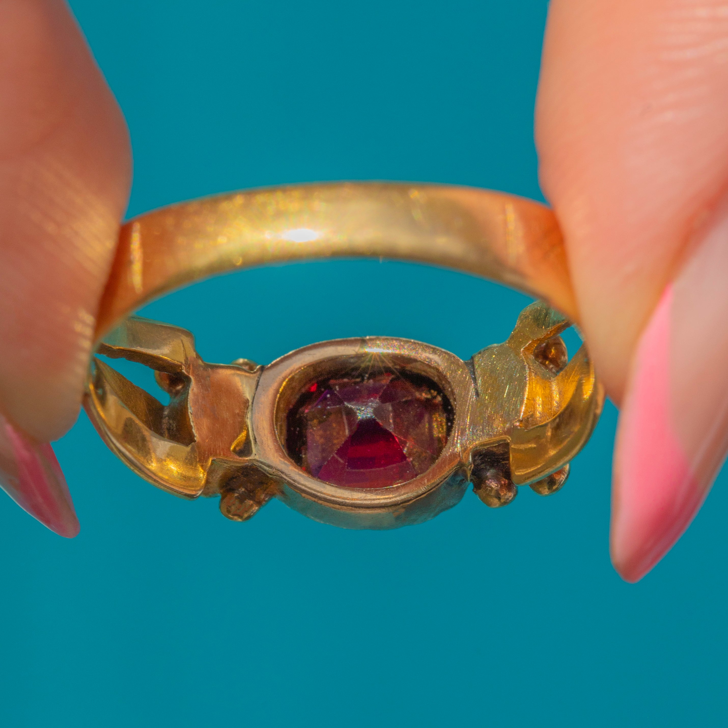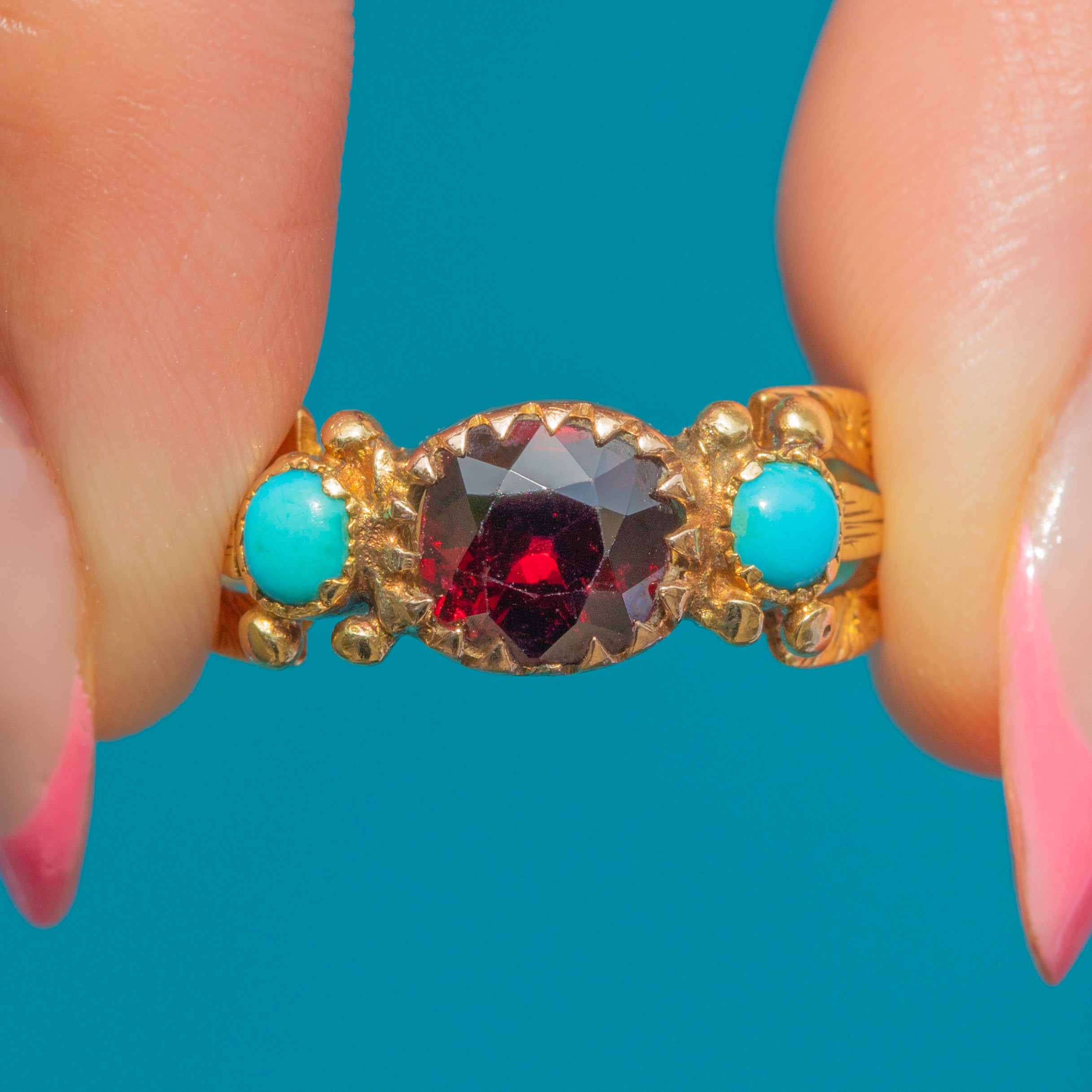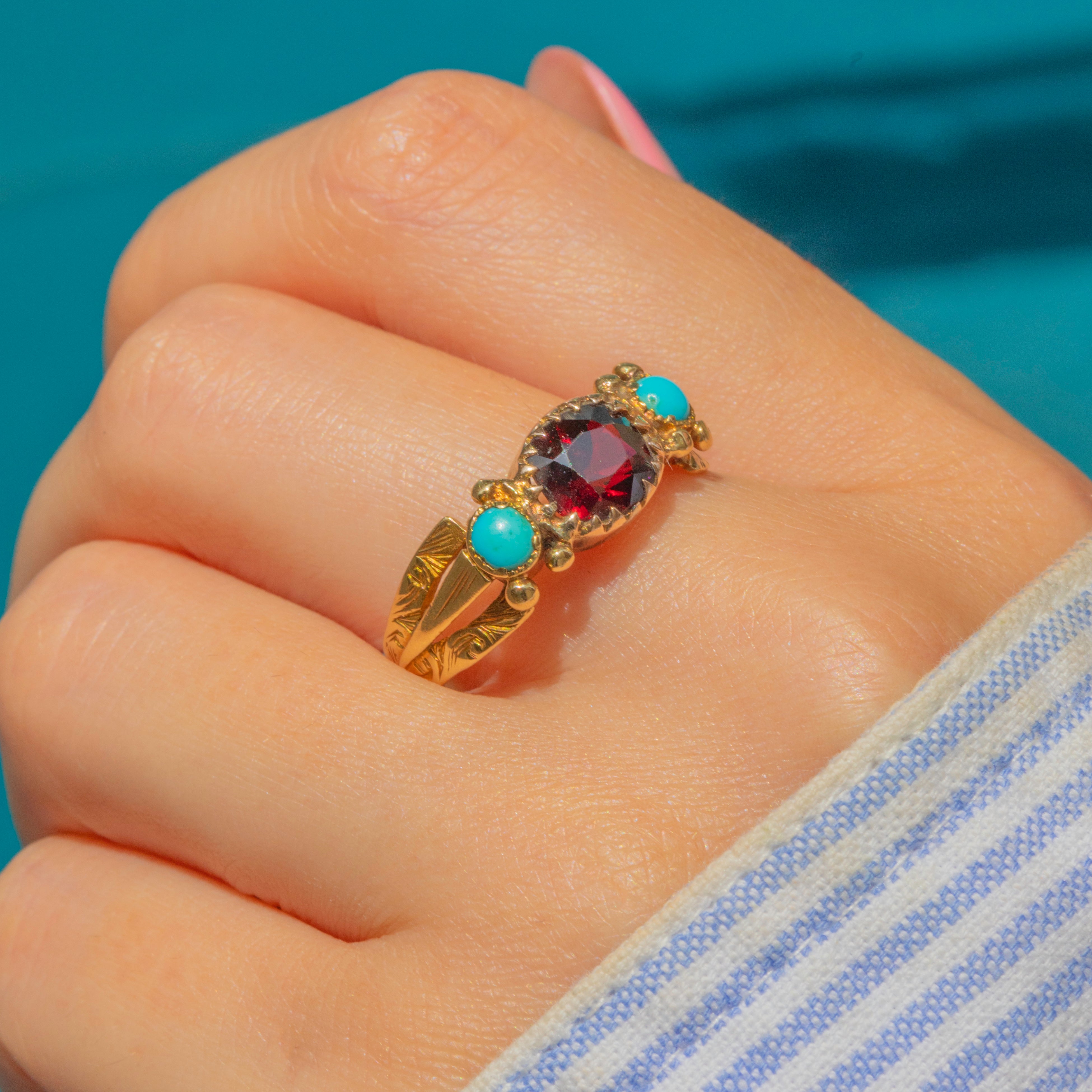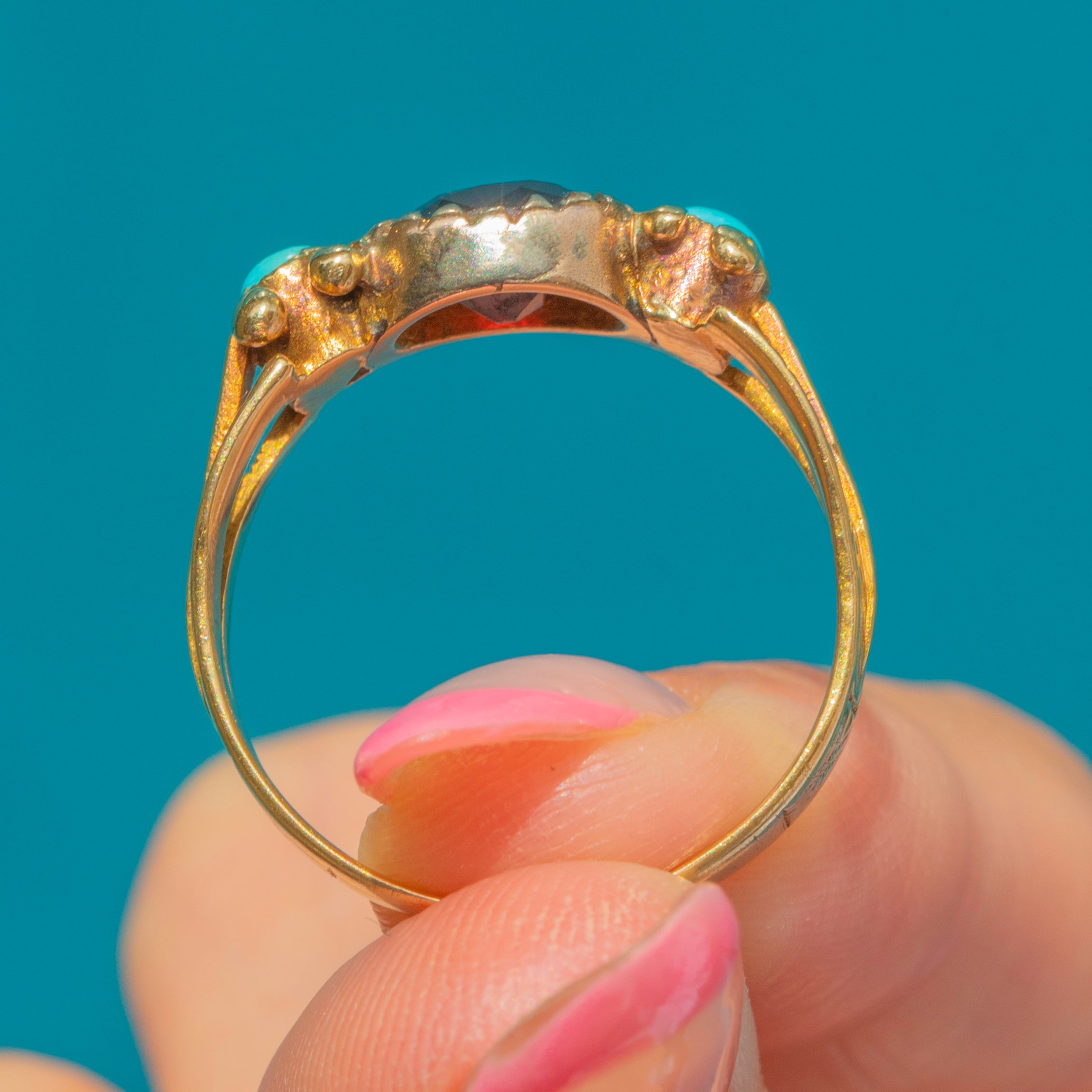 VERY GOOD. This antique 18ct Gold Garnet Turquoise ring is in very good condition. The Gold is brightly saturated, with only some discolouration on the inside of the band, likely from where someone has previously tested the purity of the Gold. The gemstones have all been wonderfully preserved, with no signs of surface wear present. There is one small claw missing from the Garnet setting, but it remains secure and doesn't affect the stone. The band is smooth and glossy, providing a comfortable fit and promising many more years of wear and enjoyment!