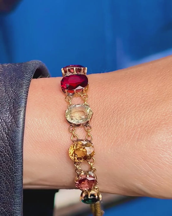 A fantastically beautiful antique 18ct Gold multi-gemstone harlequin multi-gemstone Riviere bracelet to brighten your attire! Comprised of nine gemstones, including Tourmalines, Sapphires, a Citrine and Garnet, this multi-gemstone bracelet is emboldened with glamour and Victorian charm.