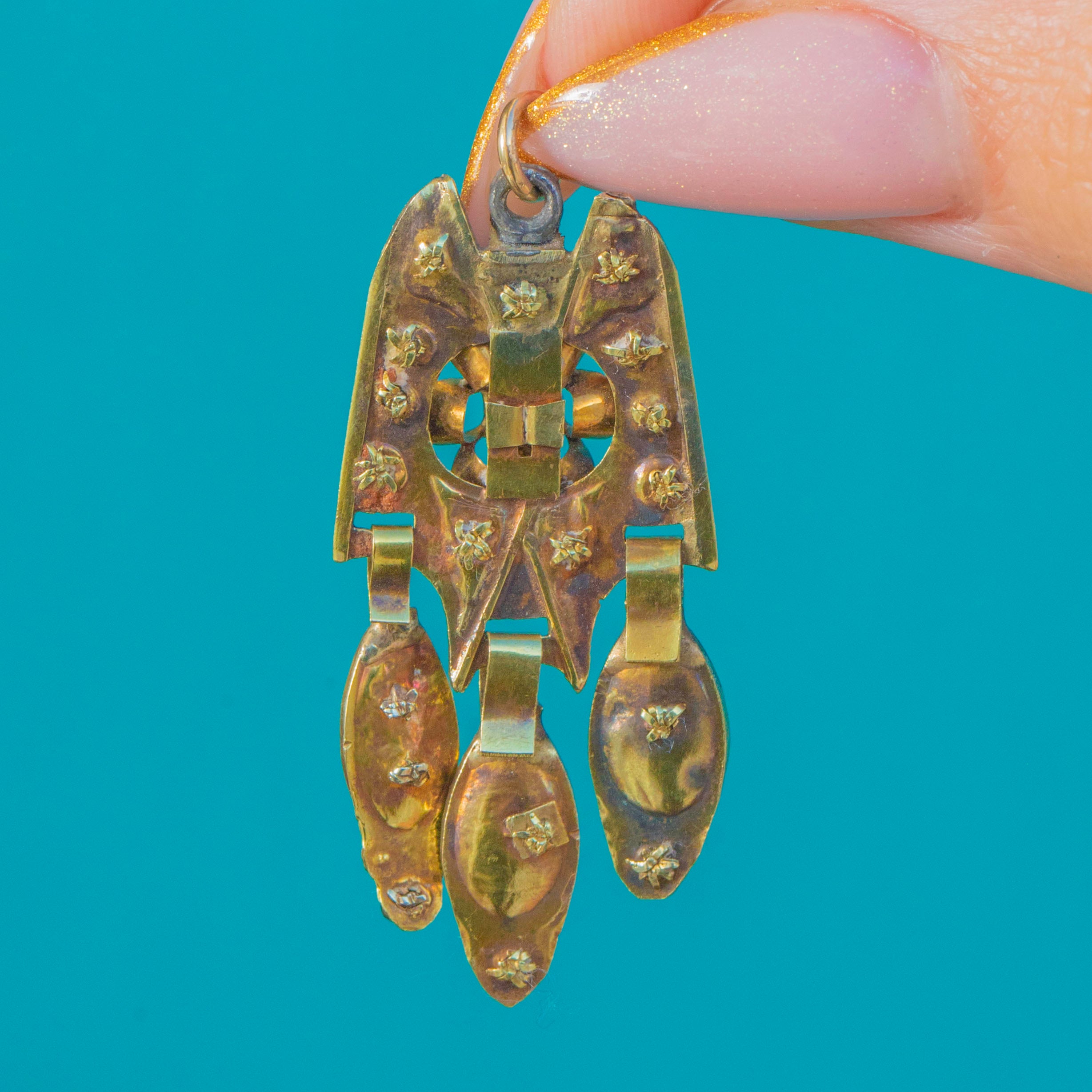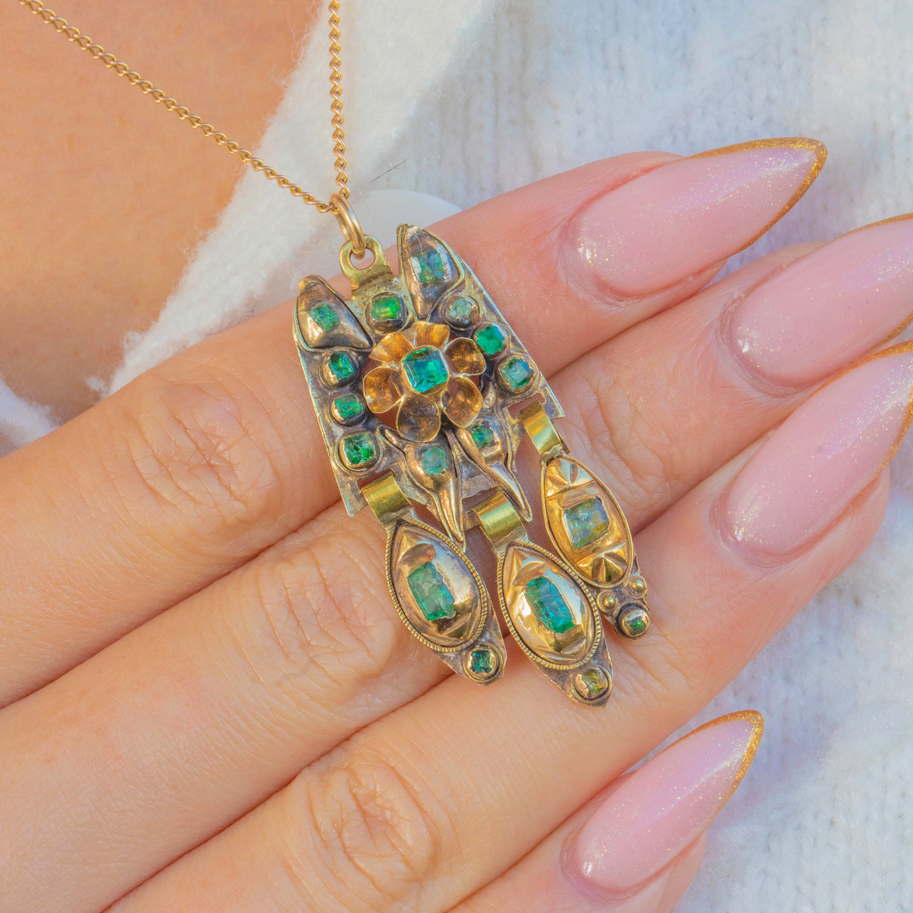 This striking 19th-century Iberian pendant showcases the bold, opulent styling characteristic of Iberian jewellery. Originally crafted as an earring, the pendant is made in rich high-carat Gold and set with vibrant natural Emeralds, each stone glowing with bright green colour and enhanced by traditional foiling behind the gems—an authentic historic technique that adds depth and radiance.