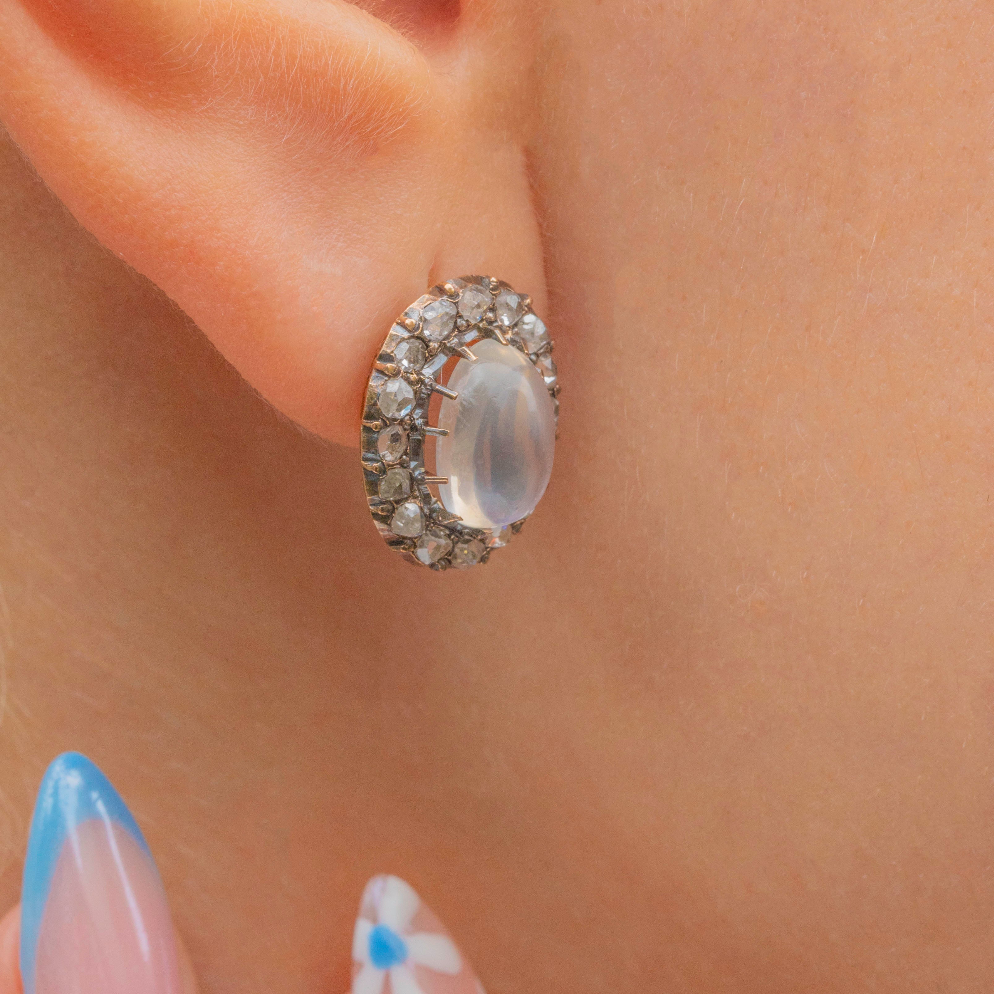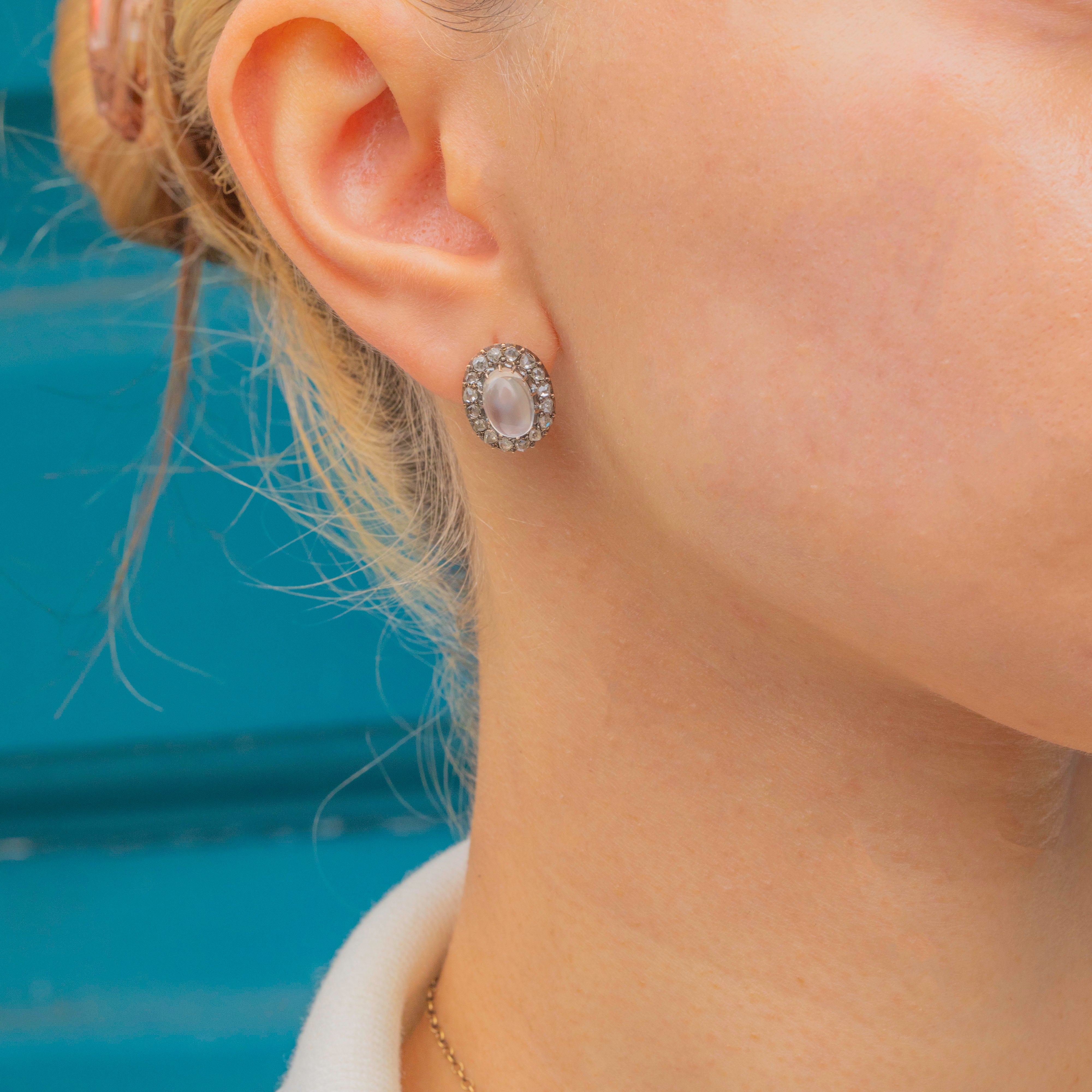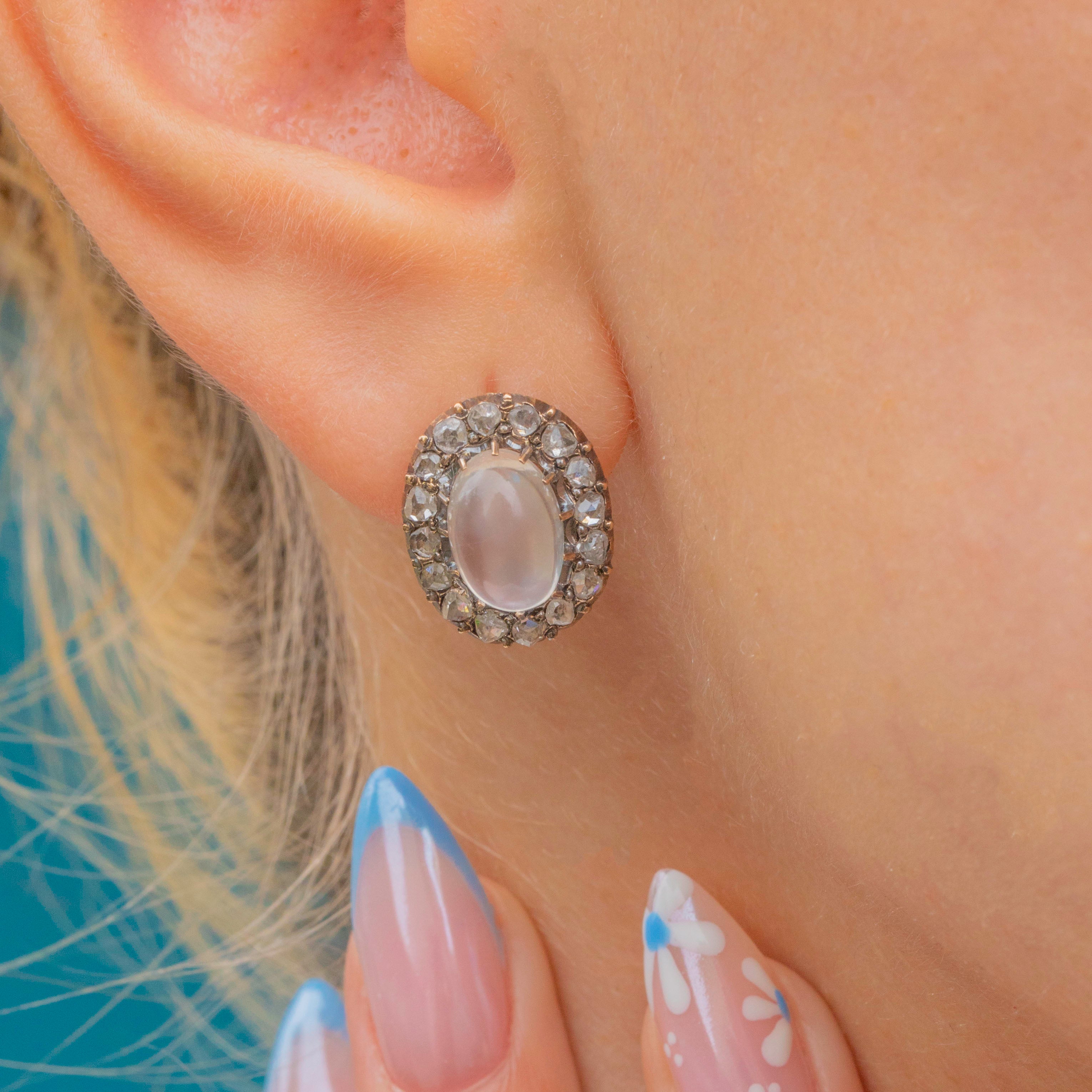 These Victorian stud earrings each feature a plump Moonstone cabochon, boasting 3.50cts combined, and radiating a magical adularescence as they billow the light. They are encircled by a halo of scintillating rose-cut Diamonds, set in glossy Silver to enhance their bright sparkle.