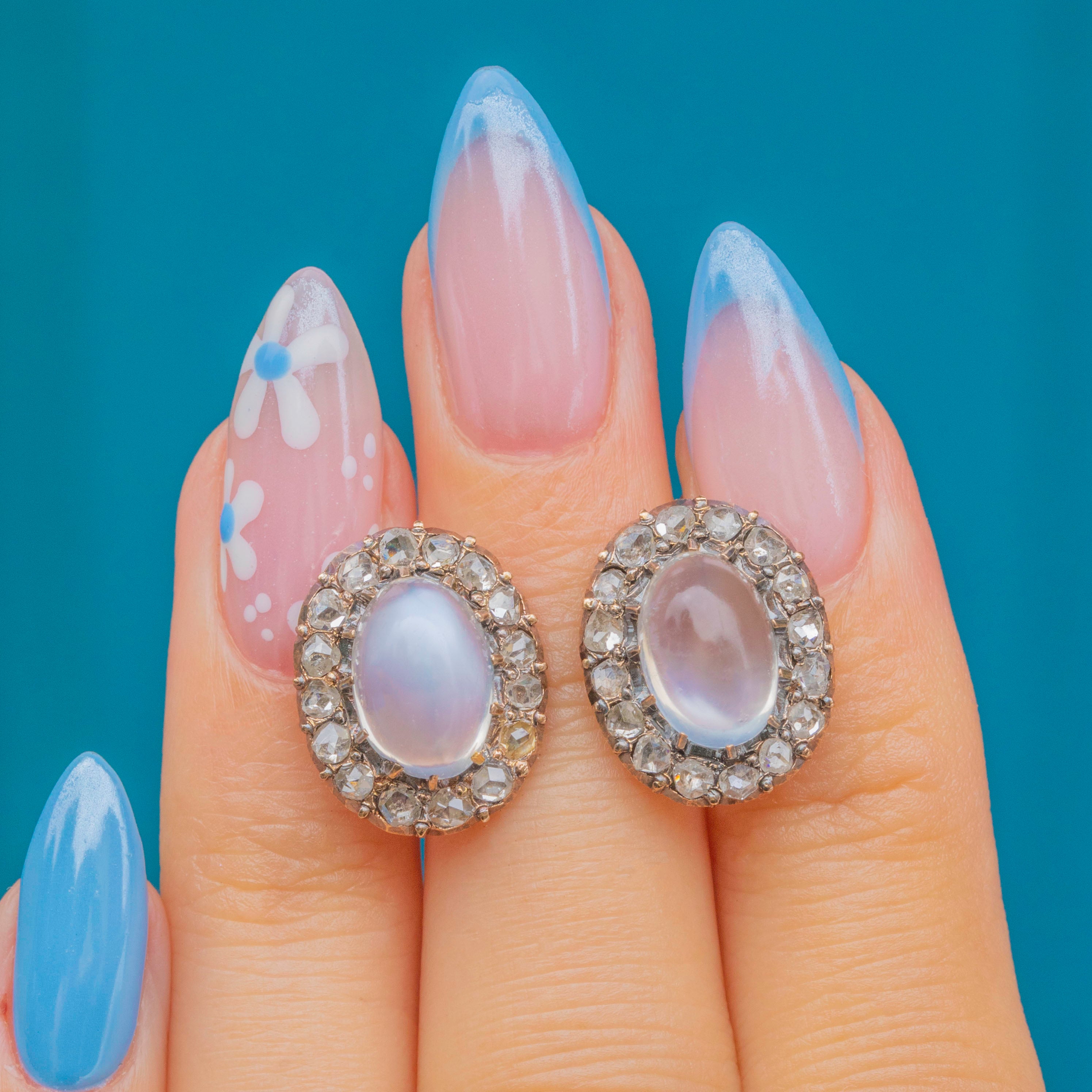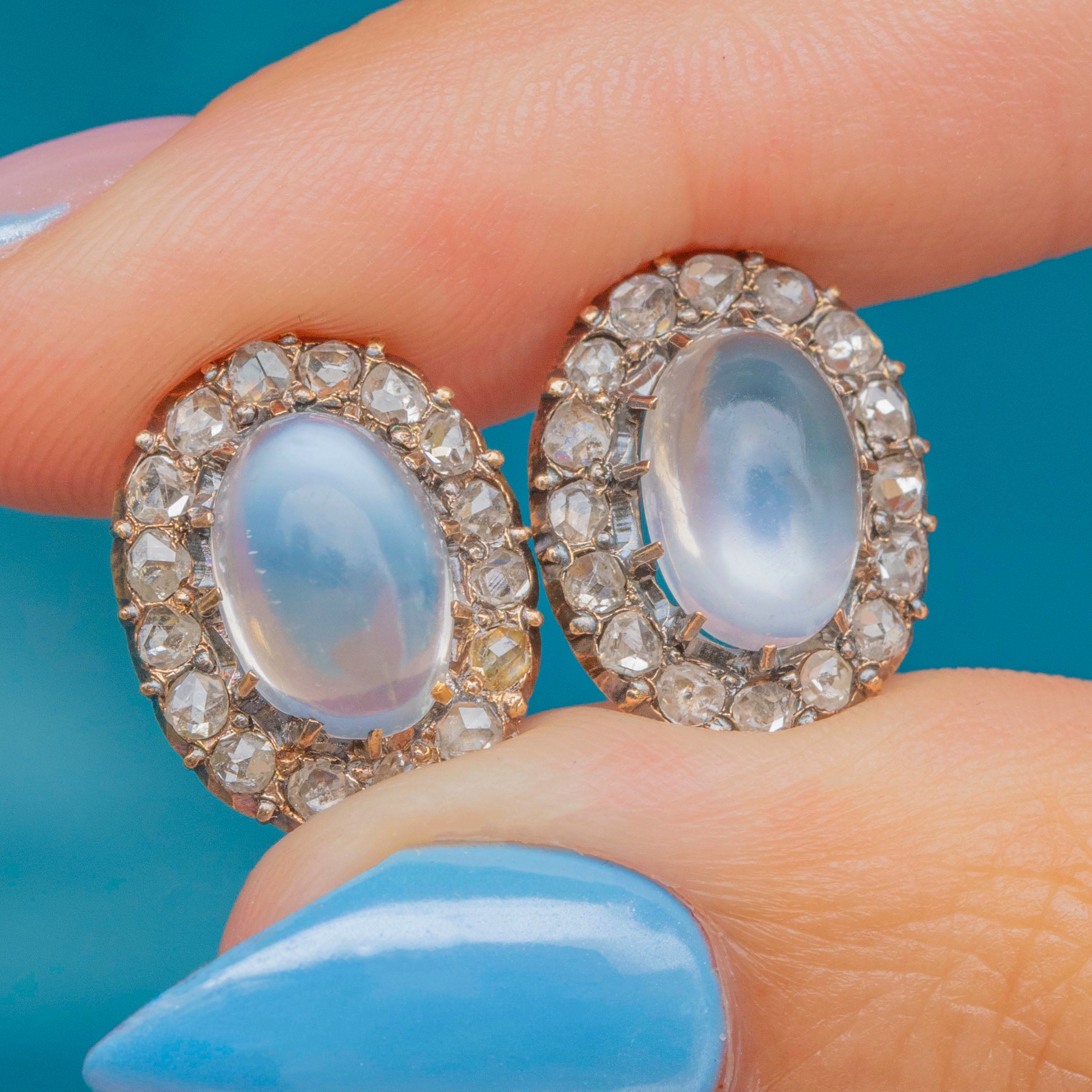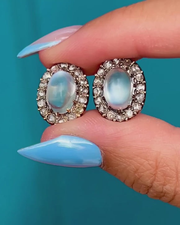 These Victorian stud earrings each feature a plump Moonstone cabochon, boasting 3.50cts combined, and radiating a magical adularescence as they billow the light. They are encircled by a halo of scintillating rose-cut Diamonds, set in glossy Silver to enhance their bright sparkle.