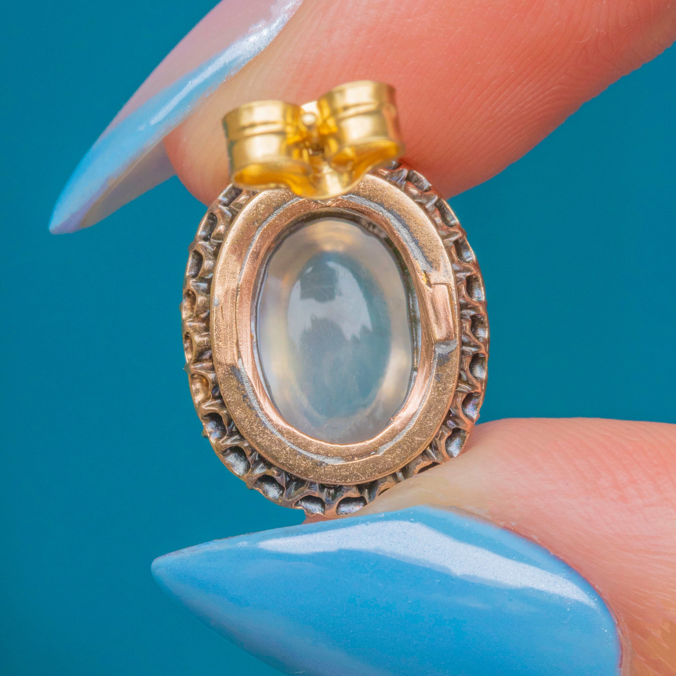 EXCELLENT: The Moonstones are free from any scuffs or scratches and set securely in their settings. The Diamonds are all present and free from chips or abrasions. With secure butterfly backs and little else to note, these Victorian earrings can be worn with utmost confidence.