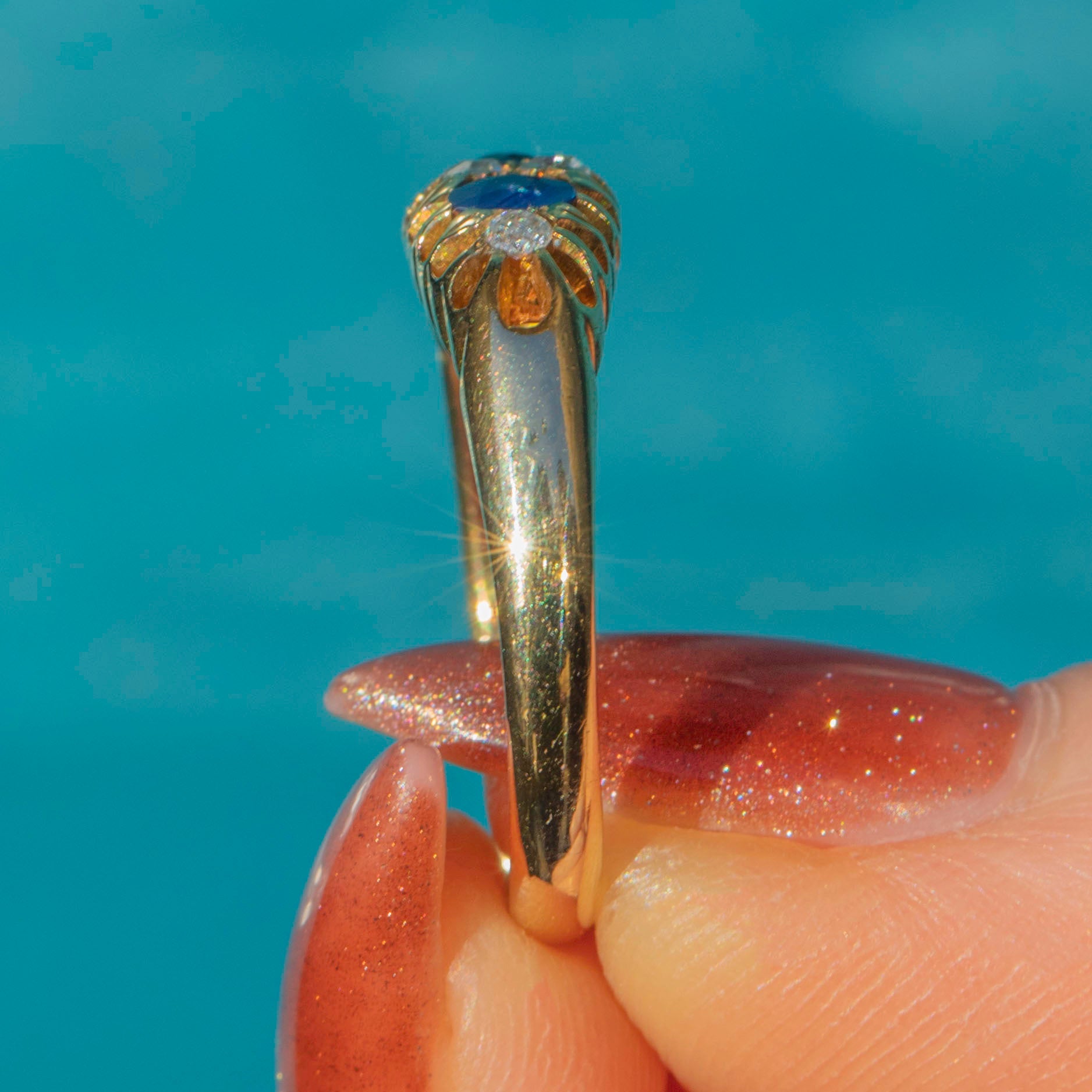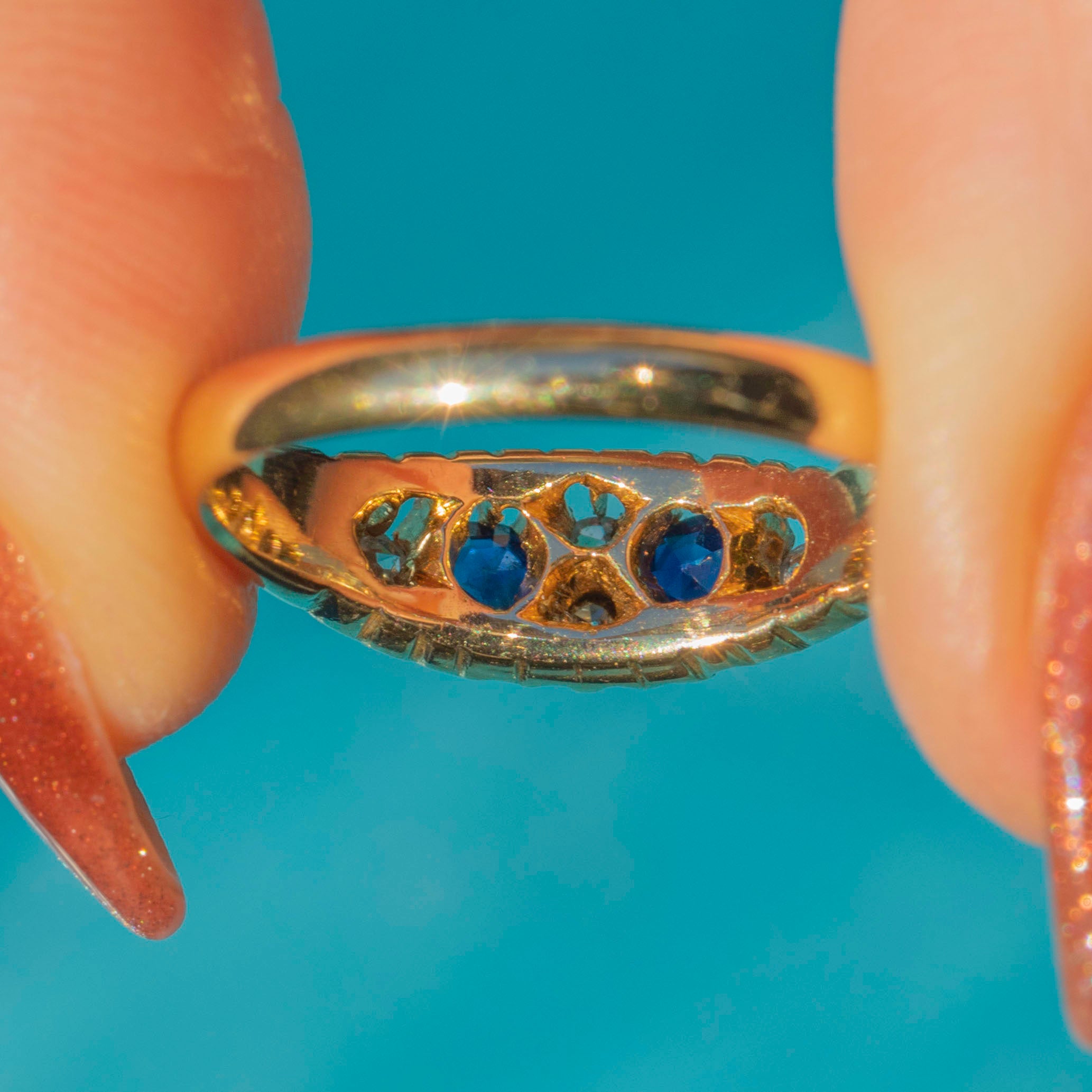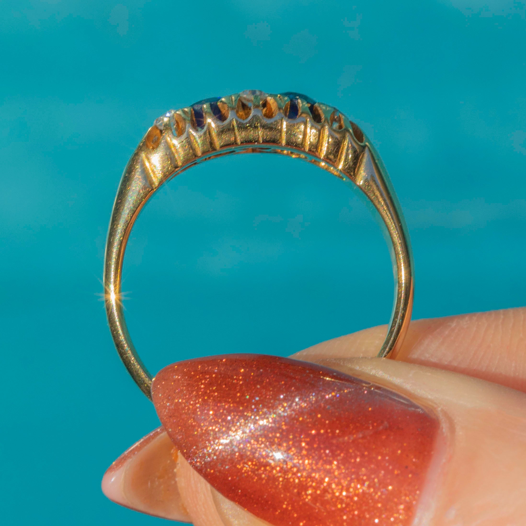 EXCELLENT. We are delighted to present this antique 18ct Gold Natural Sapphire Diamond boat ring in excellent condition. The gemstones are beautifully preserved, maintaining their natural sparkle, and the Gold band is smooth, allowing you to wear this 18ct Gold ring comfortably. This antique ring is a superb piece of history that can be enjoyed for many more years to come!