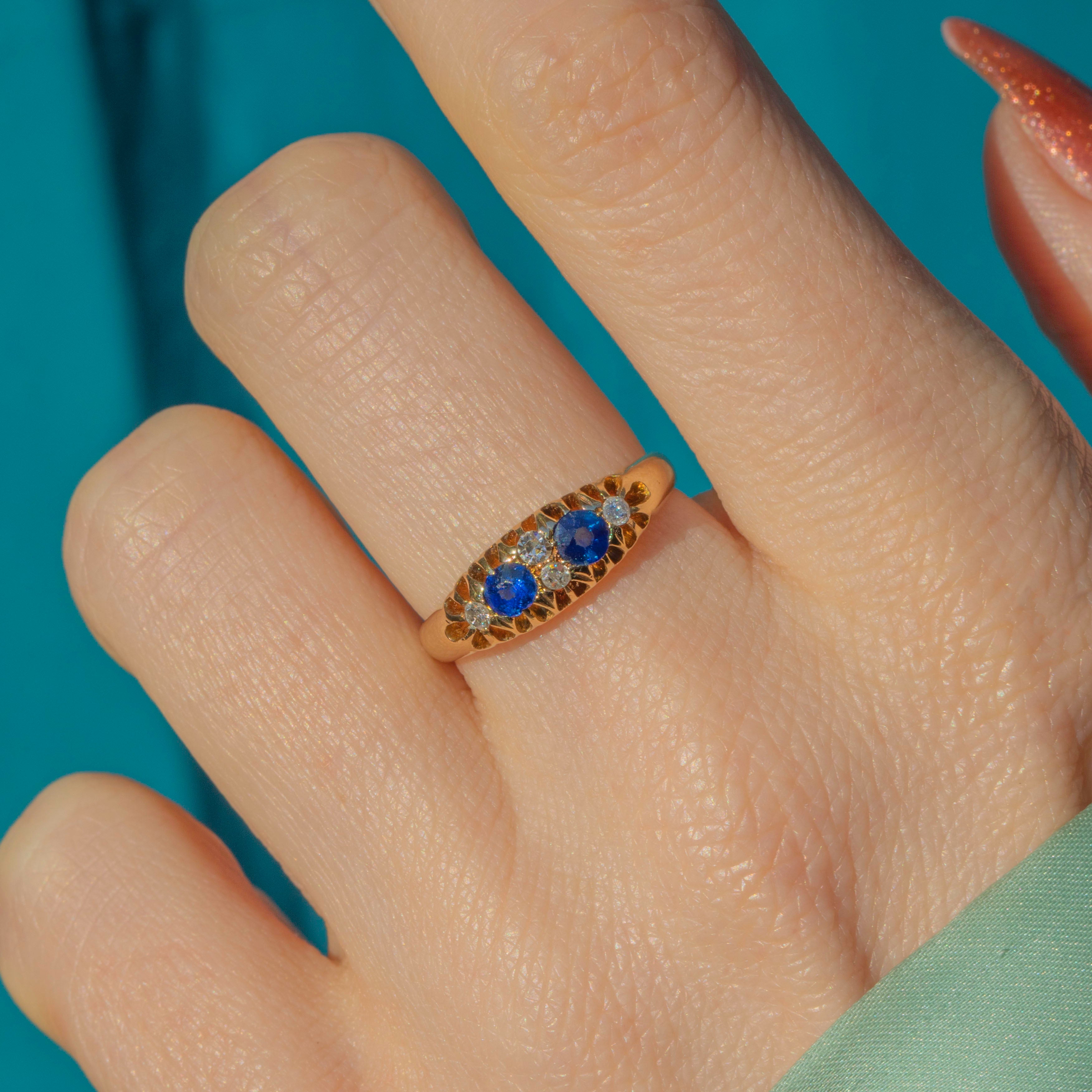 This antique 18ct Gold Natural Sapphire Diamond boat ring is a sweet piece. The Sapphires possess a midnight-blue hue and are accompanied by four twinkling Diamonds, creating an eye-catching piece ideal for everyday wear!