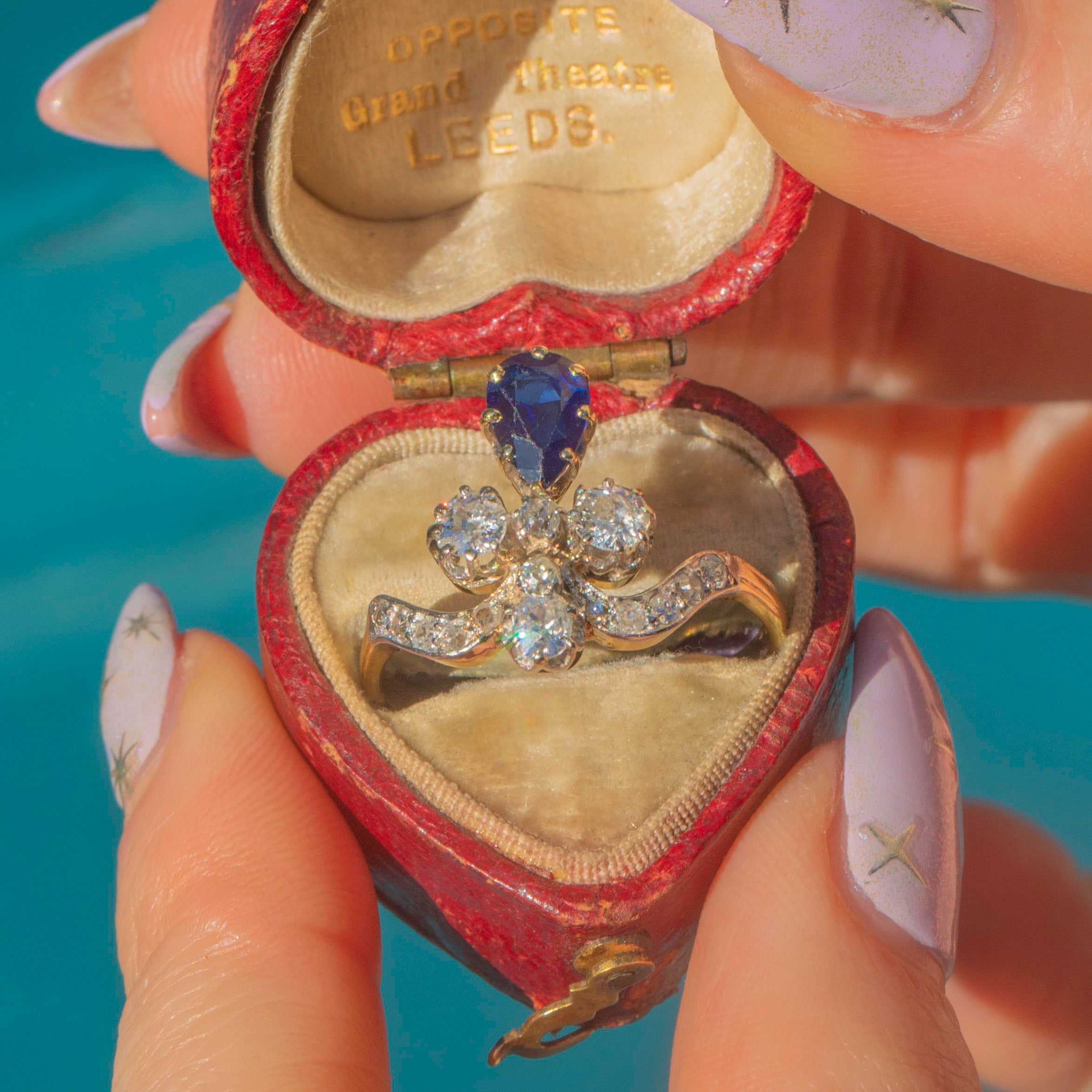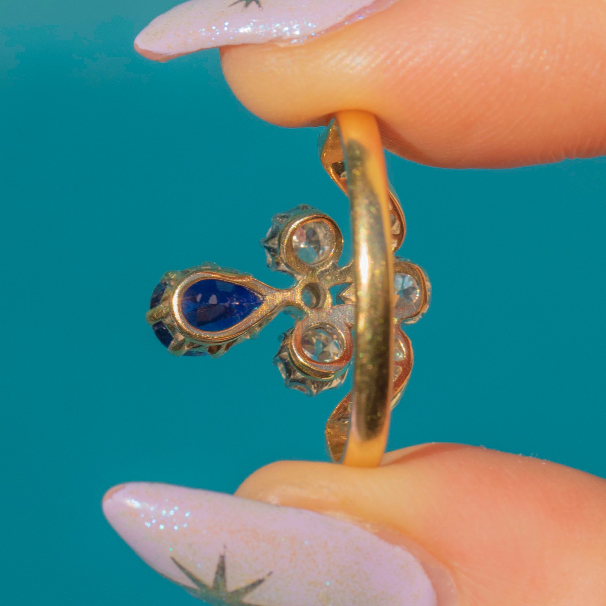 This exquisite antique 18ct Gold Sapphire & Diamond tiara ring is a true treasure, crafted in 18ct yellow Gold with elegant curves and intricate detailing. At her heart sits a stunning pear-cut 0.45ct Sapphire, her deep blue hue beautifully complemented by a sparkling array of Diamonds, totalling 0.75ct.