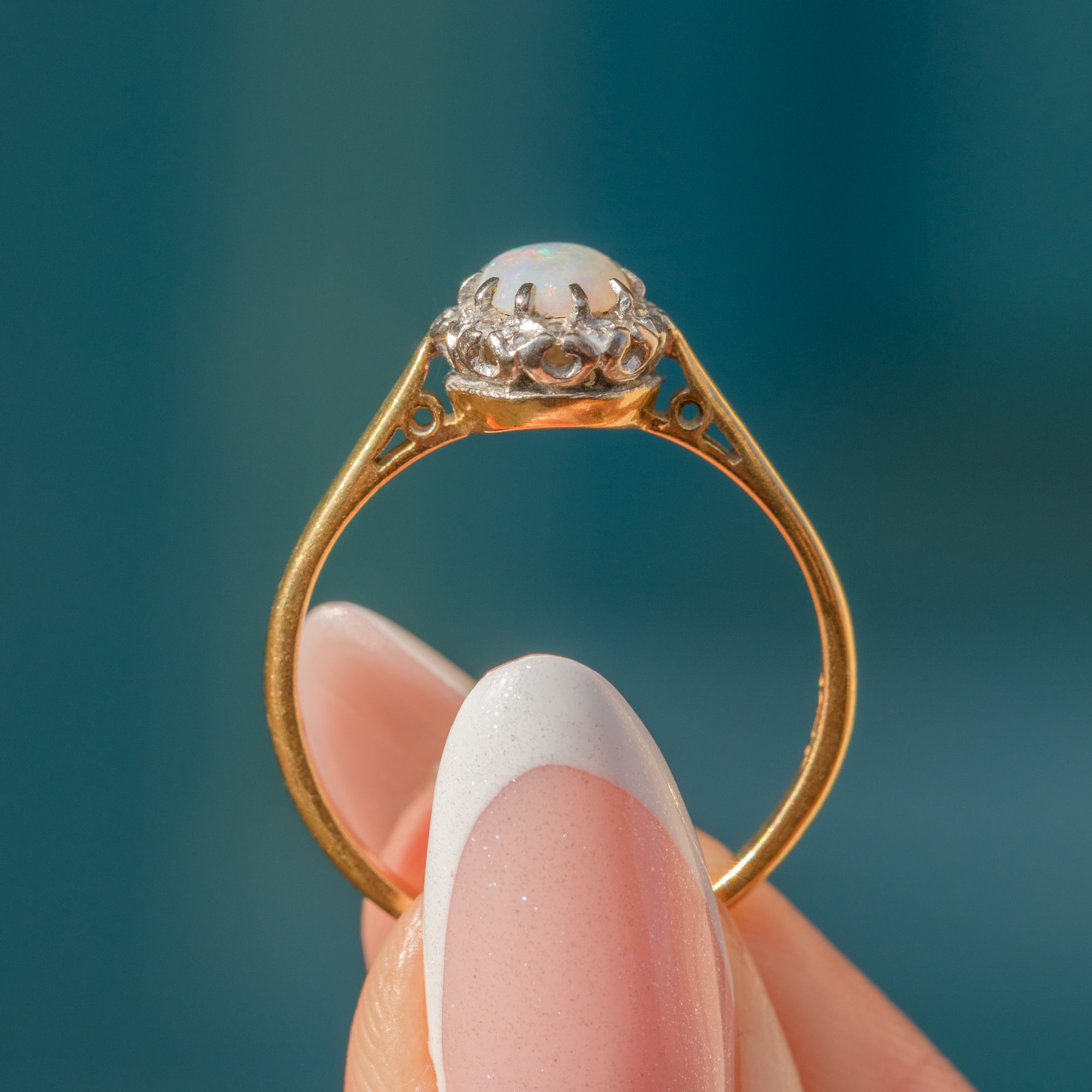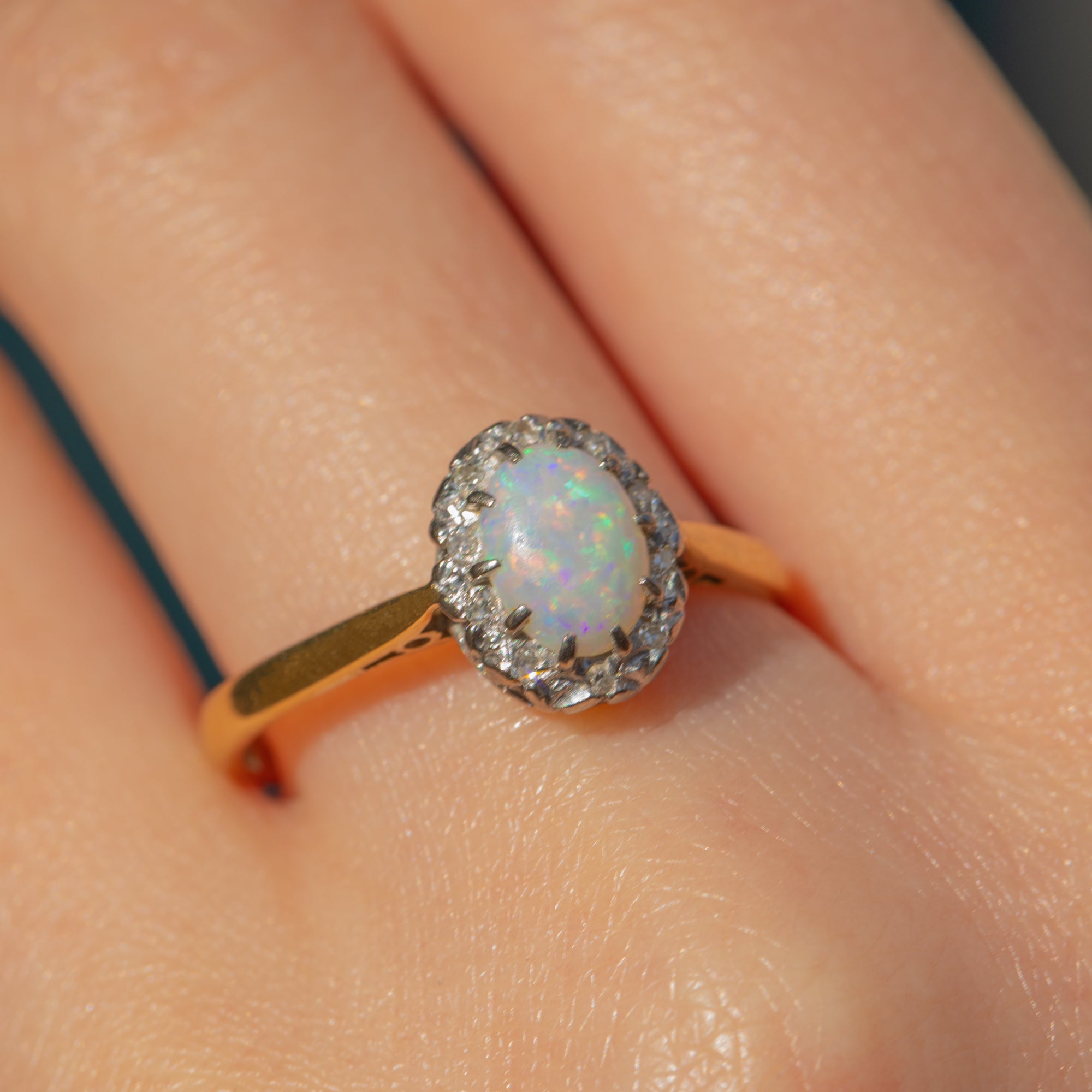 Antique 18ct Gold Opal Diamond Cluster Ring, 0.29ct Opal