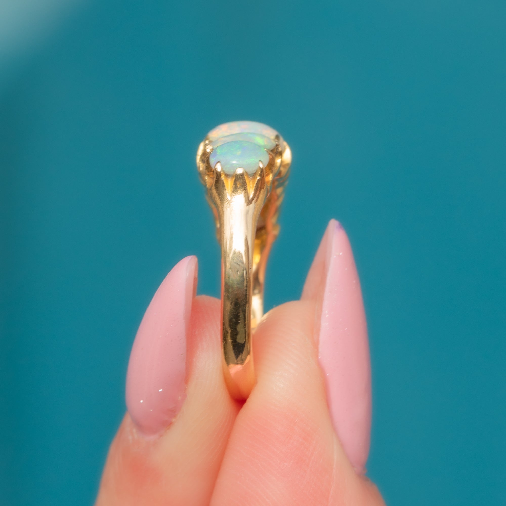 Her 18ct Gold band is buttery and possesses an alluring glow, with settings that provide a perfect throne for the iridescent natural solid Opals. Showcasing a spellbinding confetti display of vibrant greens, soft blues and pinks, each Opal is whimsical and thrives beneath the light, enchanting anyone who lays eyes on this spectacular Victorian ring!