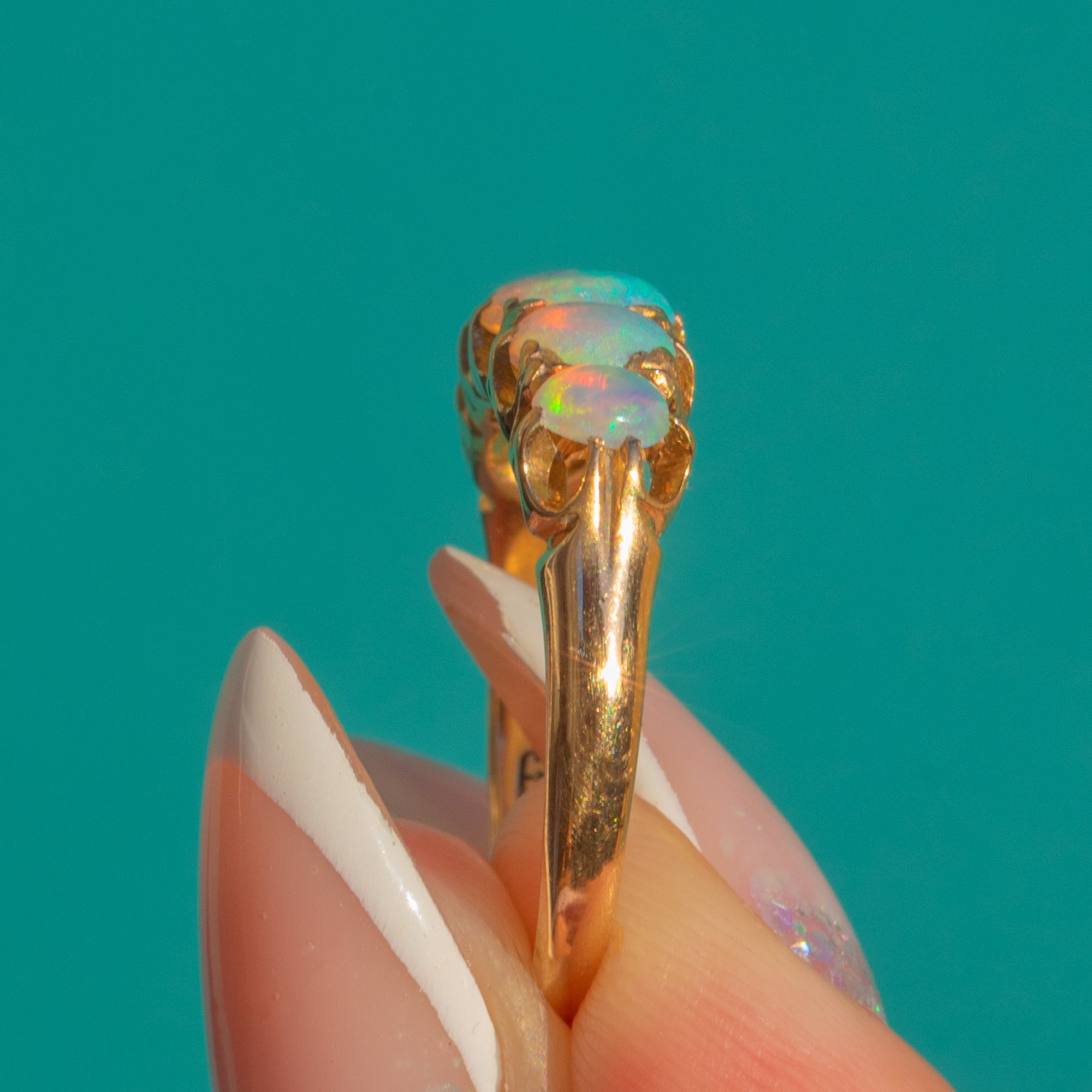 EXCELLENT: The Opals are securely set and in excellent condition with no chips, cracks or noticeable surface wear. The 18ct Gold band and carved gallery are crisp with only minimal light wear in line with age. This ring has clearly been well cared for.