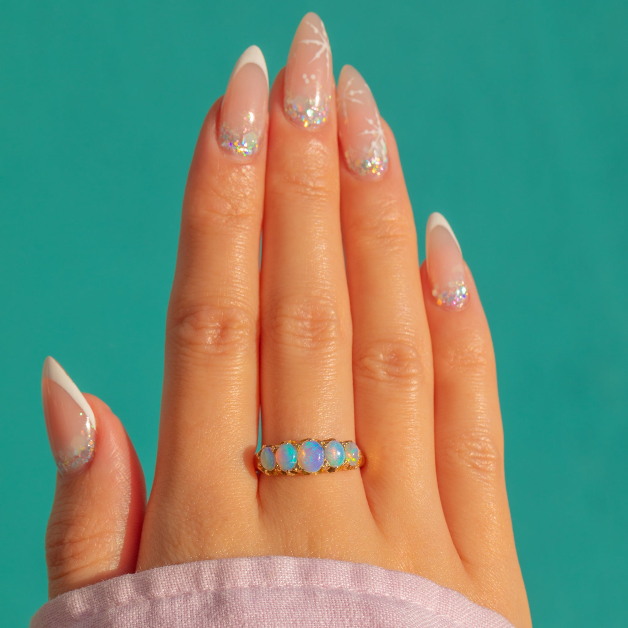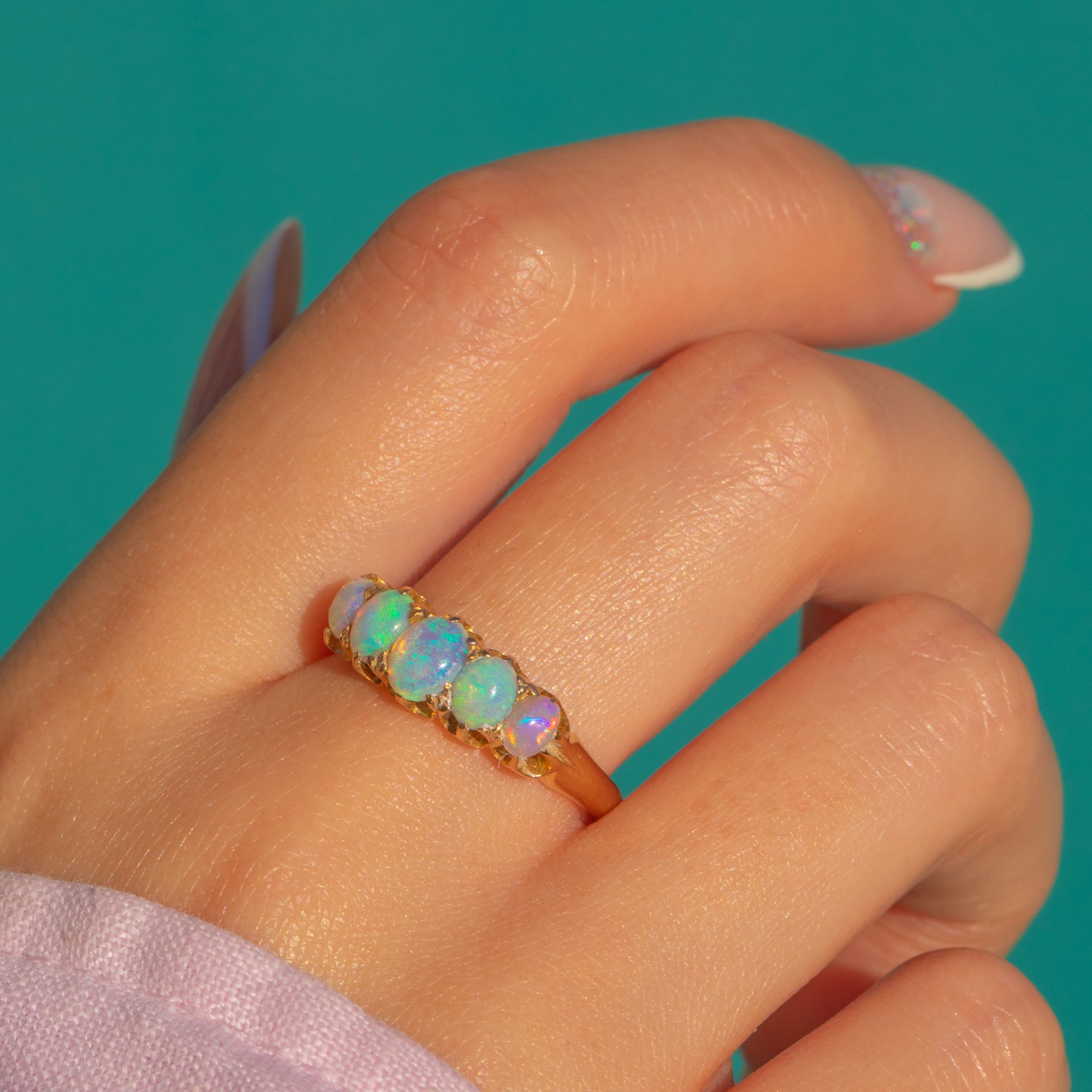 This Edwardian five stone Opal ring is a beautifully romantic piece, set with glowing natural solid Opals in a classic carved 18ct Gold gallery. The graduating Opals shimmer with soft flashes of colour, creating a lovely, fluid line of light across the finger.