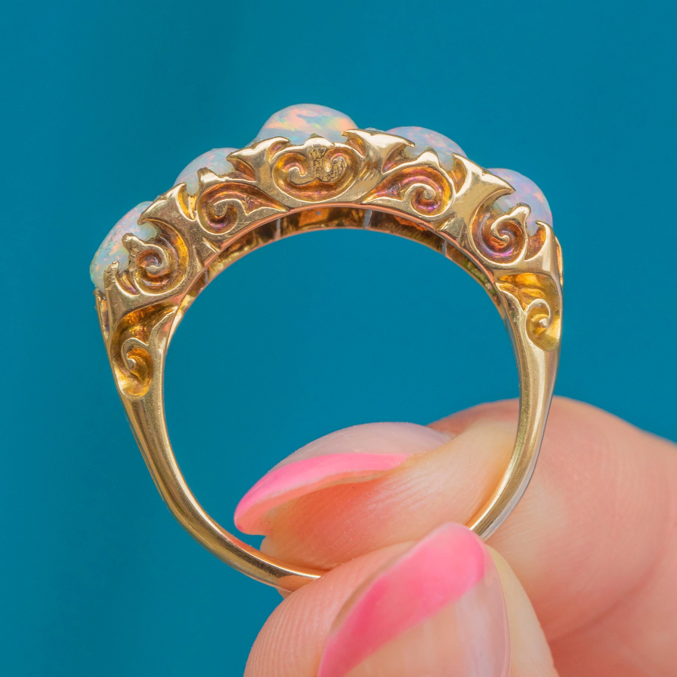 Five vivid Opals spread proudly across your finger, like cabochons carved from the depths of the aurora borealis, held up proudly by an ornately engraved gallery. Eight rose-cut Diamond spacers twinkle brightly, creating a lively display as this superb ring catches the light.