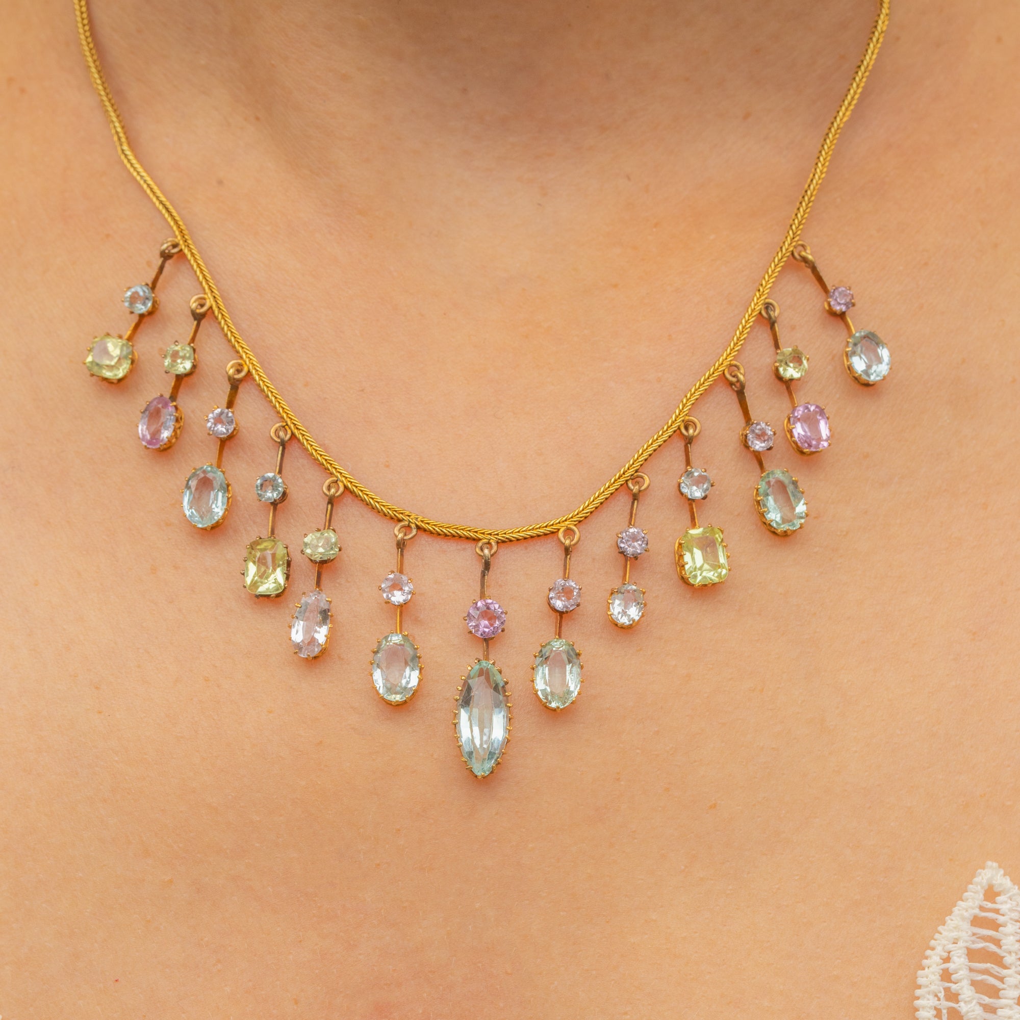 This resplendent Victorian necklace suspends a myriad of soft pastel gemstones, comprised of Pink Topaz with a soft lilac hue, icy blue Aquamarine, and cool chartreuse Chrysoberyl stones.