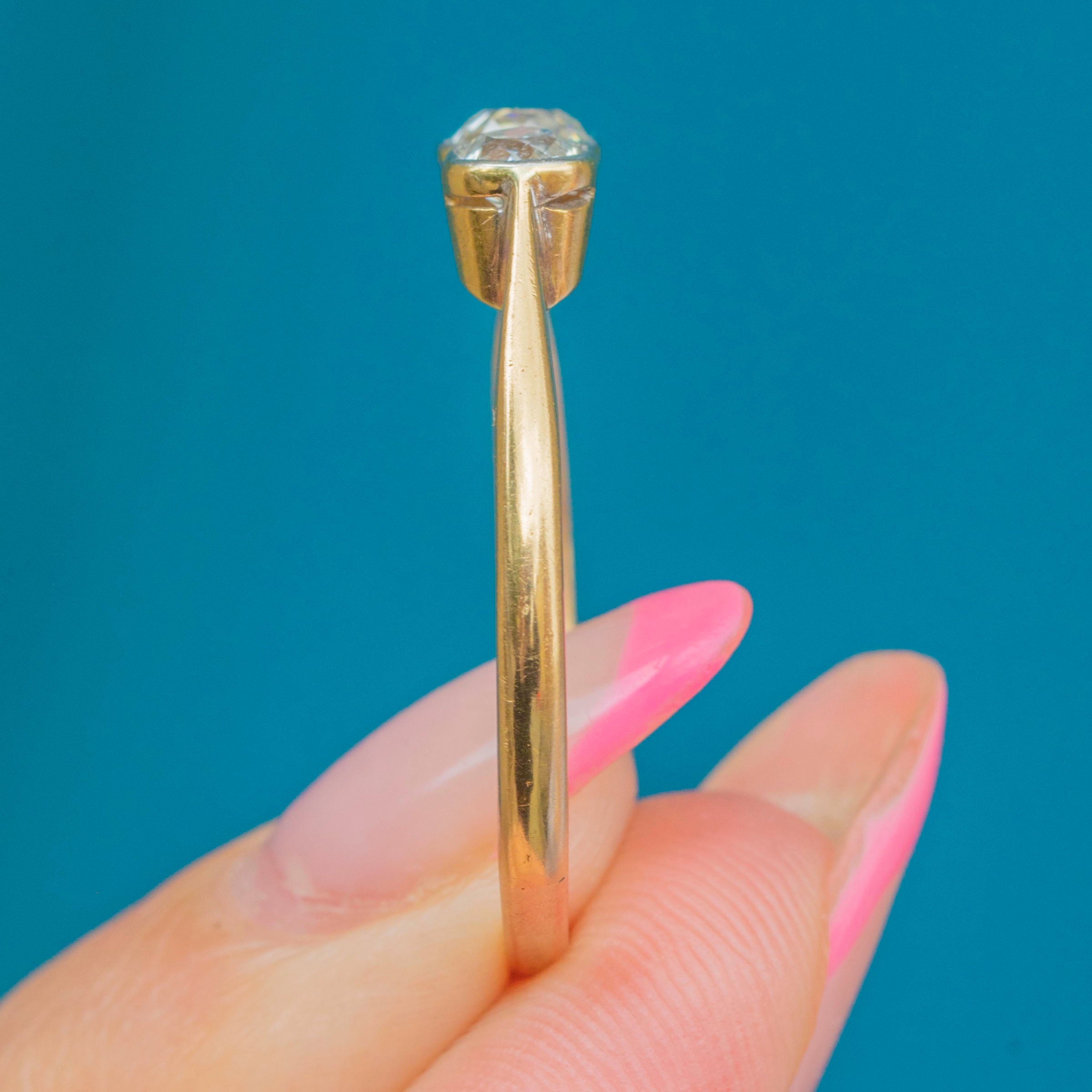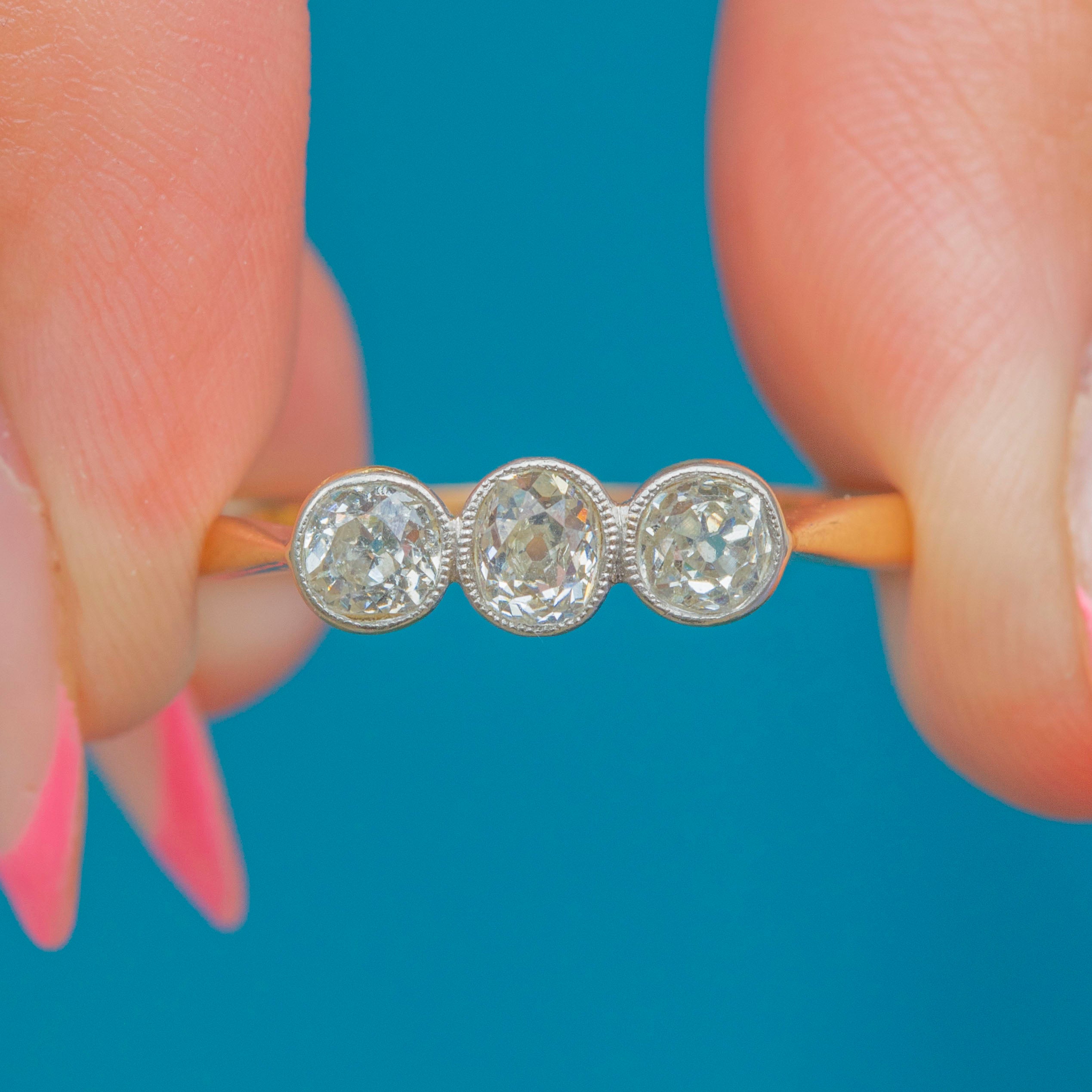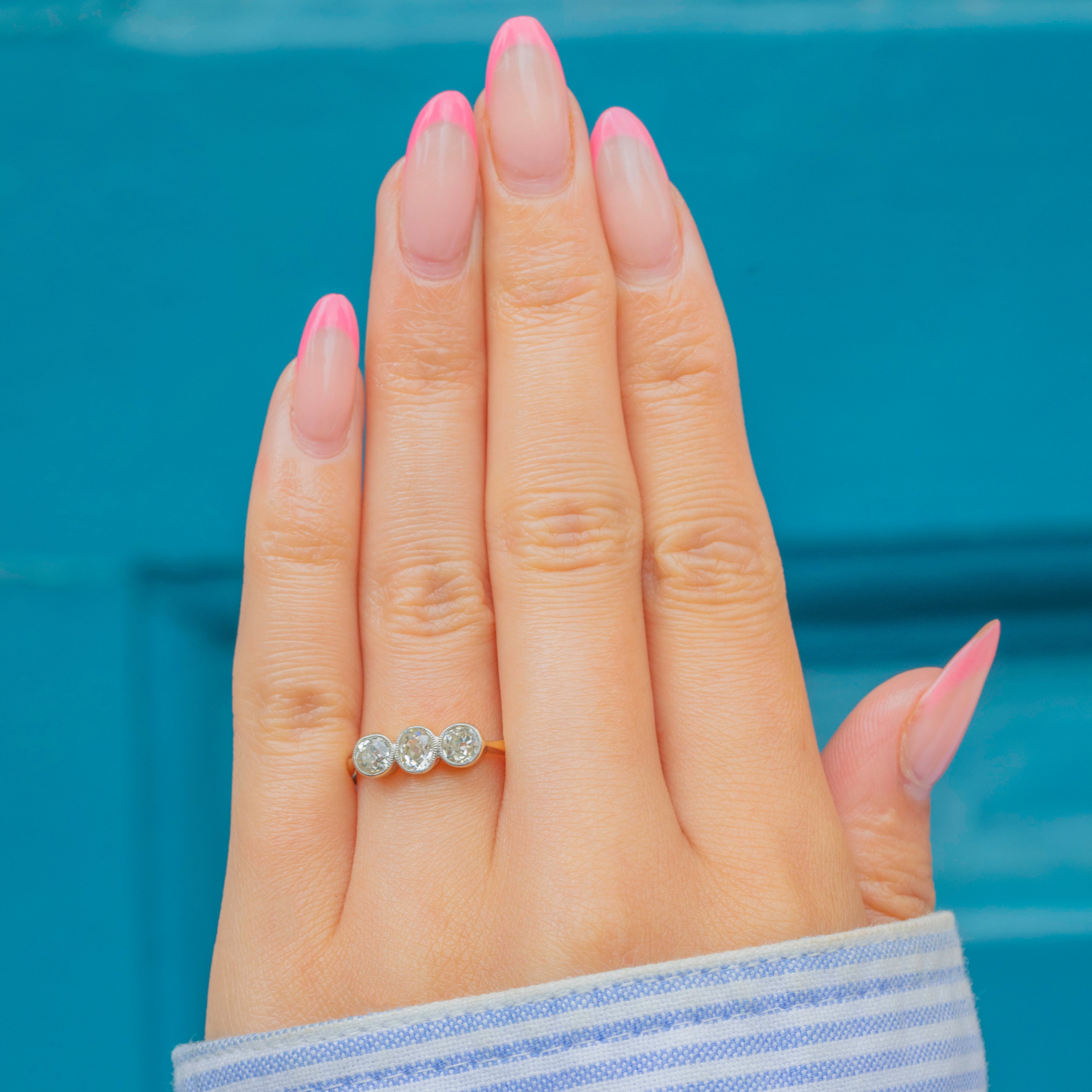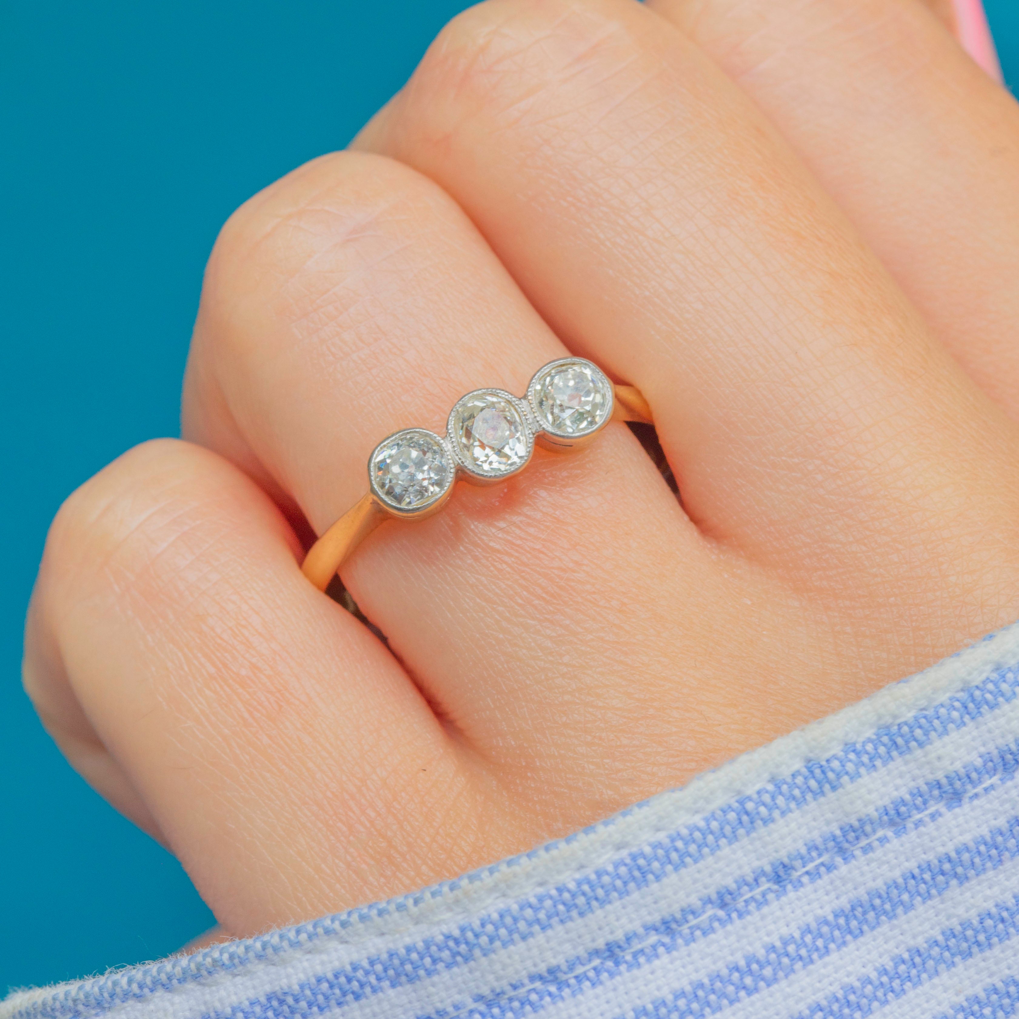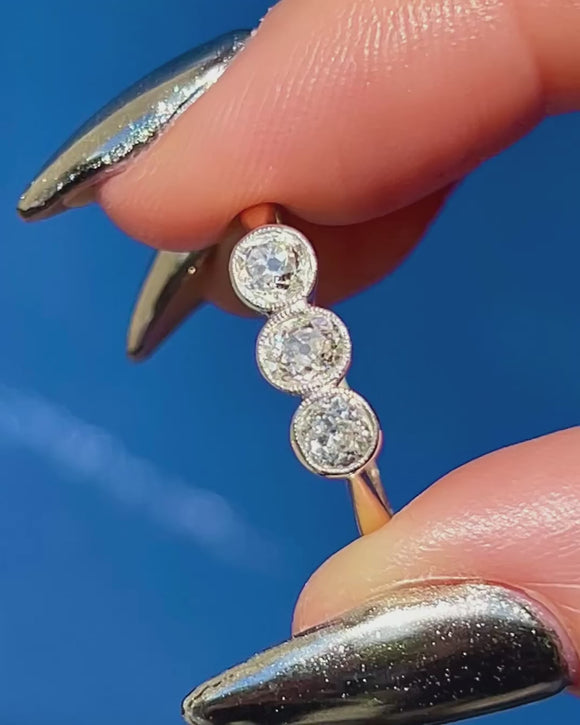 Weighing 0.54ct combined, this Art Deco ring flaunts three fabulous old-Mine cut Diamonds, each with a distinct scintillation. They are each set within lustrous Platinum bezels and rest on a buttery 18ct Gold band, making this antique Diamond ring ideal for everyday wear.
