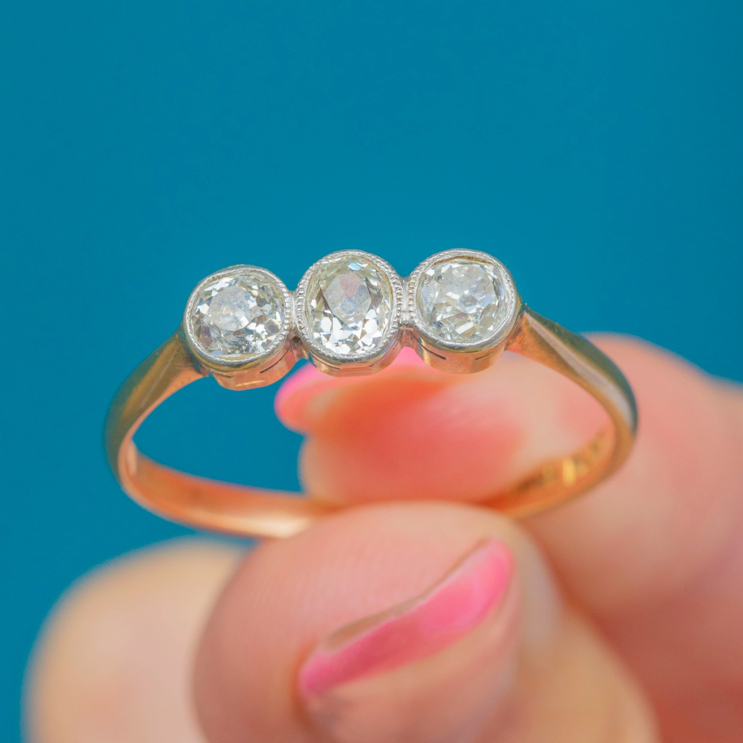 A fabulous antique 18ct Gold & Platinum bezel-set old-mine-cut Diamond trilogy ring!