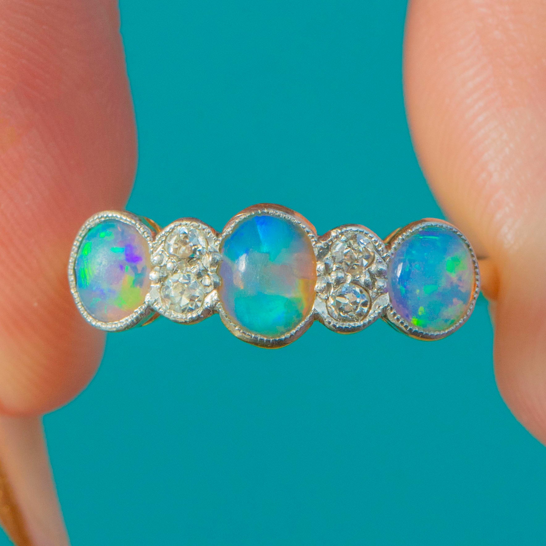 VERY GOOD: The Opals display attractive flashes and are free from chips or cracks. Diamonds are secure and bright. Platinum millegrain settings remain crisp with light age-consistent wear. The Gold band shows minimal wear and retains a strong shape. A well-preserved Edwardian ring ready for everyday enjoyment.