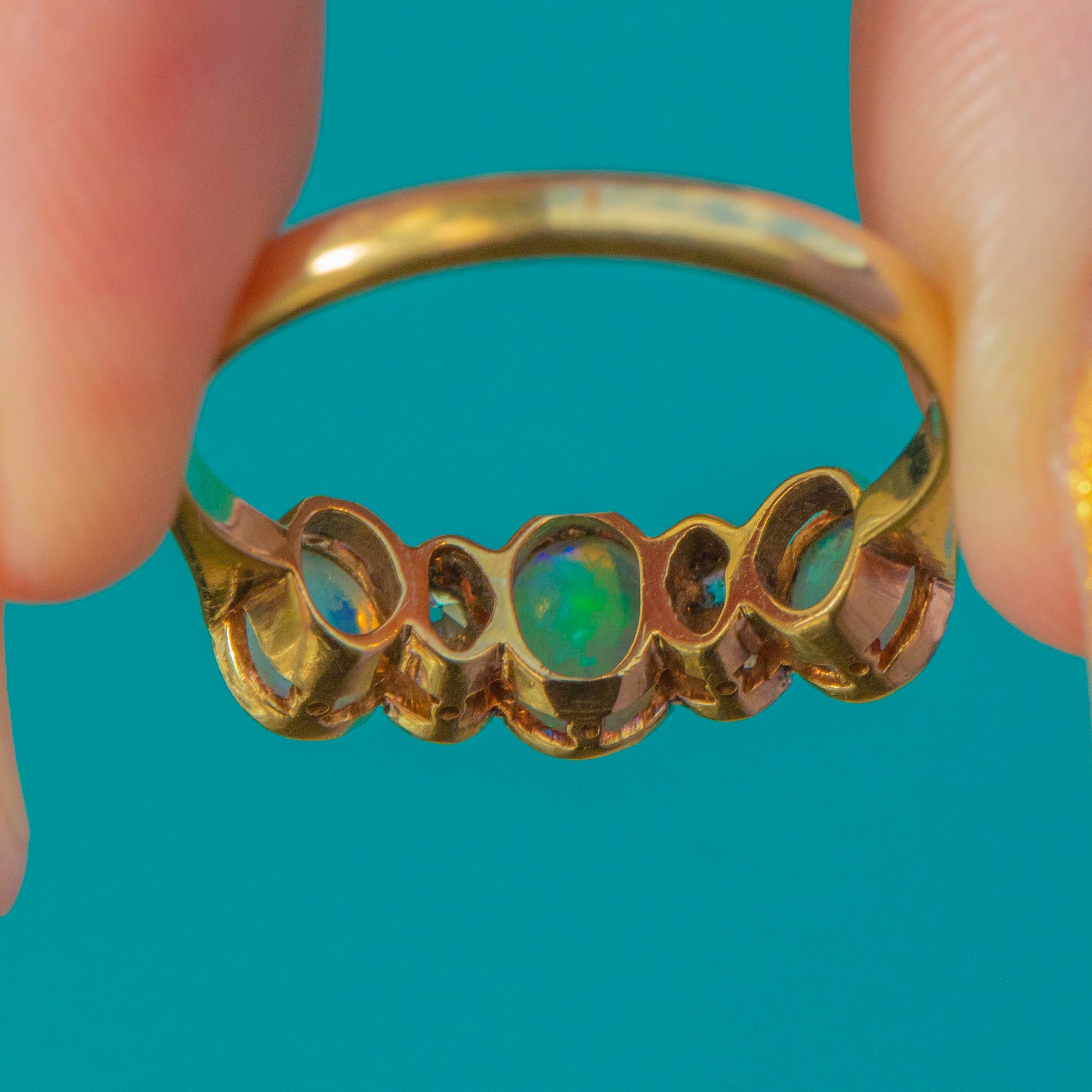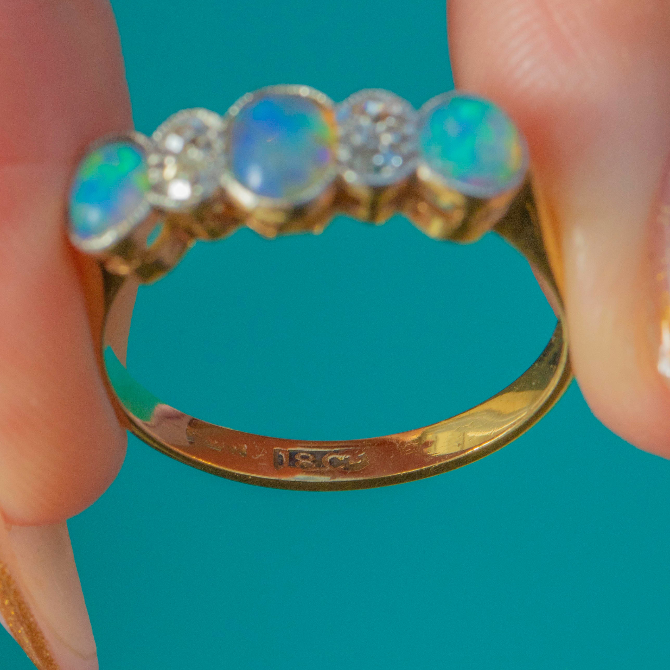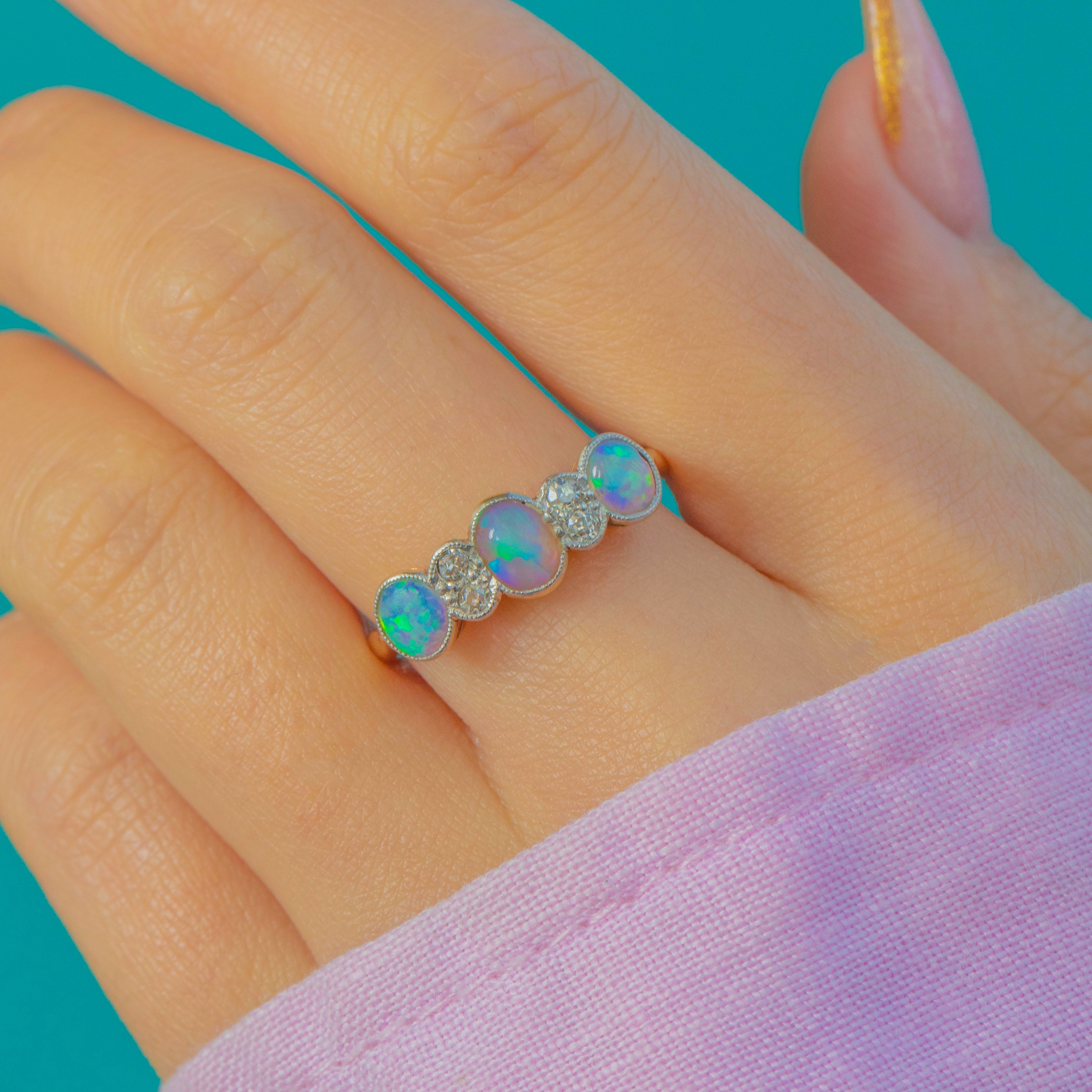 A beautiful Edwardian stacking ring crafted in rich 18ct Yellow Gold with elegant Platinum millegrain settings. This romantic seven-stone design features three natural solid Opal cabochons glowing with fiery pastel flashes, spaced by four bright Old Mine Cut Diamonds for a touch of antique sparkle. Delicate, feminine and wonderfully wearable, it’s a classic early 20th-century look.