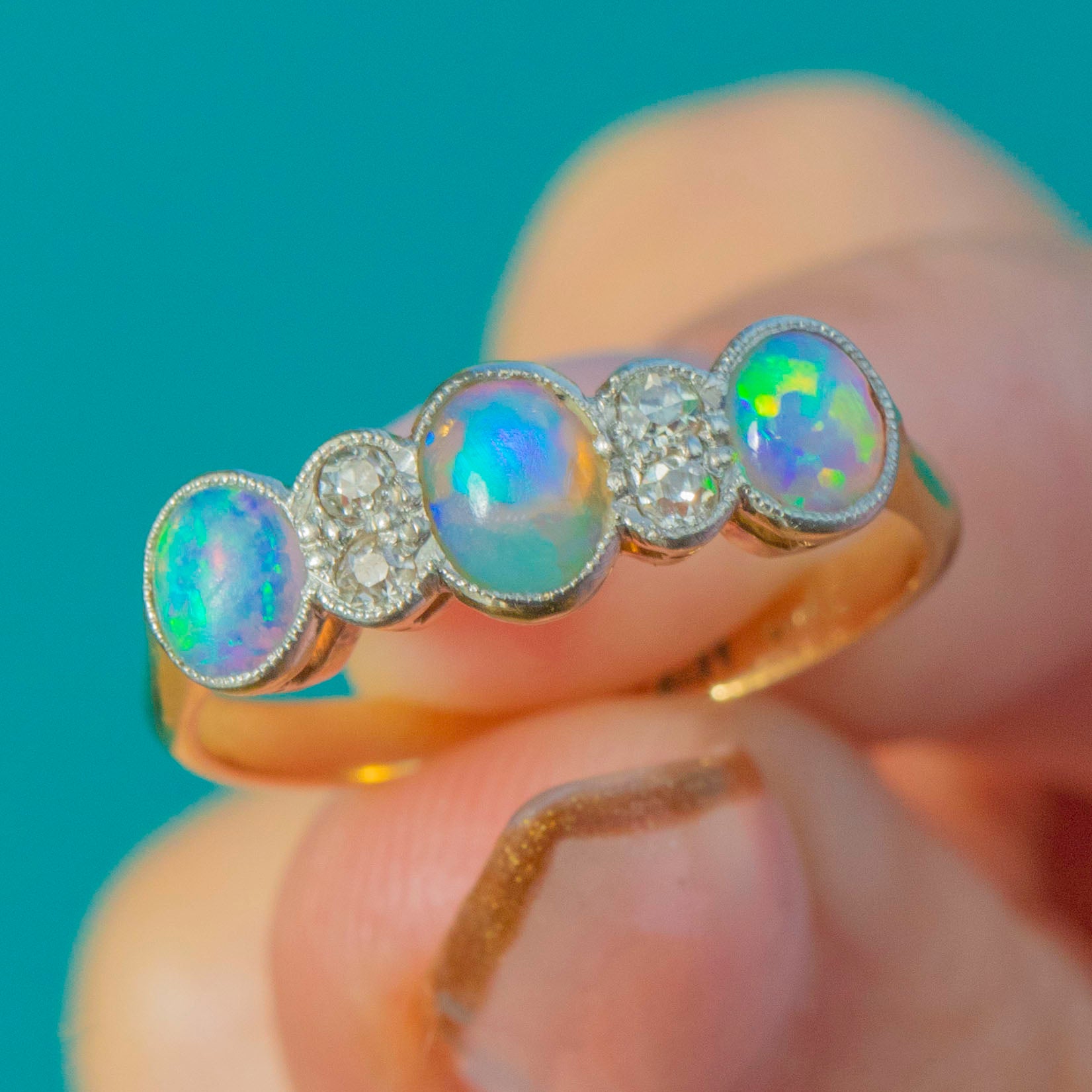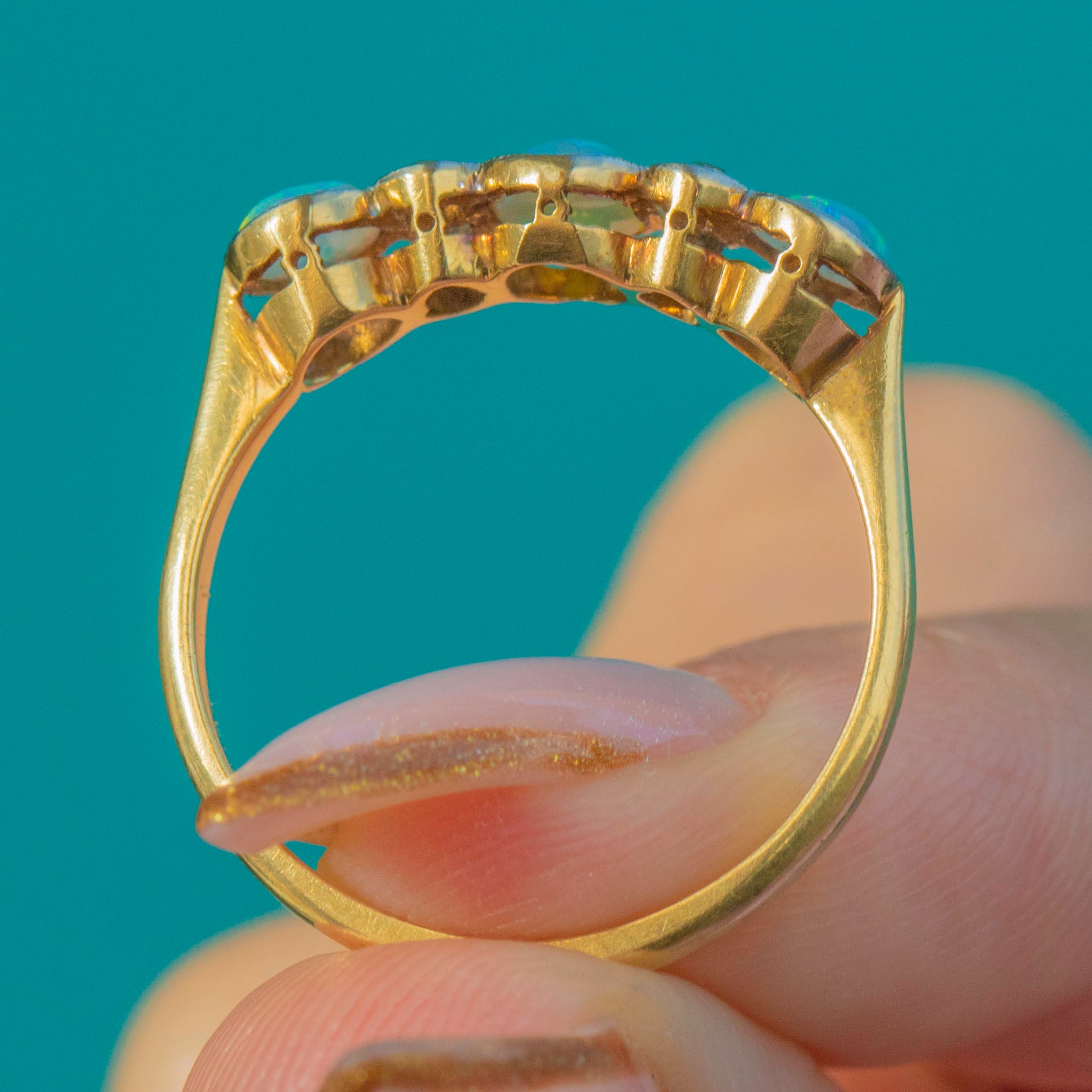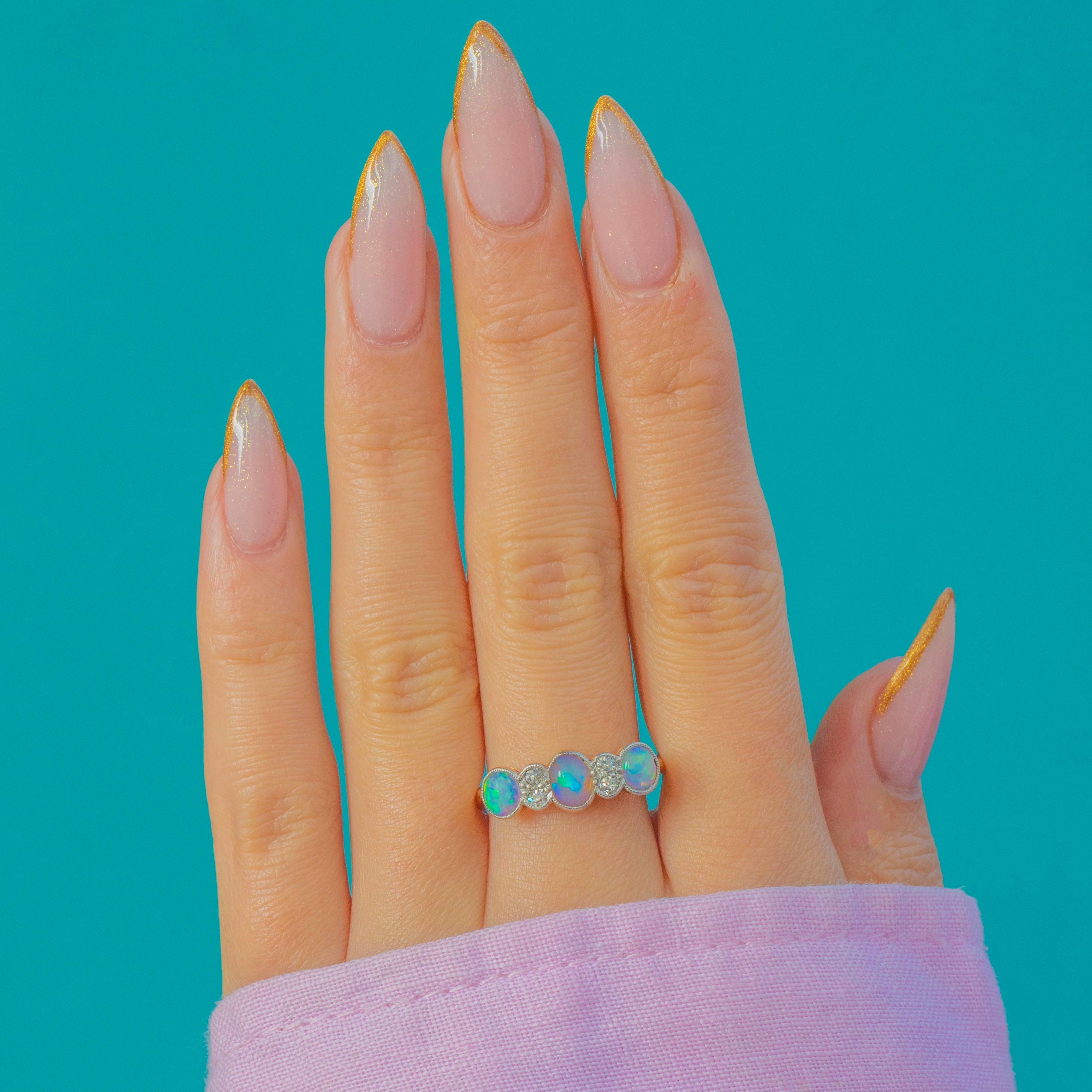 A beautiful Edwardian stacking ring crafted in rich 18ct Yellow Gold with elegant Platinum millegrain settings. This romantic seven-stone design features three natural solid Opal cabochons glowing with fiery pastel flashes, spaced by four bright Old Mine Cut Diamonds for a touch of antique sparkle. Delicate, feminine and wonderfully wearable, it’s a classic early 20th-century look.