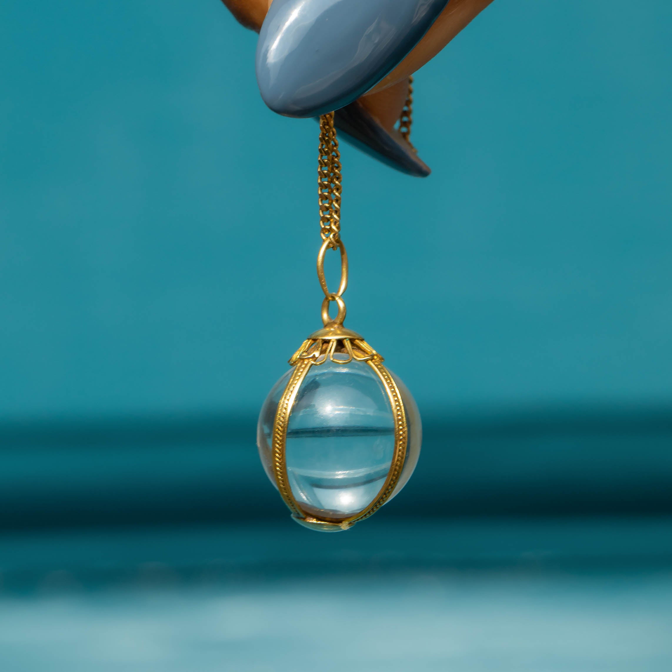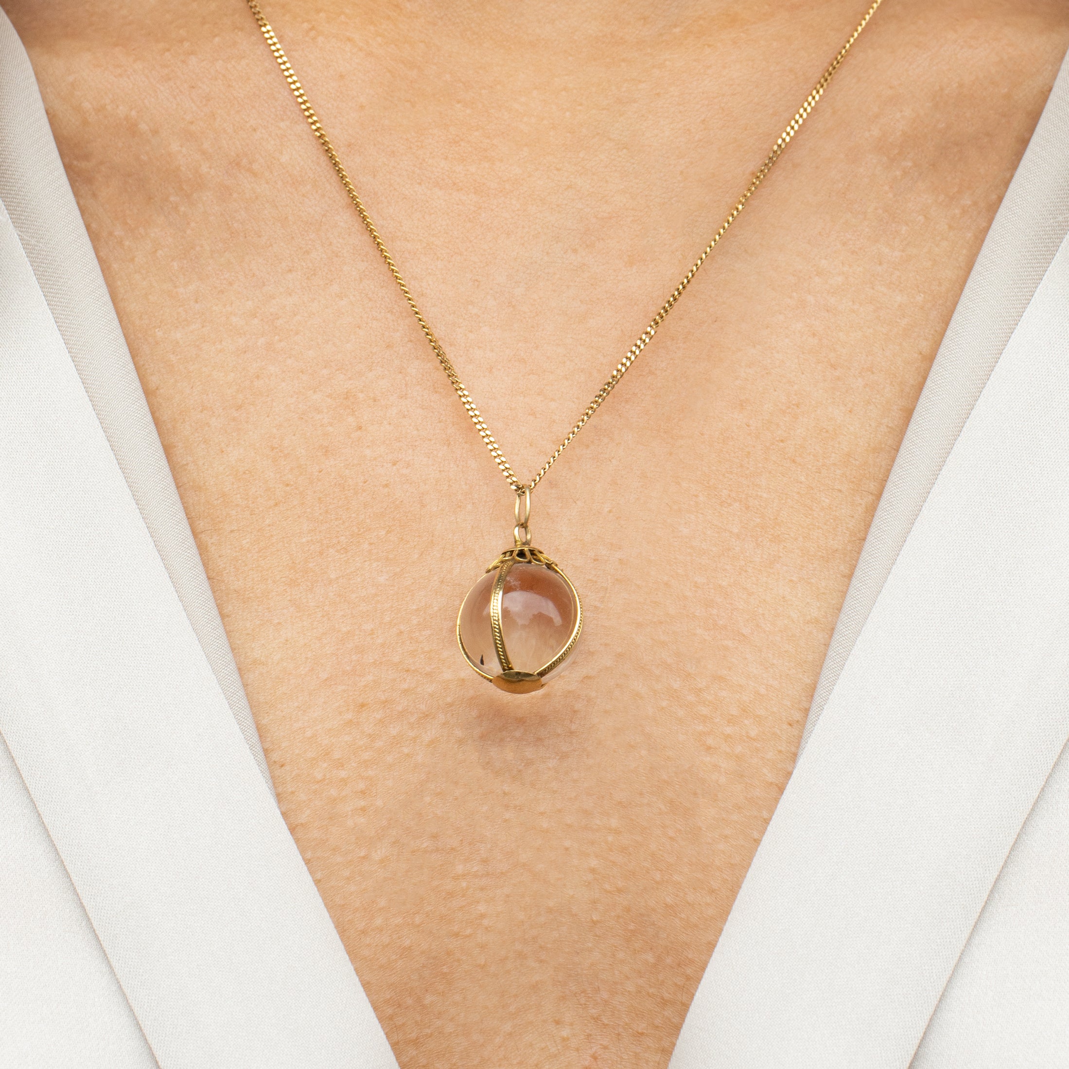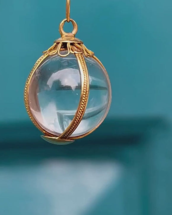 Become absorbed by the beauty of this antique 18ct Gold Rock Crystal pools of light orb pendant! Encased in a buttery 18ct Gold cage is a perfectly spherical Rock Crystal, completely clear and with mesmerising refractive qualities.