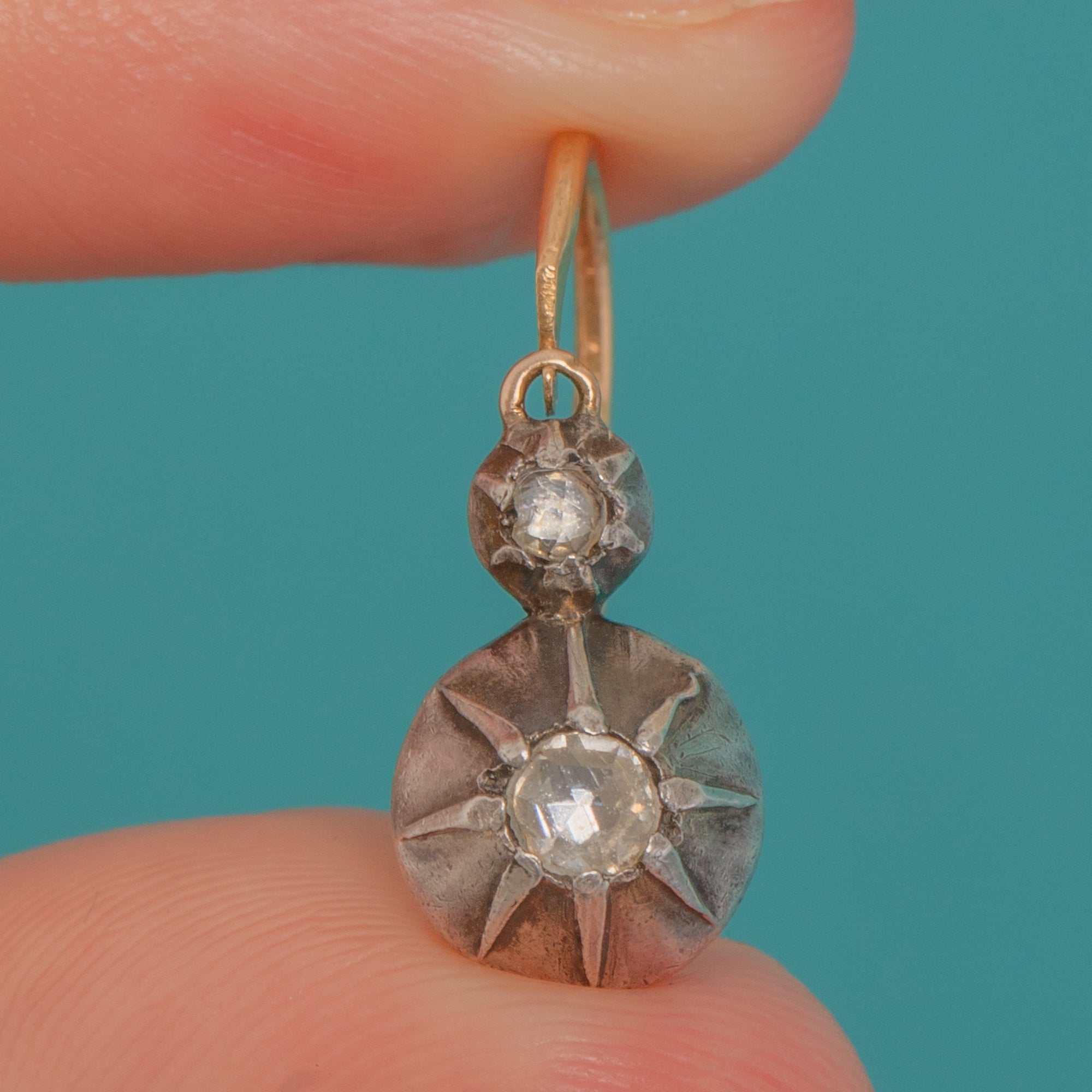 Breathing romance from the Victorian era, these day & night earrings marry luminous Rock Crystal with twinkling Paste (Jargoon) in a beautifully articulated girandole design. The fronts are Silver-set with cut-down collets and starburst-engraved plaques, while the backs and hooks glow with rich 18ct Gold, creating that coveted two-tone allure.