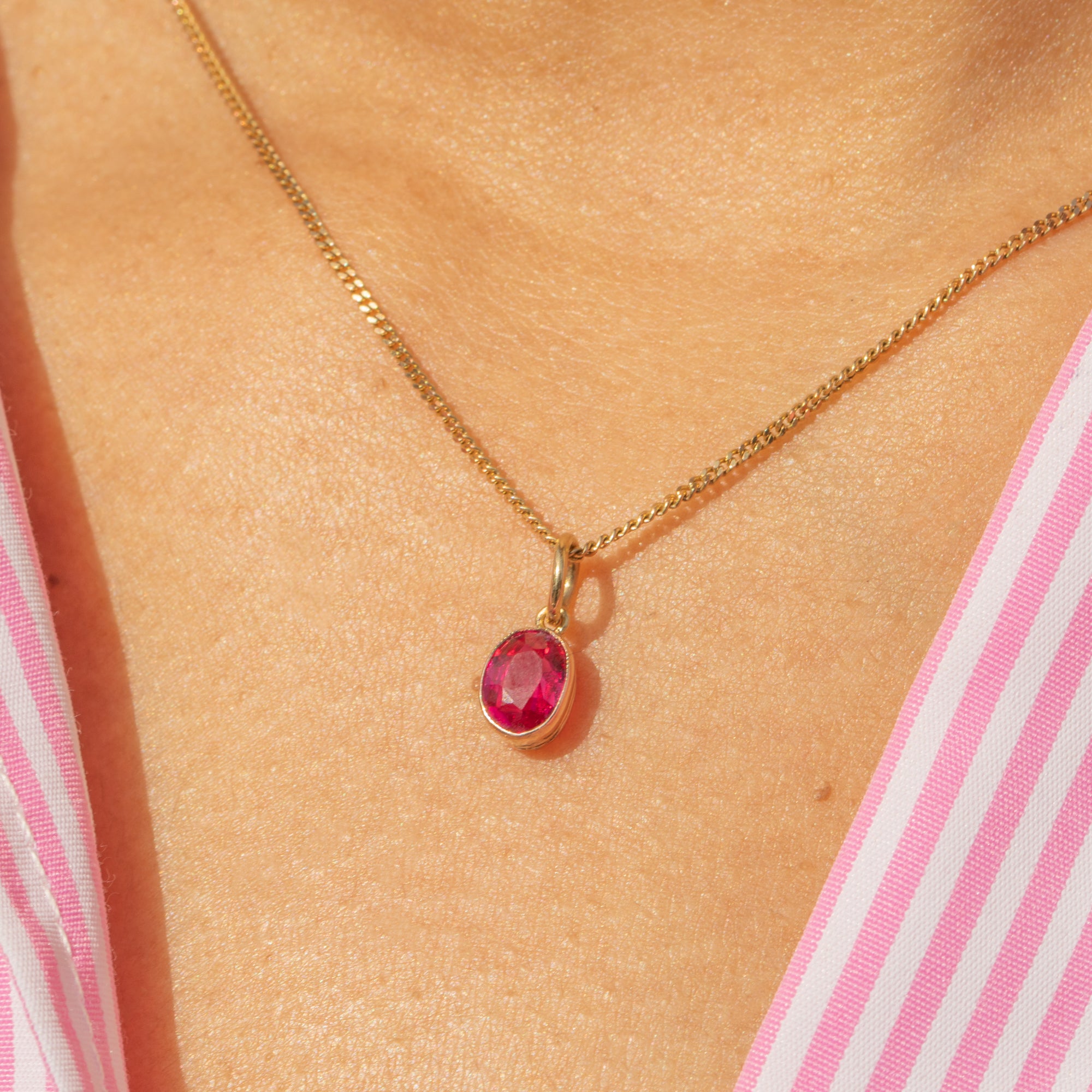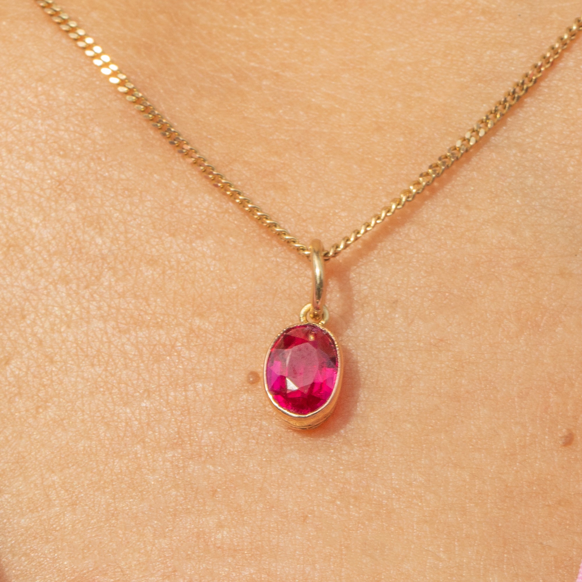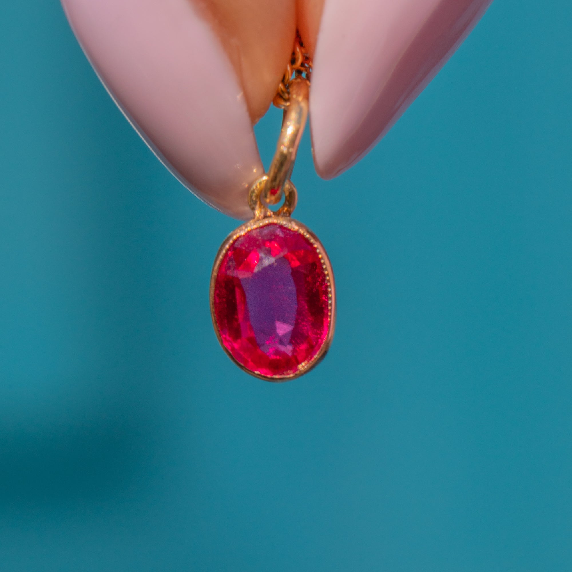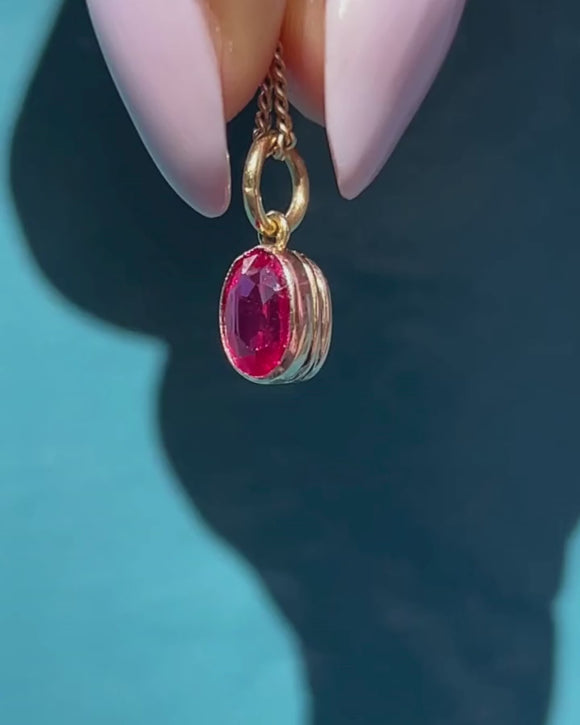 EXCELLENT. This antique 18ct Gold Ruby charm is offered in excellent condition. The Ruby has an intense hot pink hue and is free from chips or abrasions. The 18ct Gold is brightly saturated and the Ruby is securely held within the bezel. Complete with a generously sized jump ring, you can suspend this Victorian Ruby pendant from a chain with ease!