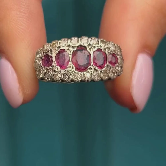We can't get enough of this antique 18ct Gold Ruby Diamond cluster ring! Providing you with ample finger coverage, she is inlaid with a row of natural Rubies flaunting soft magenta hues trickling throughout their graduating size.
