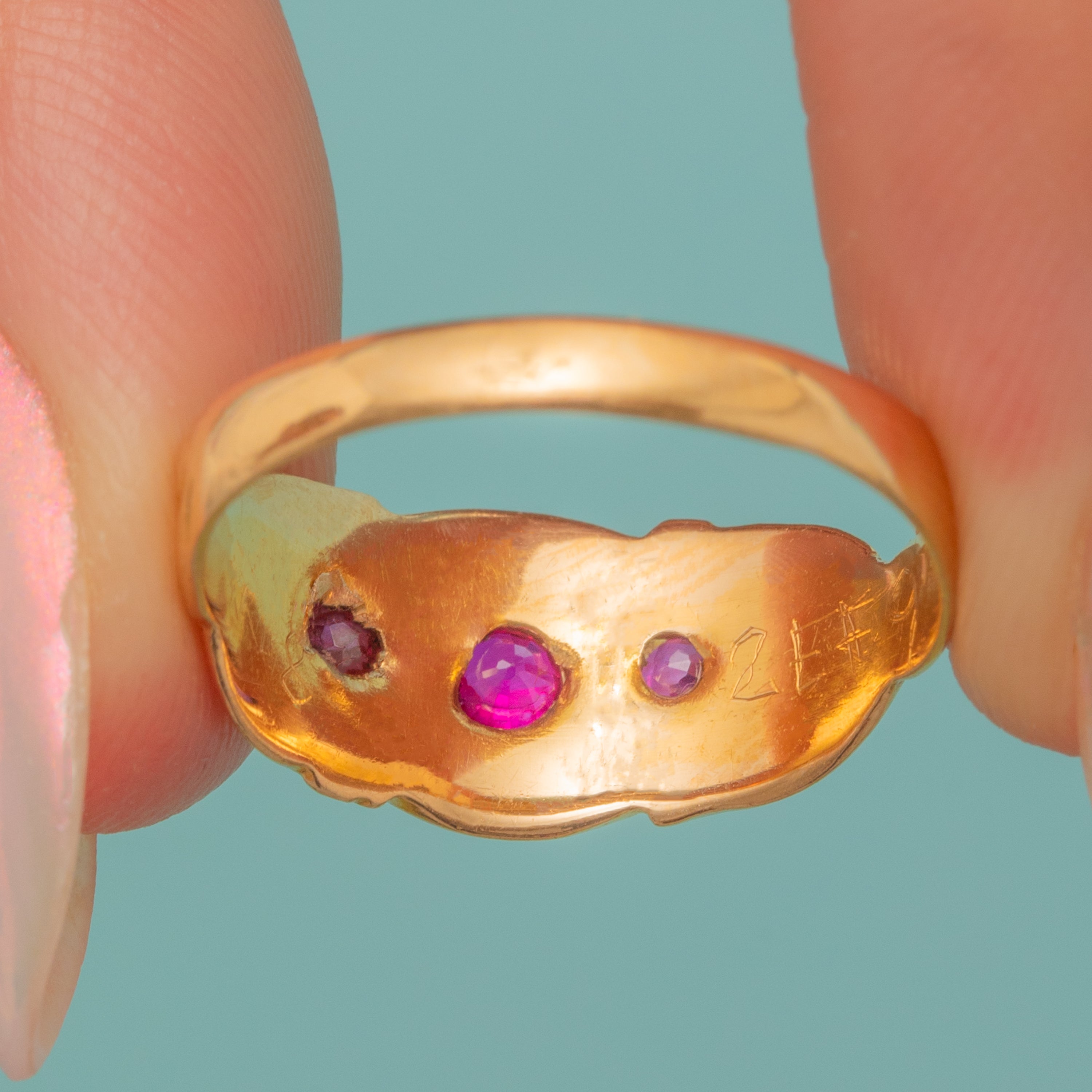 VERY GOOD-EXCELLENT: Each gemstone is radiant and secure in its setting. The Gold is bright and buttery, and the band is sturdy. There are some signs of wear to the ring, including minor dings and some scratches inside the band, which will not be visible while the ring is worn. Fully hallmarked to 1913 and comfortable to wear, this antique ring is a must-have!