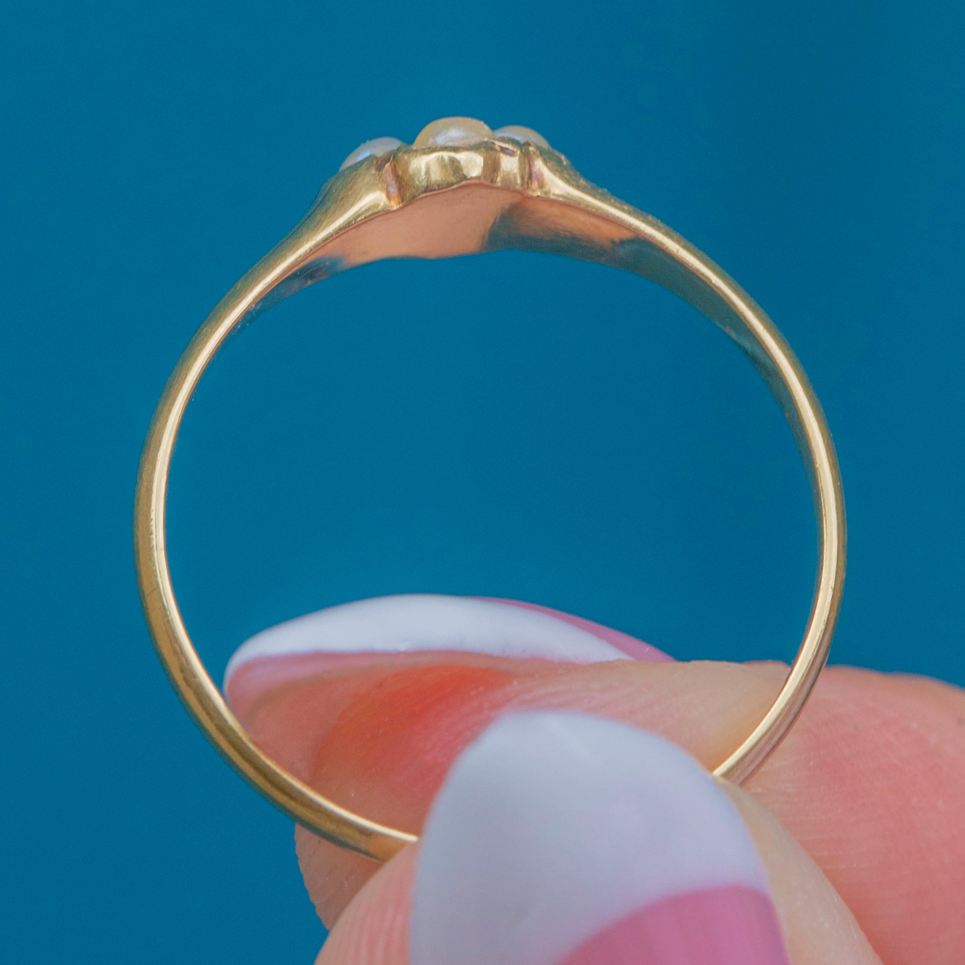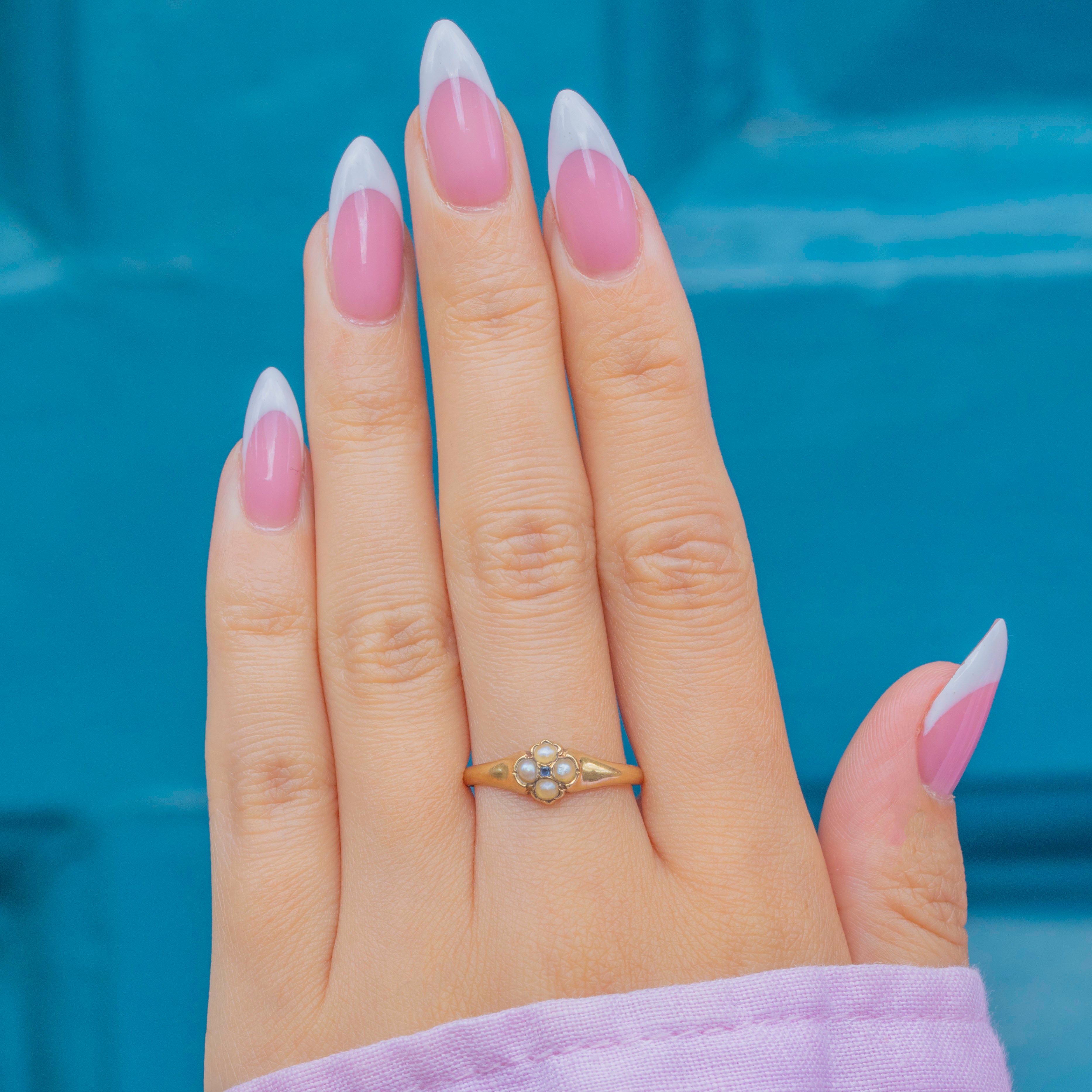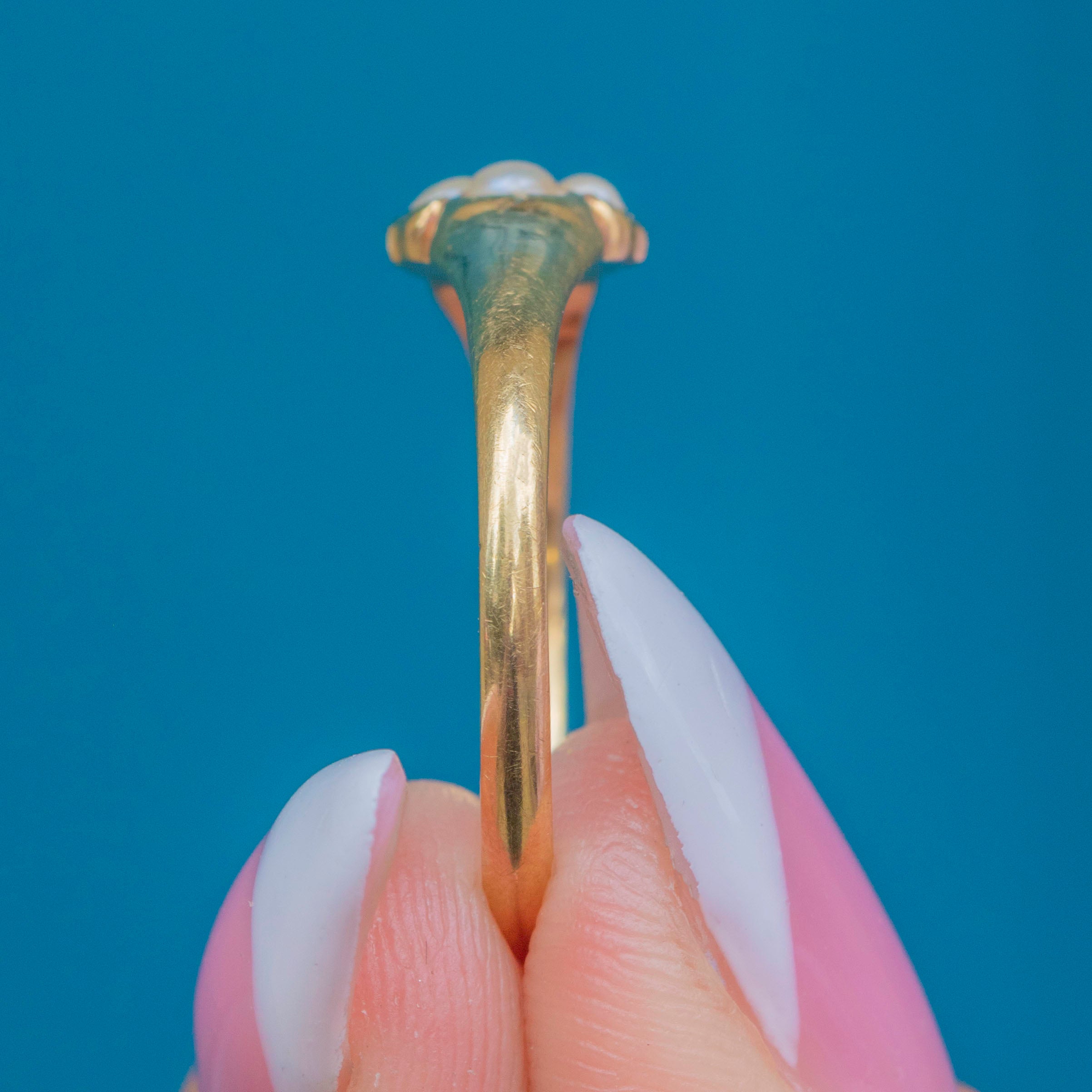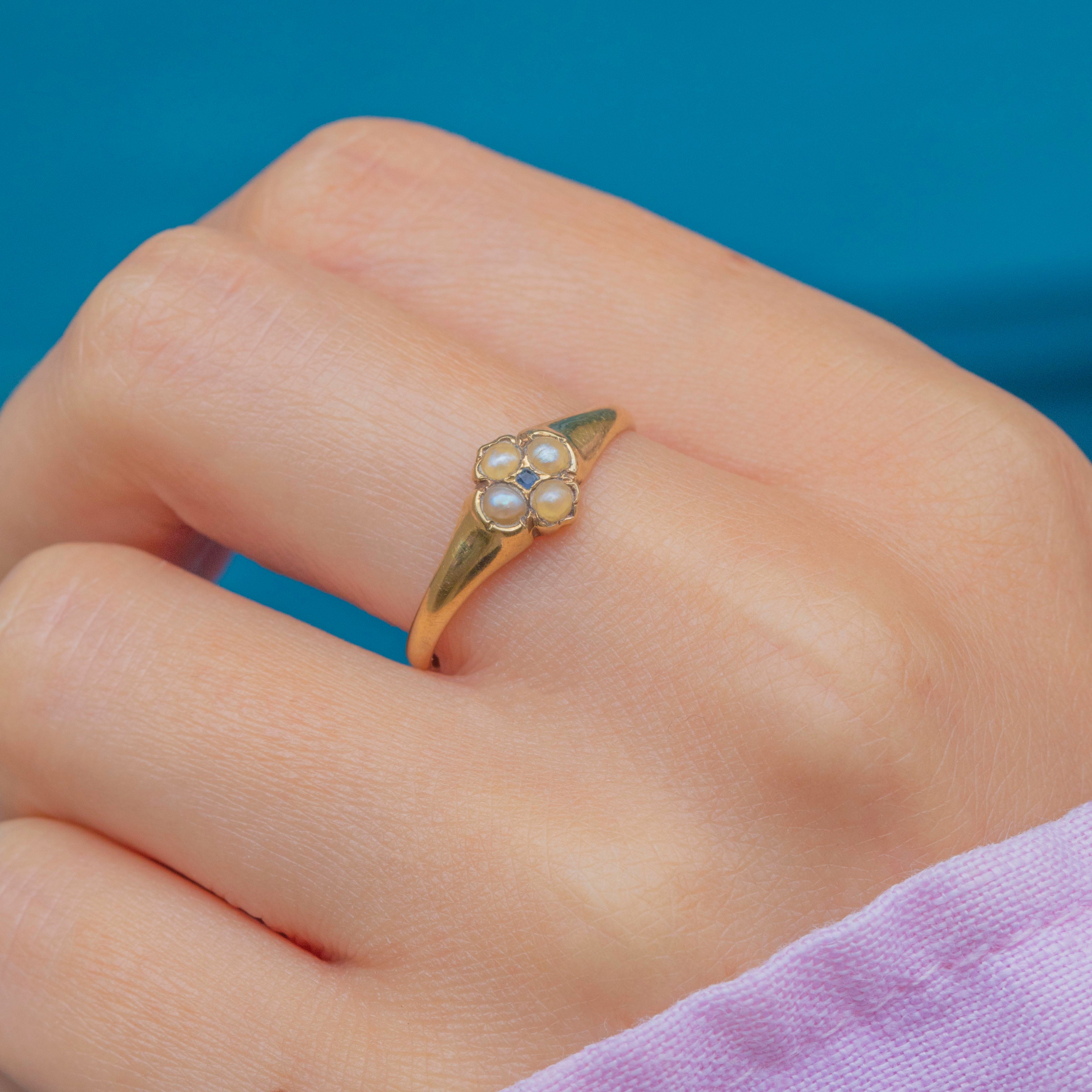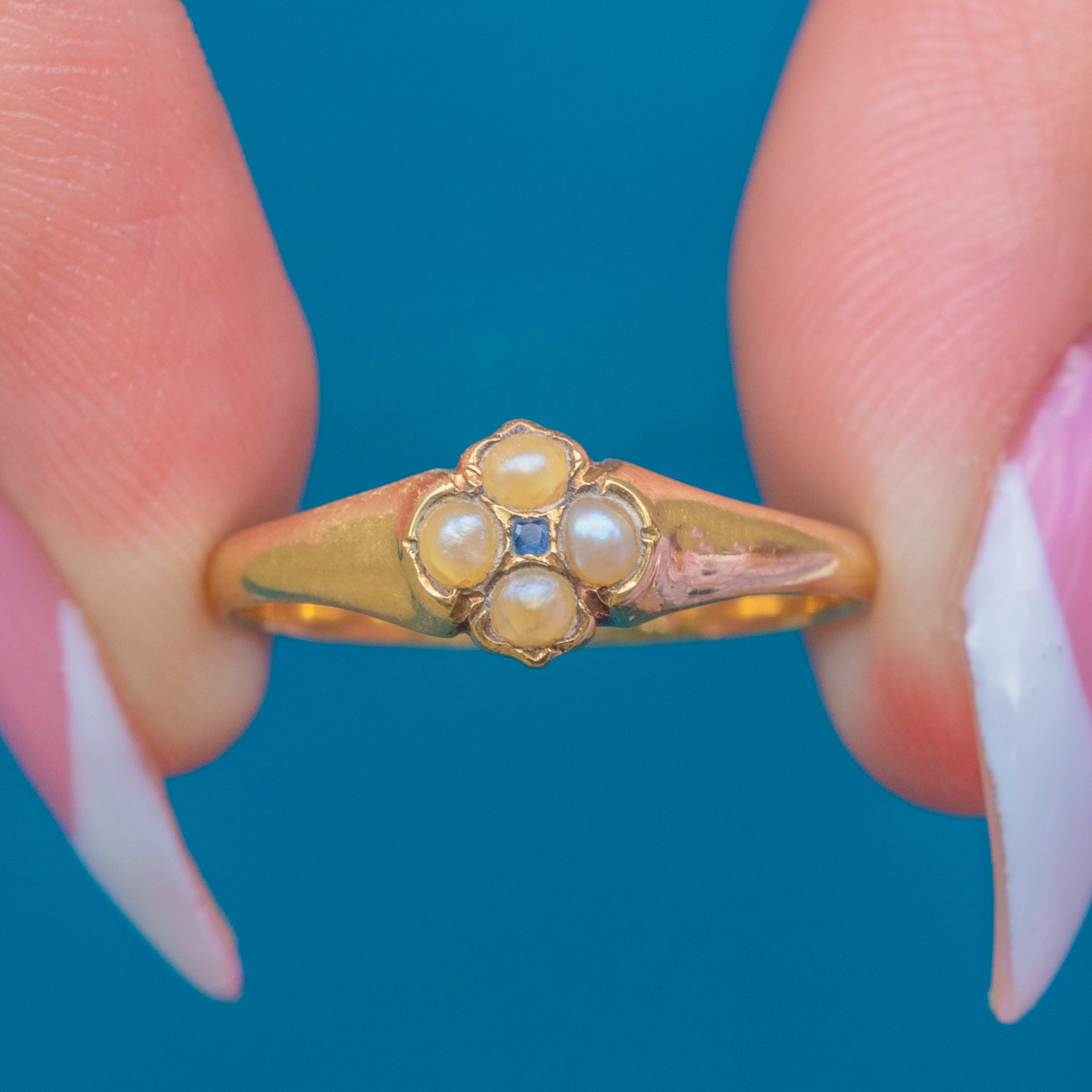 This adorable Victorian ring displays four lustrous Pearls and is centred by a dainty Sapphire, arranged into a delicate floral motif.